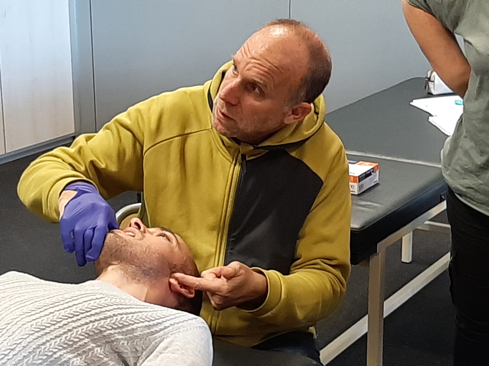 En les 15 hores que va durar el mòdul d’ aquest cap de setmana Leandro Gutman va fer un record anatòmic de l’articulació témporomandibular i va explicar de forma extensa i molt entenedora com funciona biomecànicament i quines són les implicacions que té amb d’altres parts del cos, especialment amb el raquis cervical. D’altra banda, també va fer una primera introducció de les diferents afeccions que poden presentar les estructures implicades. La metodologia docent del curs va permetre que els assistents poguessin intercalar les explicacions magistrals amb l’execució pràctica de les maniobres que el docent anava mostrant