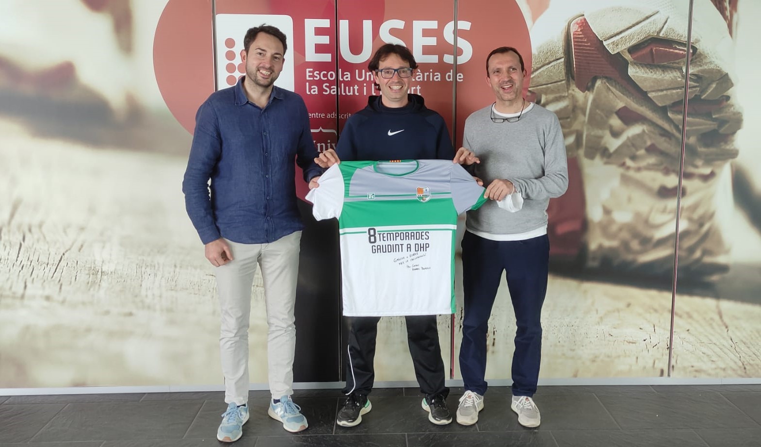 El Club Handbol Bordils, que enguany celebra el seu 60è aniversari, ha volgut fer entrega a l’Escola Universitària de la Salut i l’Esport d’una samarreta commemorativa de l’efemèride (centralitzada en les vuit temporades que va estar l’equip bordilenc a divisió de Plata, entre els cursos 2013/14 i 2020/21) per l’estreta vinculació fa molts anys mantenen les dues entitats. Pau Campos, professor de l’EUSES i tota una institució en el club bordilenc (exjugador i entrenador des del 2001, i durant sis de les vuit temporades que l’equip va estar a la segona màxima categoria de l’handbol estatal) va fer entrega de la samarreta al director del Grau en Ciències de l’Activitat Física i de l’Esport, Adrià Martín, i en els propers dies passarà a formar part de l’àmplia col·lecció que hi ha exposada a l’Aula d’Estudi del Campus de Salt.