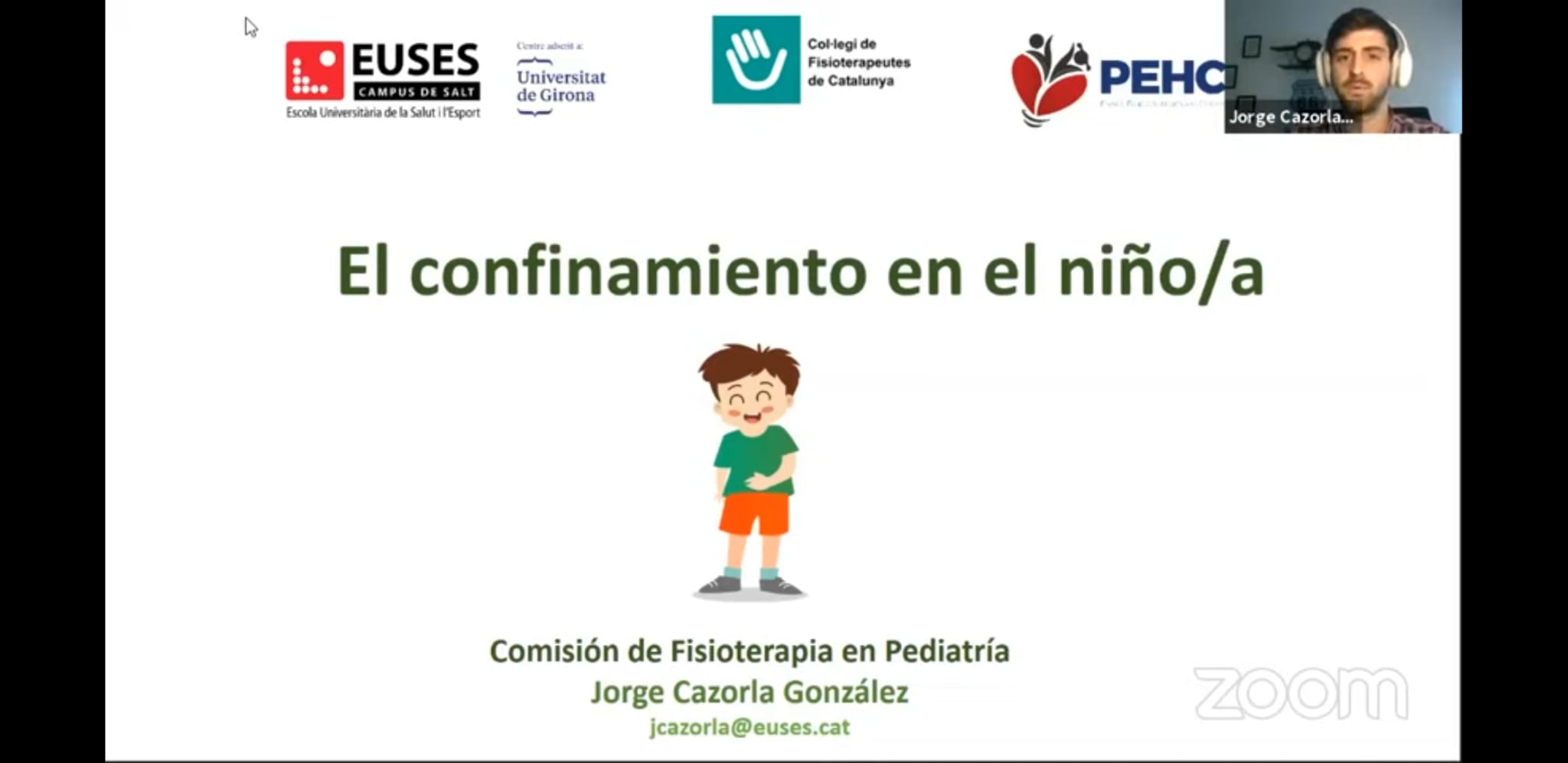 El professor del Grau en Fisioteràpia de l’assignatura de pediatria Jorge Cazorla González, que també és coordinador de la comissió de fisioteràpia en pediatria del Col·legi de Fisioterapeutes de Catalunya, ha realitzat aquesta setmana passada en una comunicació online titulada: “L’impacte confinament en el nen/a’’ i que s’emmarca en les píndoles formatives que ofereix aquest col·legi amb motiu de la pandèmia pel Covid-19.
