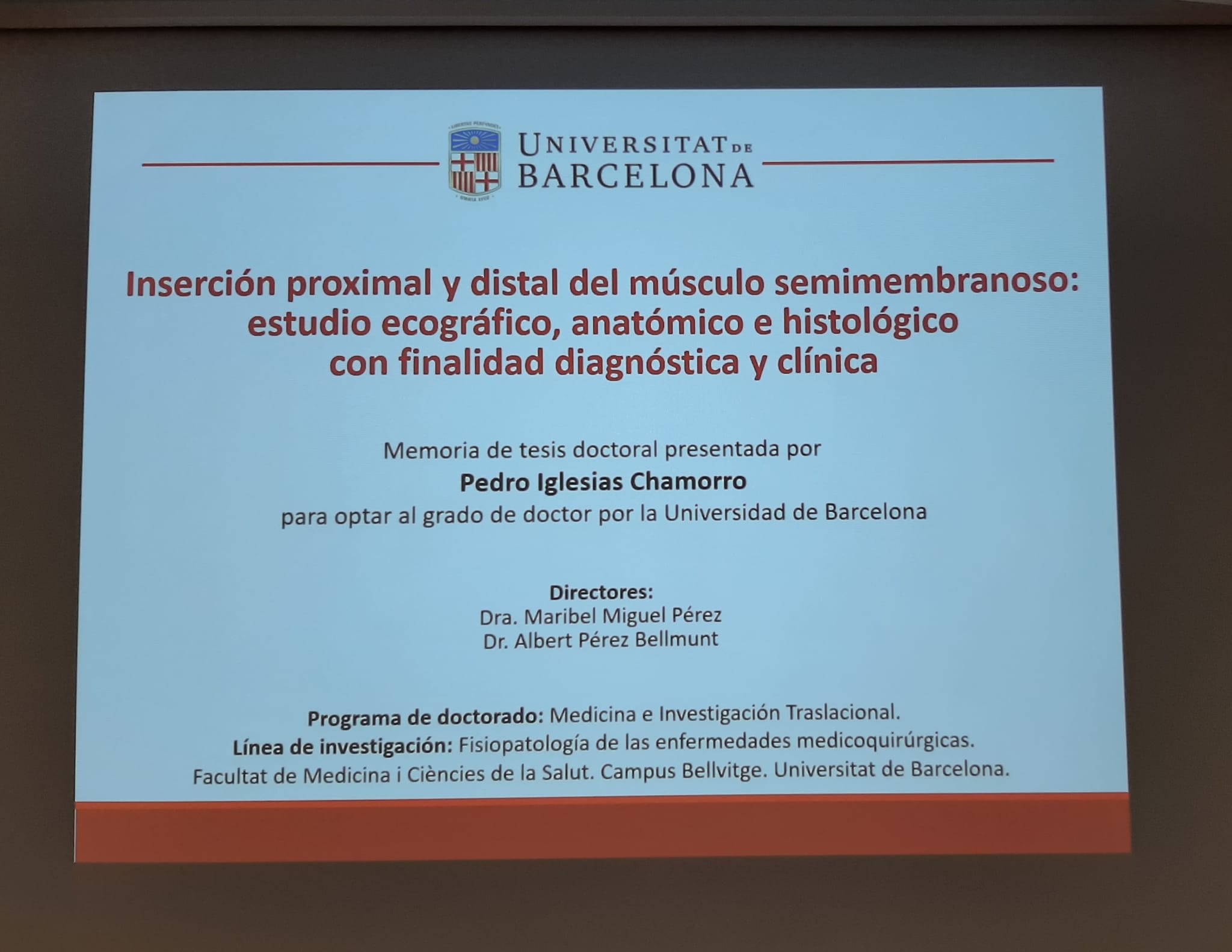 Durant la defensa, Pere Iglesias va fer una extensa introducció de les particularitats anatòmiques i biomecàniques del múscul semimembranós, així com una detallada descripció de quines eren les patologies amb les què se l’associen. A continuació, va desenvolupar el contingut dels estudis ecogràfics, anatòmics i histològics que havia dut a terme per avançar en el coneixement d’aquest múscul i de les seves insercions, els resultats dels quals van ser publicats en dos articles de revistes mèdiques internacionals de primer nivell.