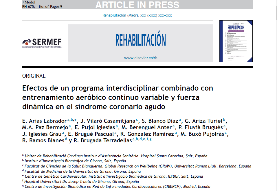 El professor Eloi Arias, que a l’EUSES imparteix les assignatures del Grau en Ciències de l’Activitat Física i de l’Esport de Prescripció de l’Exercici Físic per a la Salut (3r) i Cor i Activitat Física (4t) i l’exalumne de CAFE Guillem Ariza han participat en un estudi sobre els “Efectes d’un programa interdisciplinar combinat amb entrenament aeròbic continu variable i força dinàmica en la síndrome coronària aguda” que s’ha publicat en la revista de la Societat Espanyola de Rehabilitació i Medicina Física (SERMEF) .