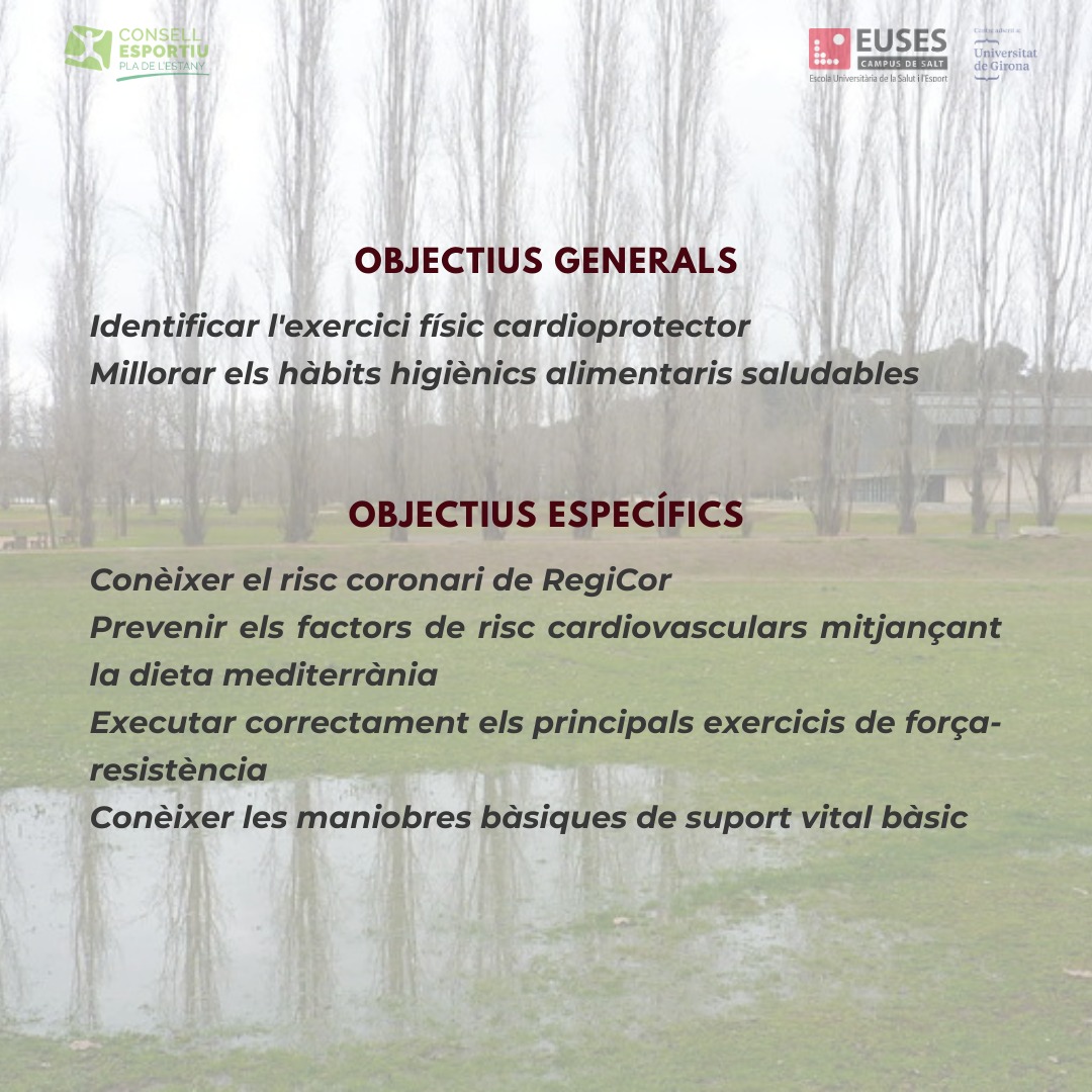 Els estudiants de 4t curs del Grau en Ciències de l’Activitat Física i de l’Esport, conjuntament amb el Consell Esportiu del Pla de l’Estany, han organitzat una gimcana cardiosaludable-EDUCOR en el Parc de la Draga de Banyoles que s’havia de realitzar aquest dilluns dia 12 d’abril però que finalment s’ha posposat una setmana a causa de la climatologia i se celebrarà el dia 19. L’activitat compta amb una seixantena d’inscrits i està emmarcada dins l’assignatura de “Cor i Activitat Física” que imparteix el professor Eloi Arias.