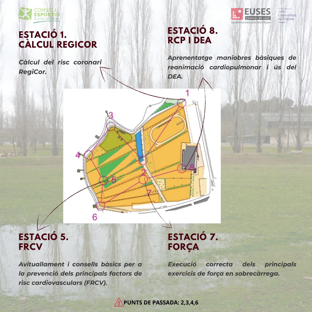 Aquesta gimcana, que començarà sobre les 9 del matí i està previst que s’allargui fins més enllà de la 1 del migdia, té com a objectiu identificar l’exercici físic cardioprotector i millorar els hàbits higiènics alimentaris saludables. La gimcana constarà de 8 estacions que estaran repartides al llarg d’1 kilòmetre dins el parc de la Draga. Hi haurà quatre estacions de passada (2,3,4,6) i quatre estacions (1,5,7,8) en les quals es realitzaran diferents activitats sensibilitzadores que són les següents: