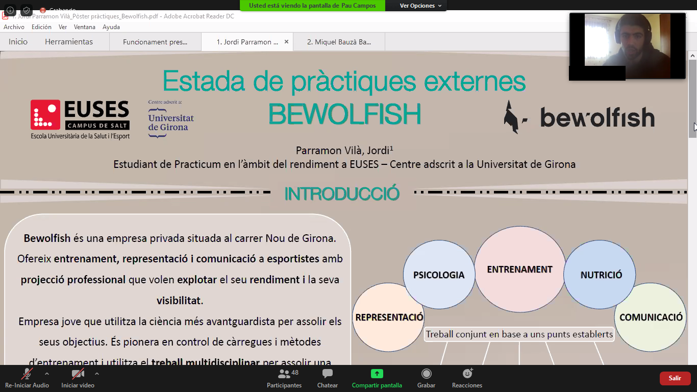 Les presentacions s’han desenvolupat en format online davant d’un tribunal format per dos professors,  segons l’àmbit de cada centre de pràctiques. S’han presentat un total de 82 pòsters: 21 presentacions sobre gestió; 14 de l’àmbit de la salut; 24 de rendiment; i 23 d’educació. L’acte ha servit també per apropar a l’alumnat de 3r de CAFE el ventall de centres de pràctiques que EUSES ofereix als estudiants de 4t per realitzar les pràctiques curriculars del grau.