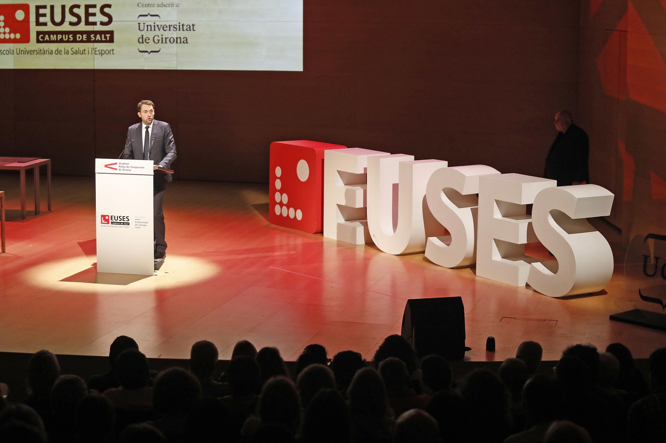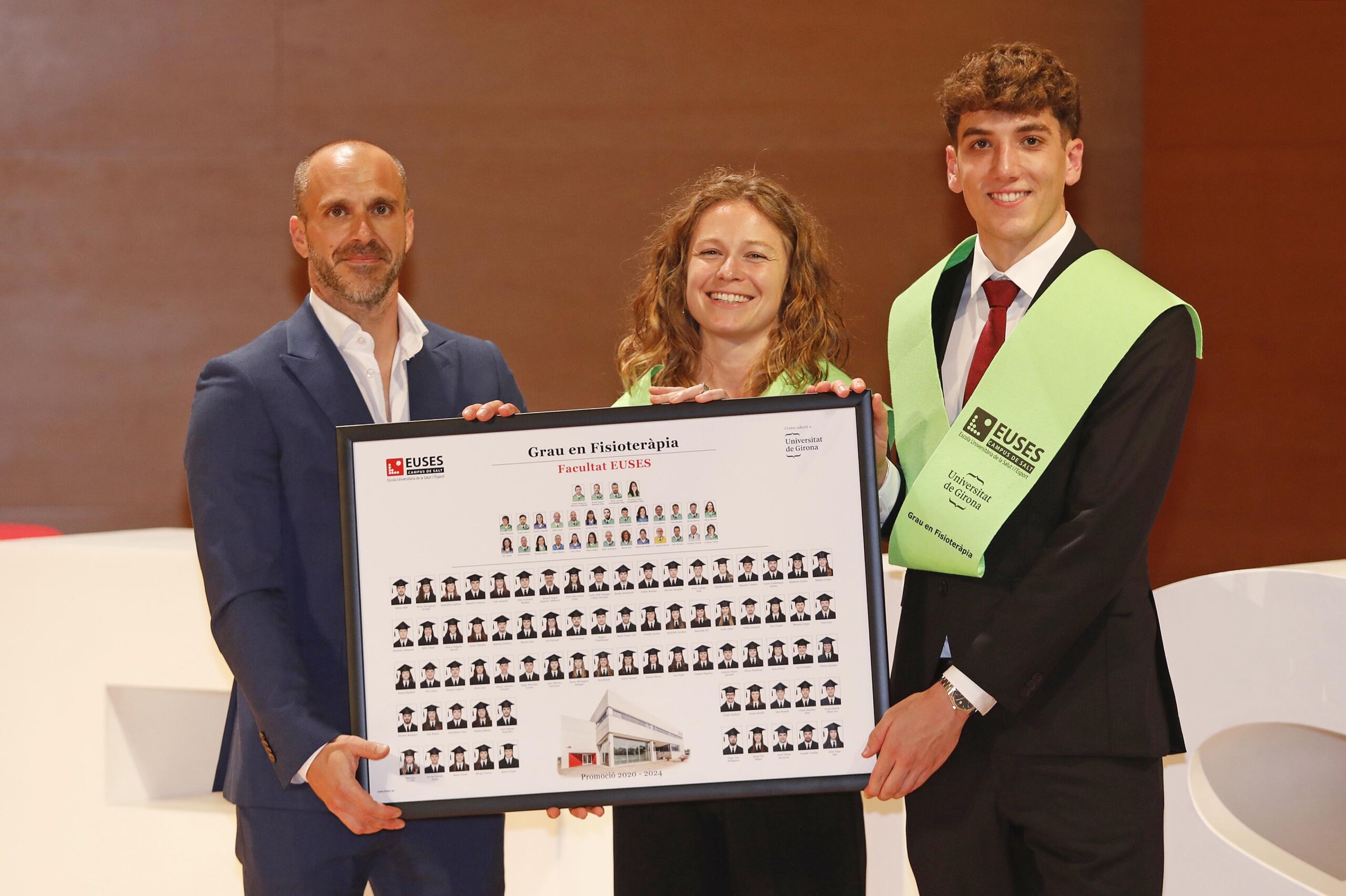 This Thursday, the Girona Auditorium was once again filled to capacity for the solemn Graduation Ceremony of the 2020/2024 graduating classes of the degrees in Physiotherapy, Physical Activity and Sport Sciences and the Double Degree (CAFyD + Physiotherapy) of the Escola Universitària de la Salut i l’Esport of the Salt Campus. The ceremony, presented by journalist Jordi Grau, was presided over by Jordi Viñas (Mayor of Salt), Dr. Pepus Daunis (Vice-rector of Quality and Transparency of the UdG), Rafel Magrinyà (academic director of EUSES UdG); Dr. Ernest Esteve (director of the Degree in Physiotherapy) and Adrià Martín (director of the Degree in CAFyD).