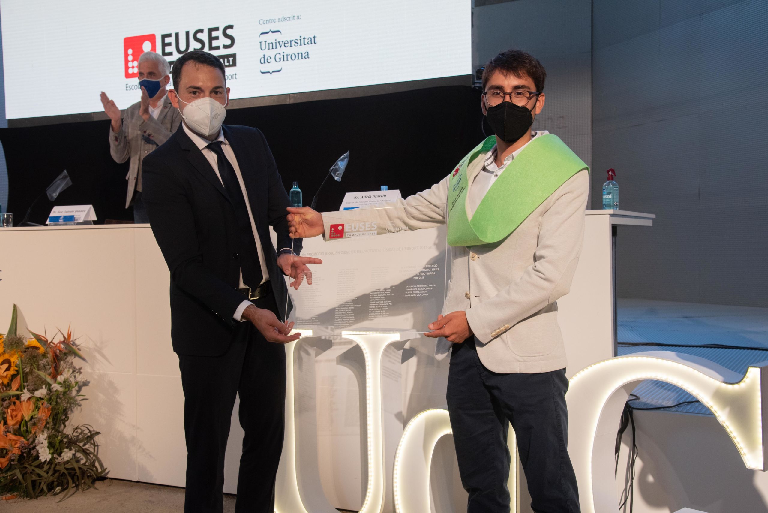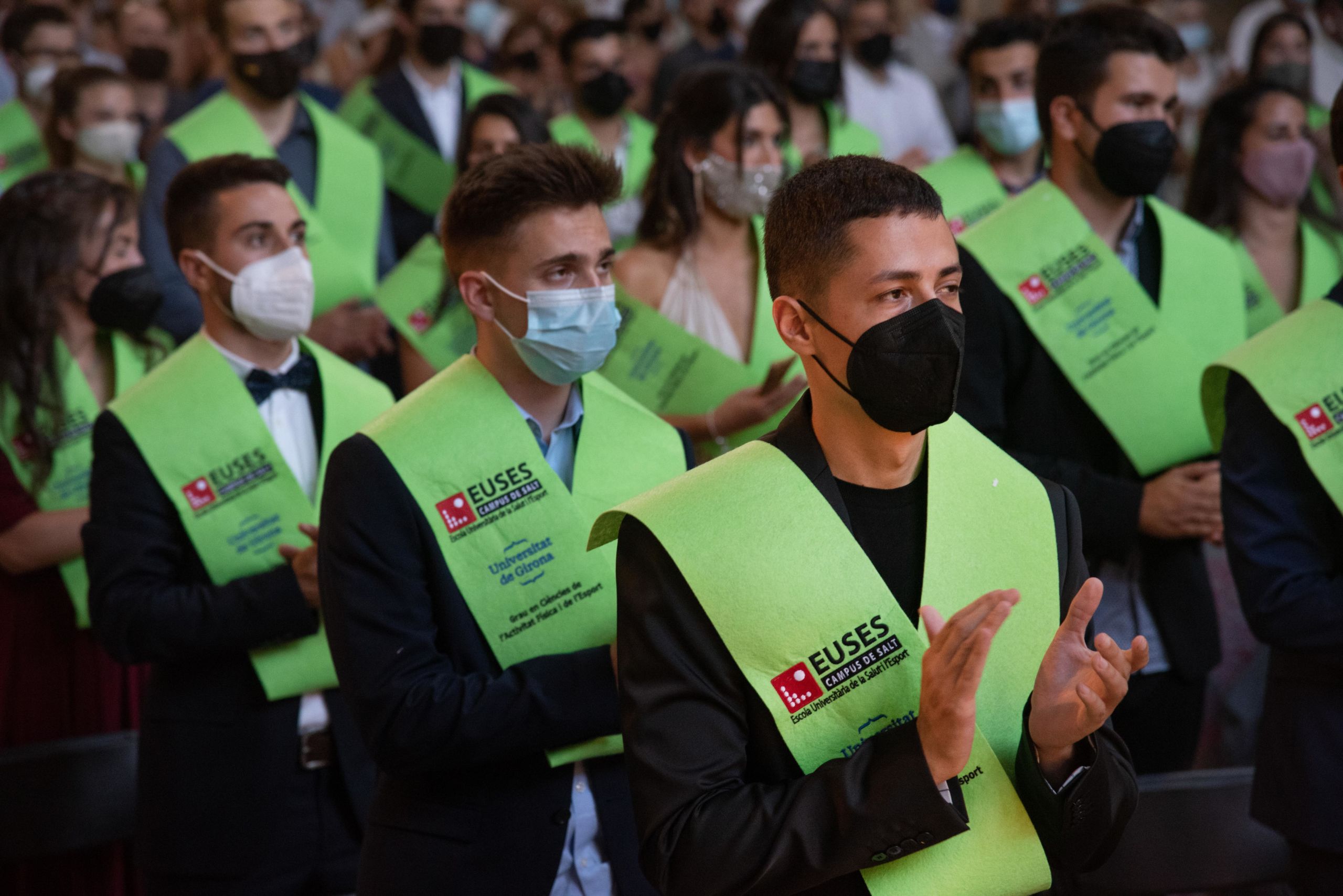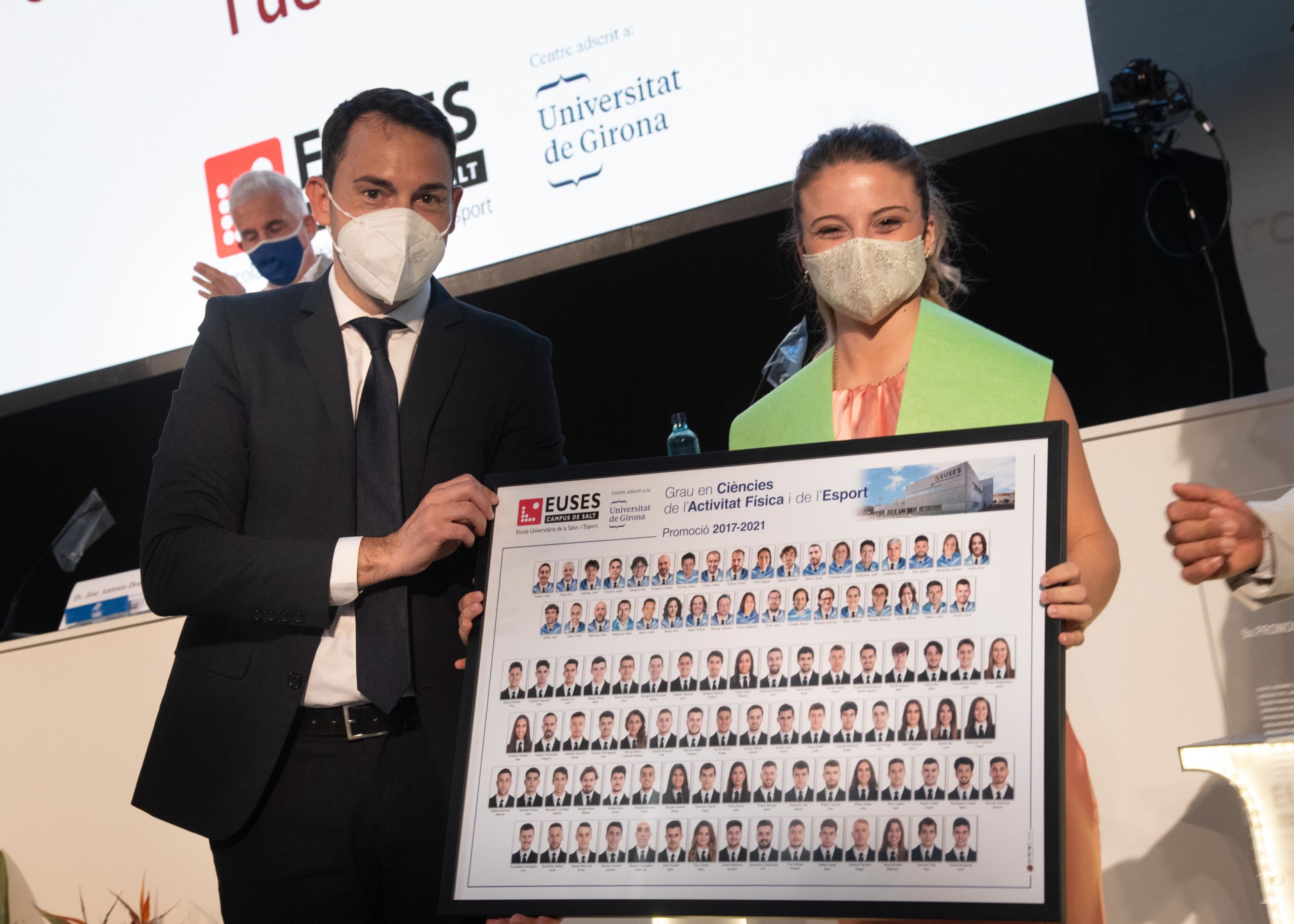 El Aula Magna Modest Prats de la Universitat de Girona ha sido este martes el escenario del acto de graduación de la promoción 2017/2021 del Grado en Ciencias de la Actividad Física y del Deporte de EUSES, en el cual han participado 57 alumnos que han completado el ciclo de cuatro años en la Escola Universitària de la Salut i l’Esport y ya tienen la titulación y la preparación para adentrarse en el mundo laboral y profesional. El Dr. Juan Antonio Donaire (Vicerector de Comunicación y Relaciones Exteriores de la UdG), el Sr. Rafel Magrinyà (Director Académico de EUSES-UdG) y el Sr. Adrià Martín (Director del Grado en Ciencias de la Actividad Física y del Deporte) han formado la mesa presidencial y se han dirigido a los nuevos graduados antes de hacer entrega de los correspondientes diplomas. Posteriormente ha sido el turno de la Sra. Sara Soy y del Sr. Robert Calderón, los cuales han hablado en representación de los alumnos. Después de la entrega de las placas y las orlas, el Dr. José Antonio Donaire ha cerrado el acto que ha tenido como punto y final la actuación musical Gaudeamus Igitur.