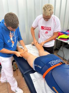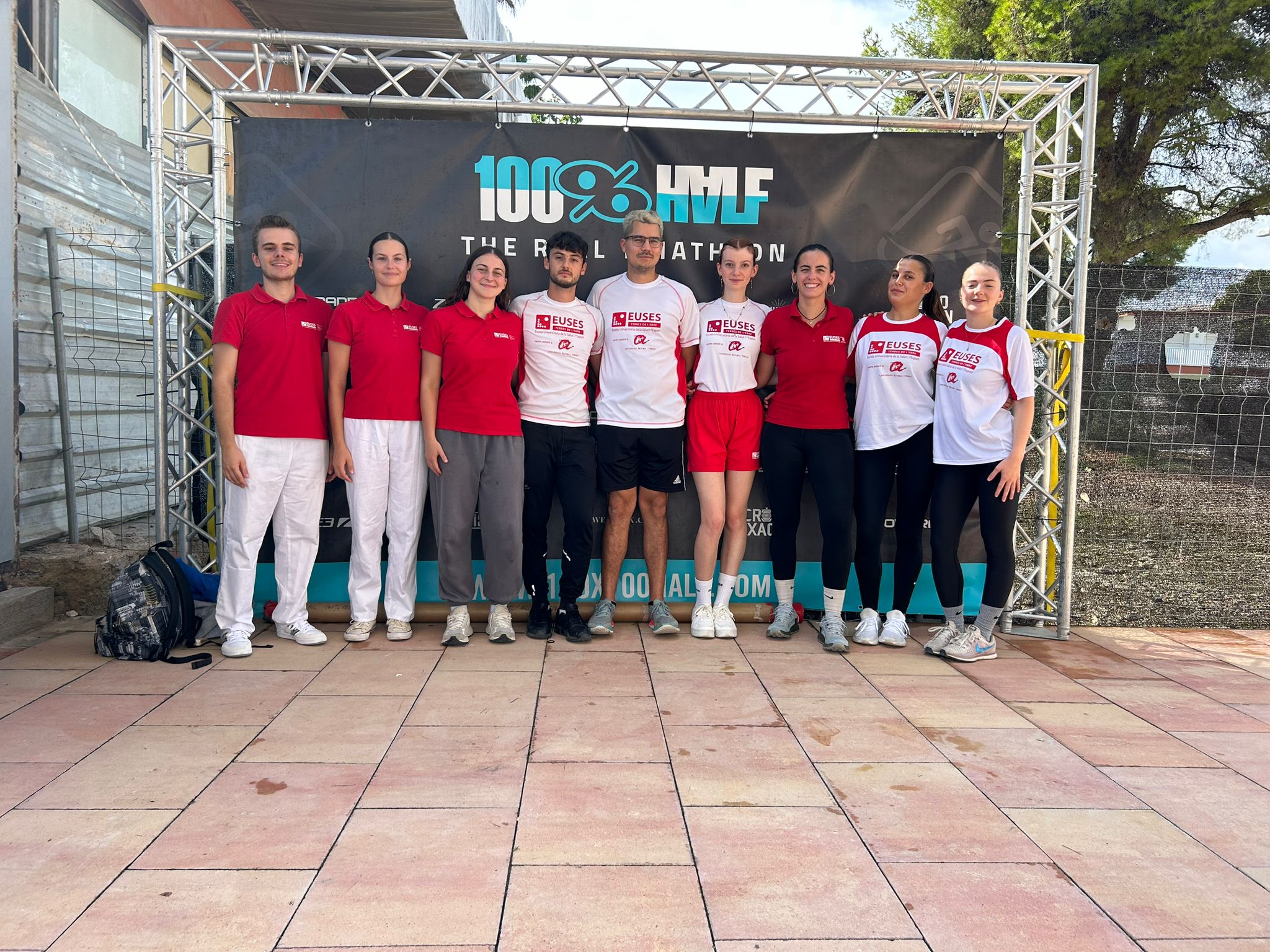 Este domingo se ha celebrado el 100×100 Half el Vendrell, un Triatlón en el cual los participantes podían escoger entre diferentes distancias (Sprint, Olympic, Half, Short, Aquabike L y Aquabike M) y en el cual EUSES ha colaborado con estudiantes del Grado en Fisioterapia tanto del campus de Terres de l’Ebre como del Campus de Salt. Bajo la supervisión de la fisioterapeuta de EUSES Alumni Aimee Guinovart, los estudiantes que se han concentrado en una zona habilitada para la recuperación de los deportistas han sido Maxime Blaise, Alexis Boilot, Justine Marty, Camille Soula y Clarisse Mira (Terres de l’Ebre) y  Matthis Carrère, Julie Lafon y Anaïs Tulloue (Salt). Allí han realizado masajes y estiramientos para acelerar la recuperación muscular de los participantes que así lo han deseado.