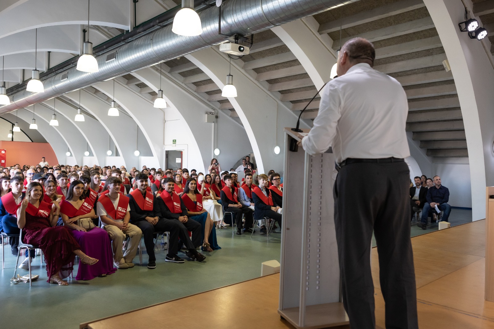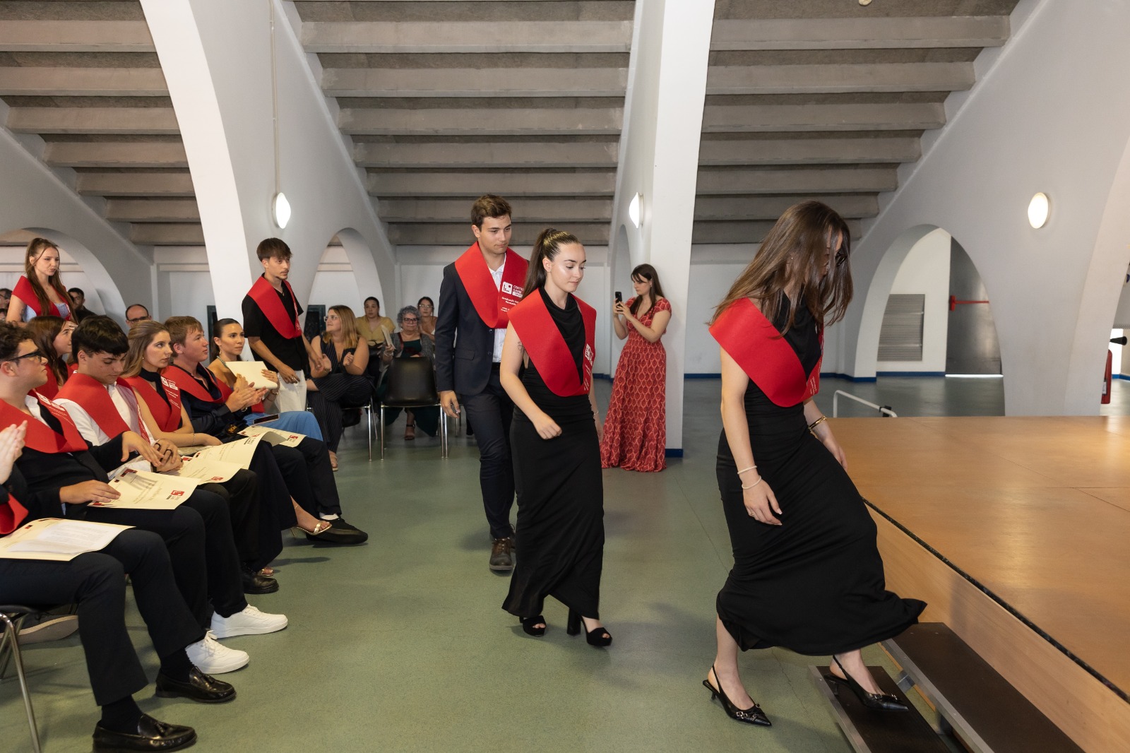 El acto, que se desarrolló con mucha agilidad, continuó con los parlamentos de Sílvia Roche y de José Manuel Lafuente antes de llegar a uno de los momentos más esperados, que fue la entrega de diplomas a los nuevos graduados. Seguidamente, diferentes representantes de los alumnos tuvieron palabras de elogio y de agradecimiento hacia el profesorado y familiares. Después fue el turno de los coordinadores académicos de los alumnos, Joaquim Llorella, Joan Baños y Roc Martos. Todos los discursos sin excepción estuvieron llenos de emotividad y alabanzas al esfuerzo realizado por los nuevos graduados tras dos años de formación en el Campus de Salt. El punto final al acto fue a cargo del representante del Ayuntamiento de Salt Antoni Vidal y la guinda del pastel la puso la actuación musical por parte de todos los presentes del Gaudeamus Igitur.
