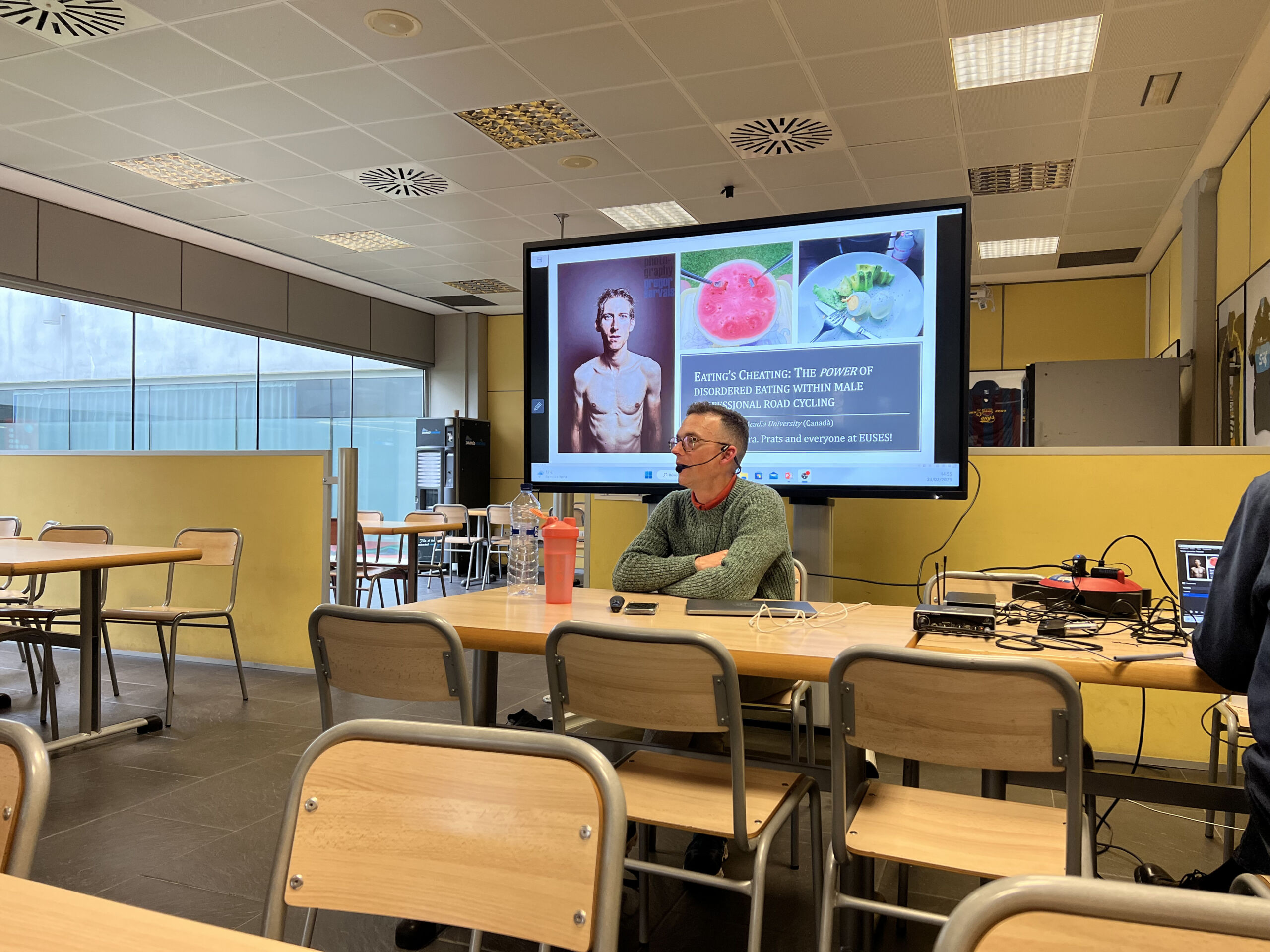 Este jueves se ha celebrado la 18ª edición de las ponencias del ciclo “Ciència a la Taula”. La conferencia, titulada «Eating’s Cheating: The power of disordered eating within male profesional road cycling» ha ido a cargo del Dr. James Brittain, profesor e investigador miembro del Departamento de Sociología de la Universidad de Acadia (Canadá). La charla abordó los problemas alimentarios que sufren muchos ciclistas profesionales que, presionados por el entorno, tienden a desarrollar conductas poco saludables con el objetivo de mejorar la relación potencia/peso (watts/kg). Actualmente, el Dr. Brittain se encuentra realizando una estancia de dos meses en tierras gerundenses con el objetivo de recoger datos para su investigación en ciclistas profesionales.