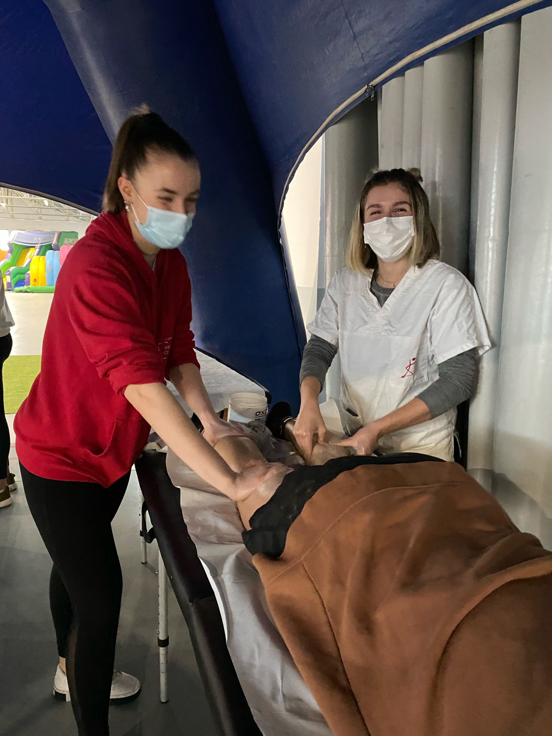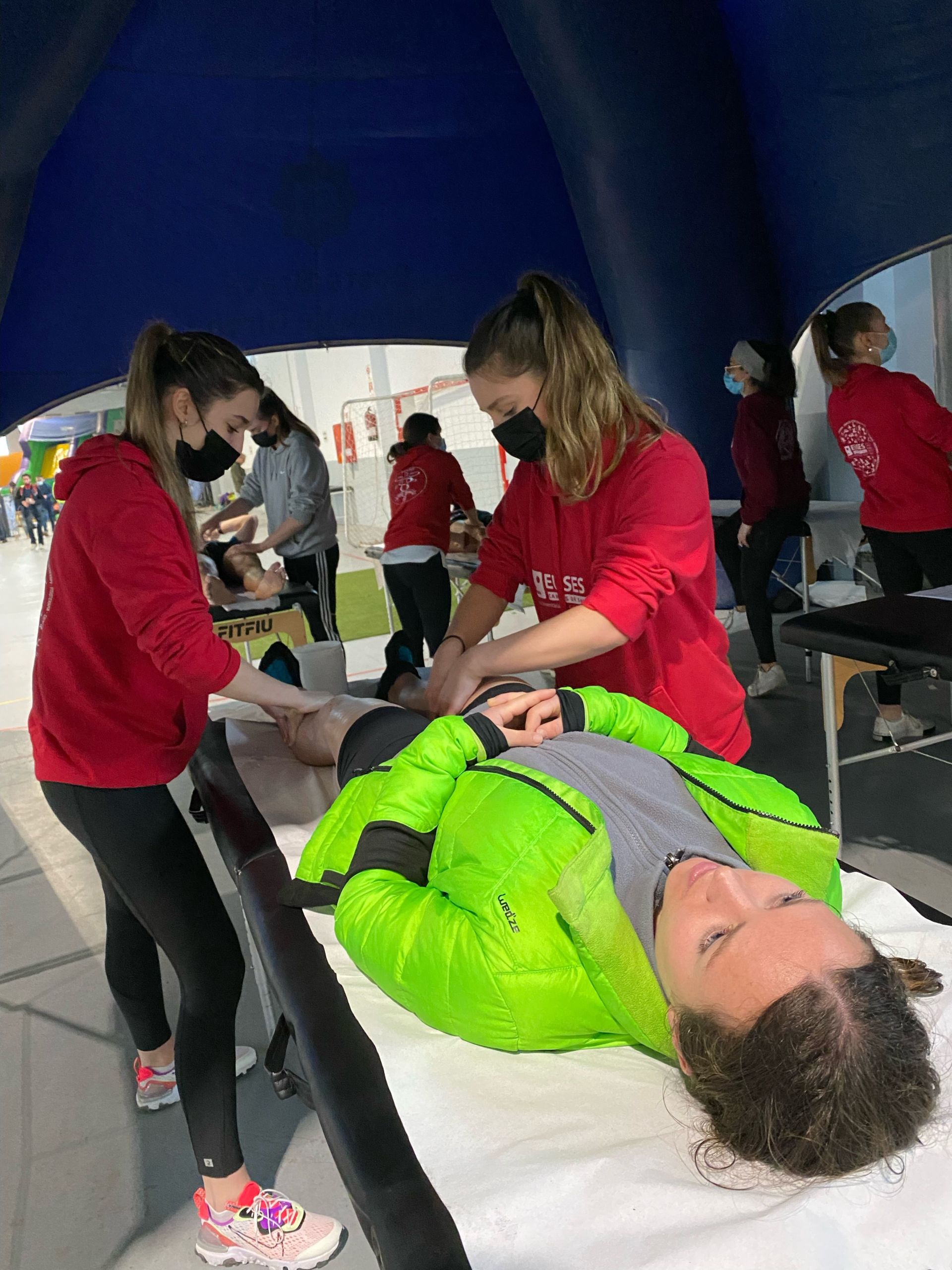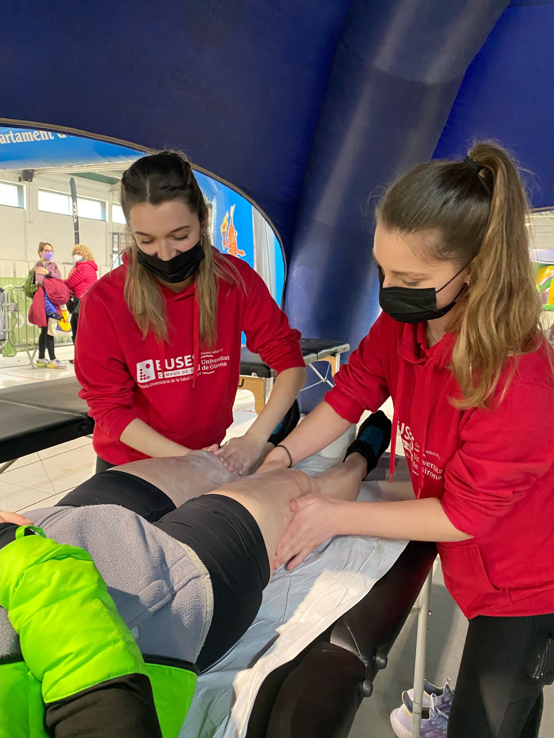 La Escola Universitària de la Salut i l’Esport ha puesto su grano de arena en una nueva edición del Trail Costa Brava con la presencia de estudiantes del Grado en Fisioterapia que han recuperado a  los participantes de una prueba que este año ha estado especialmente dura por las inclemencias metereológicas. Bajo la supervisión del fisioterapeuta de EUSES Alumni Jonathan Duran, los alumnos Louise Bastard, Juliette Caro, Ámbar Marty, Lise Messegue, Dalys Calvet, Valentine Veziand, Célia Benmouffok, Héloise Charpentier y Marion Chabanis han realizado técnicas de recuperación muscular (básicamente masajes y estiramientos) en una zona convenientemente habilitada en la llegada. Los deportistas pudieron escoger entre tres recorridos: el Marathon (42 kilómetros y 2.000 metros de desnivel positivo), el Trail (22 kilómetros y 700 metros de desnivel) y el Express (13 kilómetros y 300 metros de desnivel).