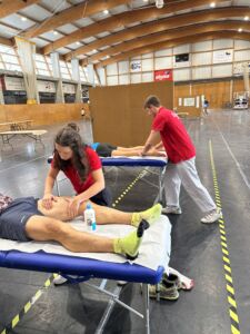 Bajo la supervisión del fisioterapeuta de EUSES Alumni Quim Aspar, estudiantes del Campus de Salt participaron en el voluntariado académico de la carrera de montaña Besalú Cross, que este año ha llegado a la novena edición. La organización diseñó un recorrido largo de 20 kilómetros y uno de más corto de 13 kilómetros. En la zona de llegada, se habilitó un servicio de fisioterapia donde los alumnos Lola Pradat y Bastien Crosnier realizaron masajes y estiramientos para acelerar la recuperación muscular de los participantes que así lo desearon.