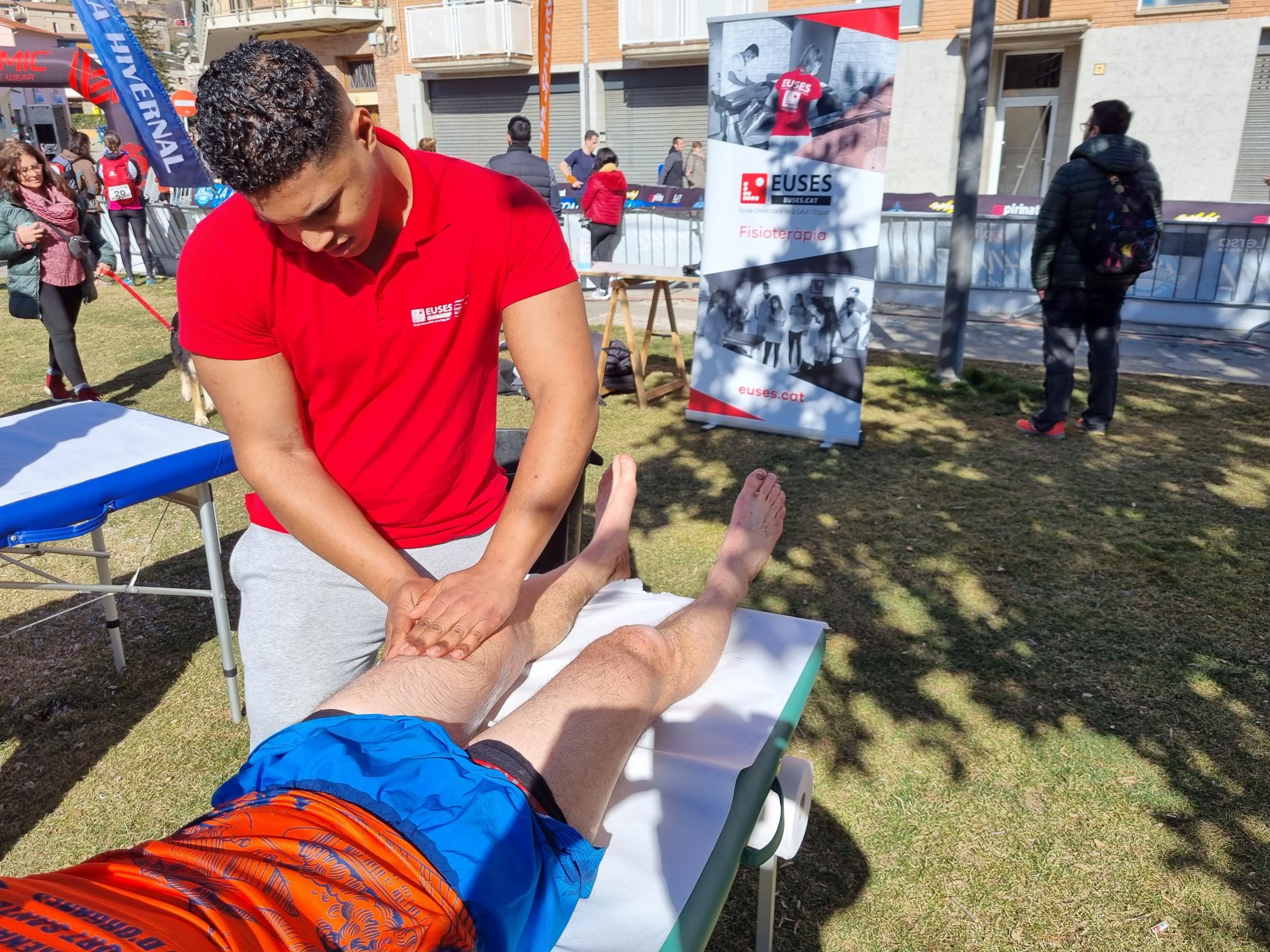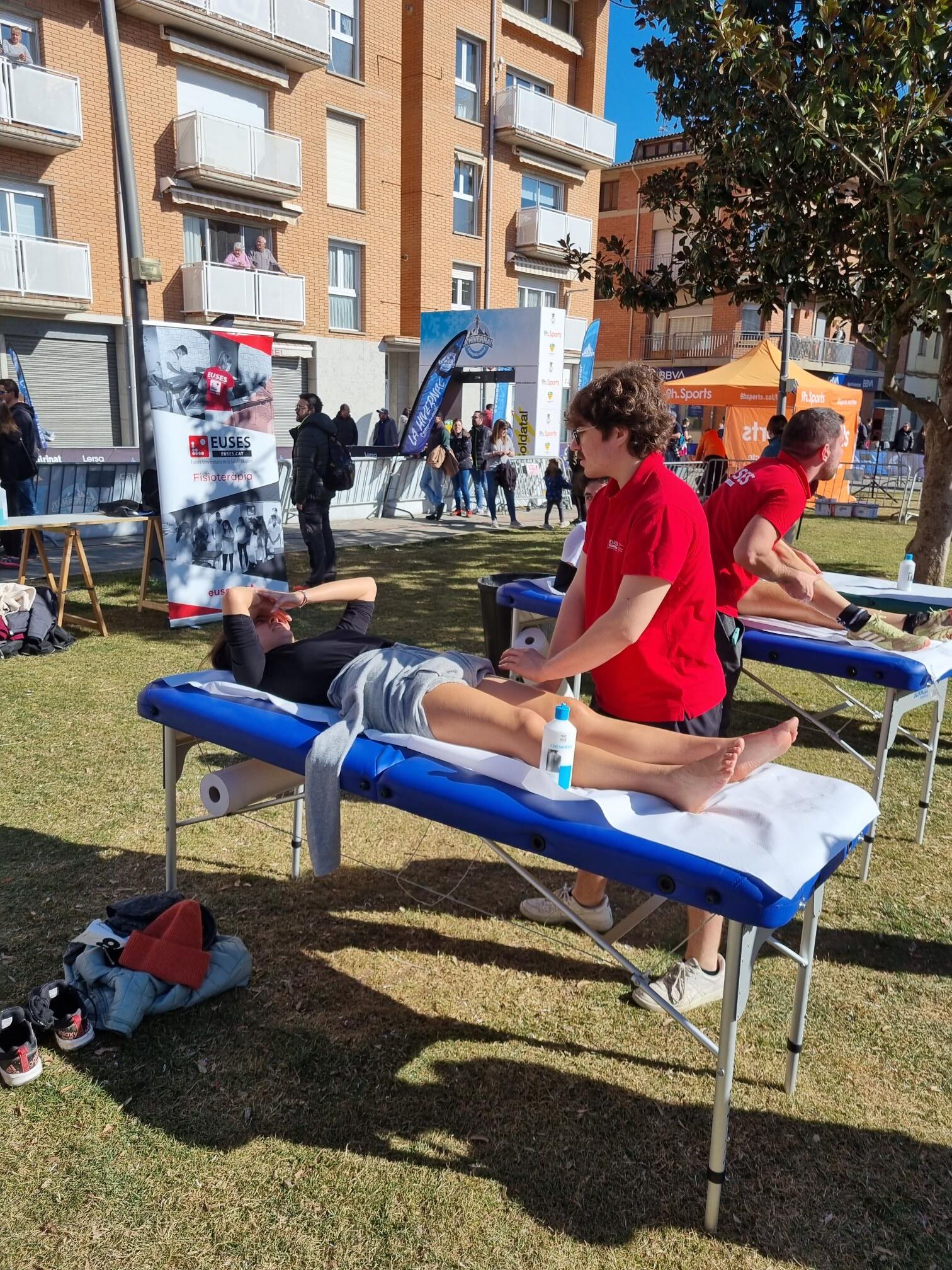 Bajo la supervisión del fisioterapeuta de EUSES Alumni David de la Barrera, los estudiantes del Grado en Fisioterapia Paulin Rolland, Anthony Recupero, Pierrot Bondier y Camille Vuaillat recuperaron los participantes de una nueva edición de “La Hivernal”, en Campdevànol. La organización diseñó una caminata popular de 12,5 kilómetros (y 580 metros de desnivel positivo) y dos carreras de montaña, una de 14 kilómetros (con 700 metros de desnivel) y una de 27 kilómetros (con 1.800 metros de desnivel). En la llegada y en una zona habilitada para el servicio de fisioterapia en la Plaza de la Mainada, el equipo de EUSES realizó masajes y estiramientos a los deportistas para acelerar su recuperación muscular.
