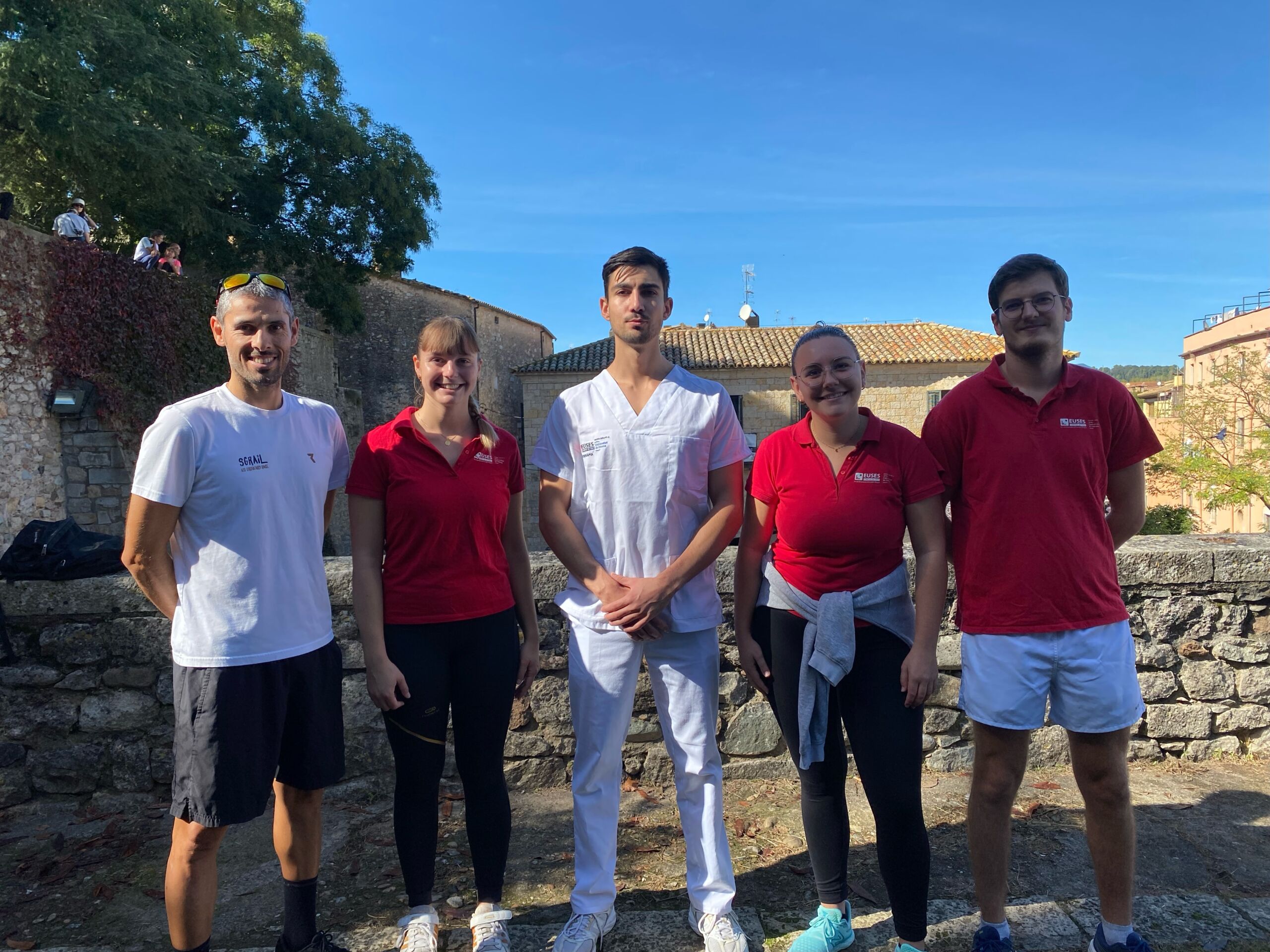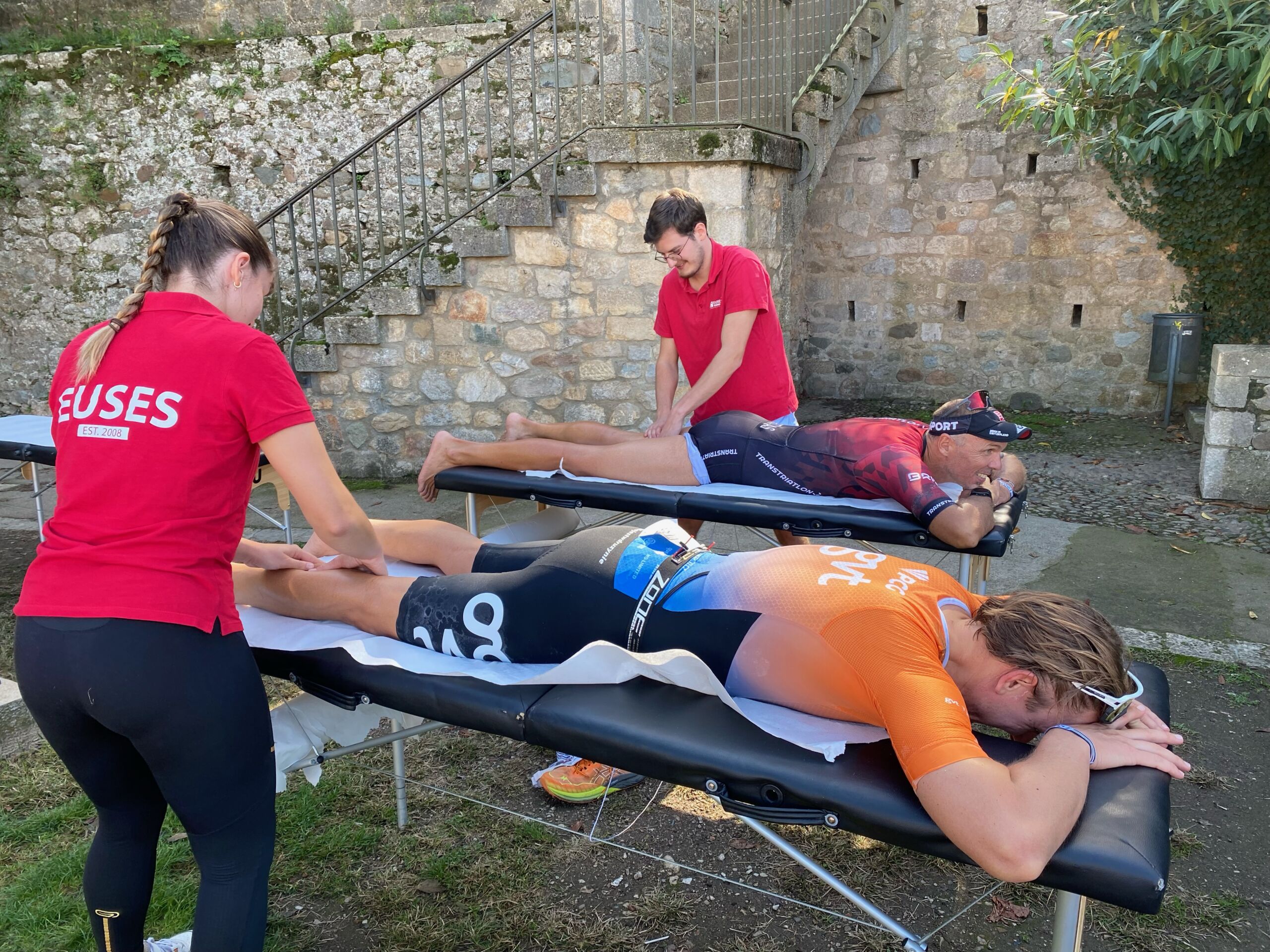 Los alumnos del Grado en Fisioterapia Thibault Alves, Noemy Rybak, Amandine Federici y Lucas Faure se han encargado este fin de semana de la recuperación muscular de los participantes que han tomado parte (cerca de 800) en la triatlón SGRAIL 100 de Girona, una prueba organizada por Klassmark. La competición arrancó a las 8 de la mañana en Cadaqués y tuvo el final a Girona. En total fueron 100 kilómetros de recorrido de los cuales 2 fueron nadando, 88 (en la Platja Gran de Cadaquès) en bicicleta (Cadaqués-Celrà) y los 10 últimos de carrera a pie (Celrà-Girona). Los cuatro estudiantes del Grado en Fisioterapia, supervisados por el fisioterapeuta del EUSES Alumni Jonathan Duran, realizaron en la Plaça dels Jurats (zona de llegada) técnicas de estiramientos y masajes para acelerar la recuperación muscular de los deportistas.