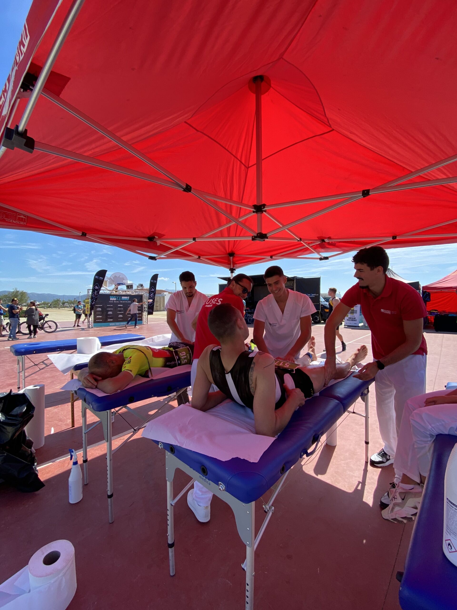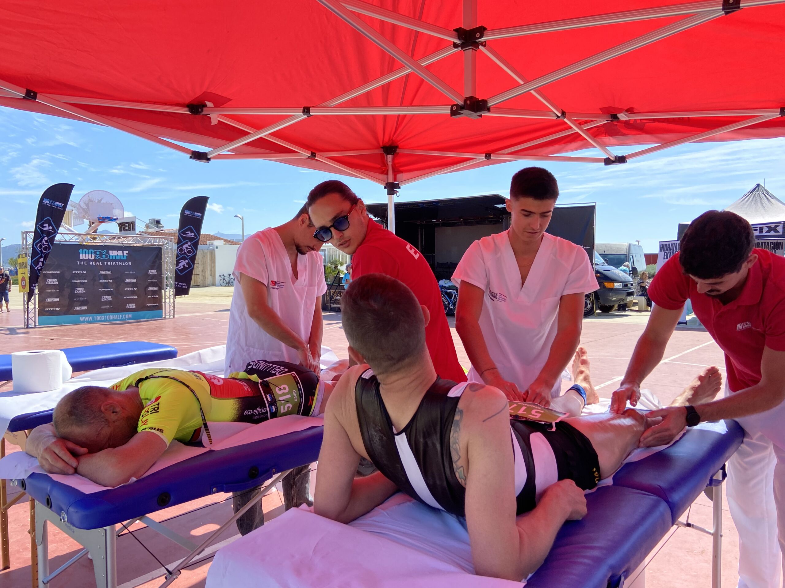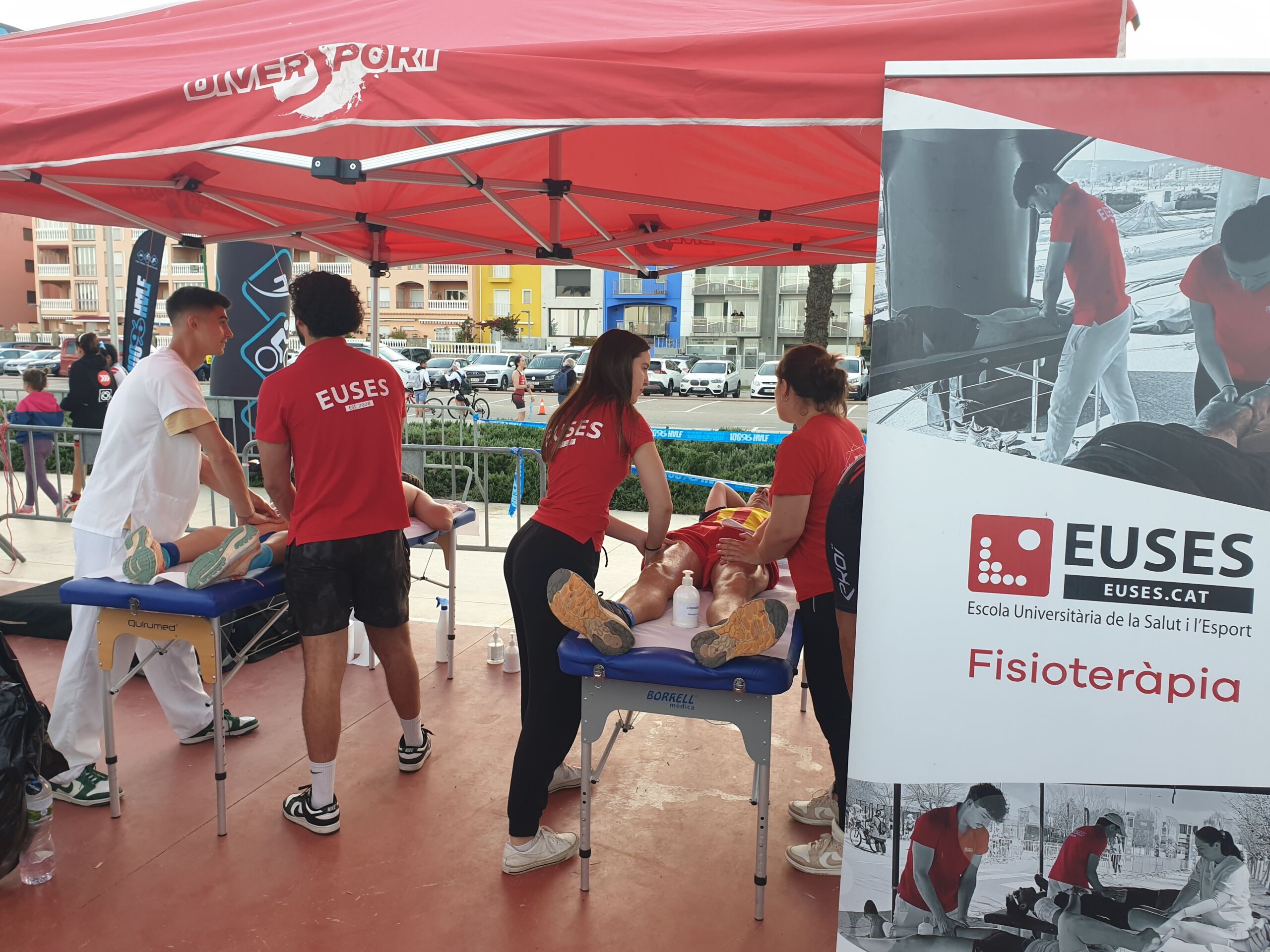 La Escola Universitària de la Salut i l’Esport colaboró un año más en la Triatlón de Empuriabrava, que se ha disputado este sábado y domingo en diferentes modalidades y recorridos. Organizada por 100%100 Half, el acontecimiento contó con hasta seis diseños: el sábado se celebró la triatlón Olympic (1,5 kilómetros nadando, 40 en bicicleta y 10 de carrera a pie) y la Aquabique M (40 kilómetros en bicicleta y 10 de carrera a pie). El domingo se celebraron las triatlones Half (1,9 kilómetros de natación, 90 kilómetros en bicicleta y 21 de carrera a pie), la Short (750 metros, 60 km. Y 10 km.) y la Sprint (750 metros, 20 km. Y 5 km.) y el Aquabike L (1,9 kilómetros nadando y 21 de carrera a pie). EUSES habilitó los dos días un punto de servicio de fisioterapia en la zona de llegada. El sábado, el fisioterapeuta de EUSES Alumni Mario Evangelista tutorizó a cinco estudiantes del Grado (Ilona Zawislak, Anna Vila, Louis Vivien, Theo Escoubreirou y Mathis Amrani) y el domingo el tutor fue la también fisioterapeuta de EUSES Alumni Alba Saavedra y los estudiantes: Louis Serge López, Louis Vivien, Eloise Boilon, Sarah Dessaint, Enzo Moreira y Roman Mur. Fisioterapeutas y alumnos realizaron técnicas de recuperación muscular (básicamente masajes y estiramientos) a los participantes después de finalizar la prueba.