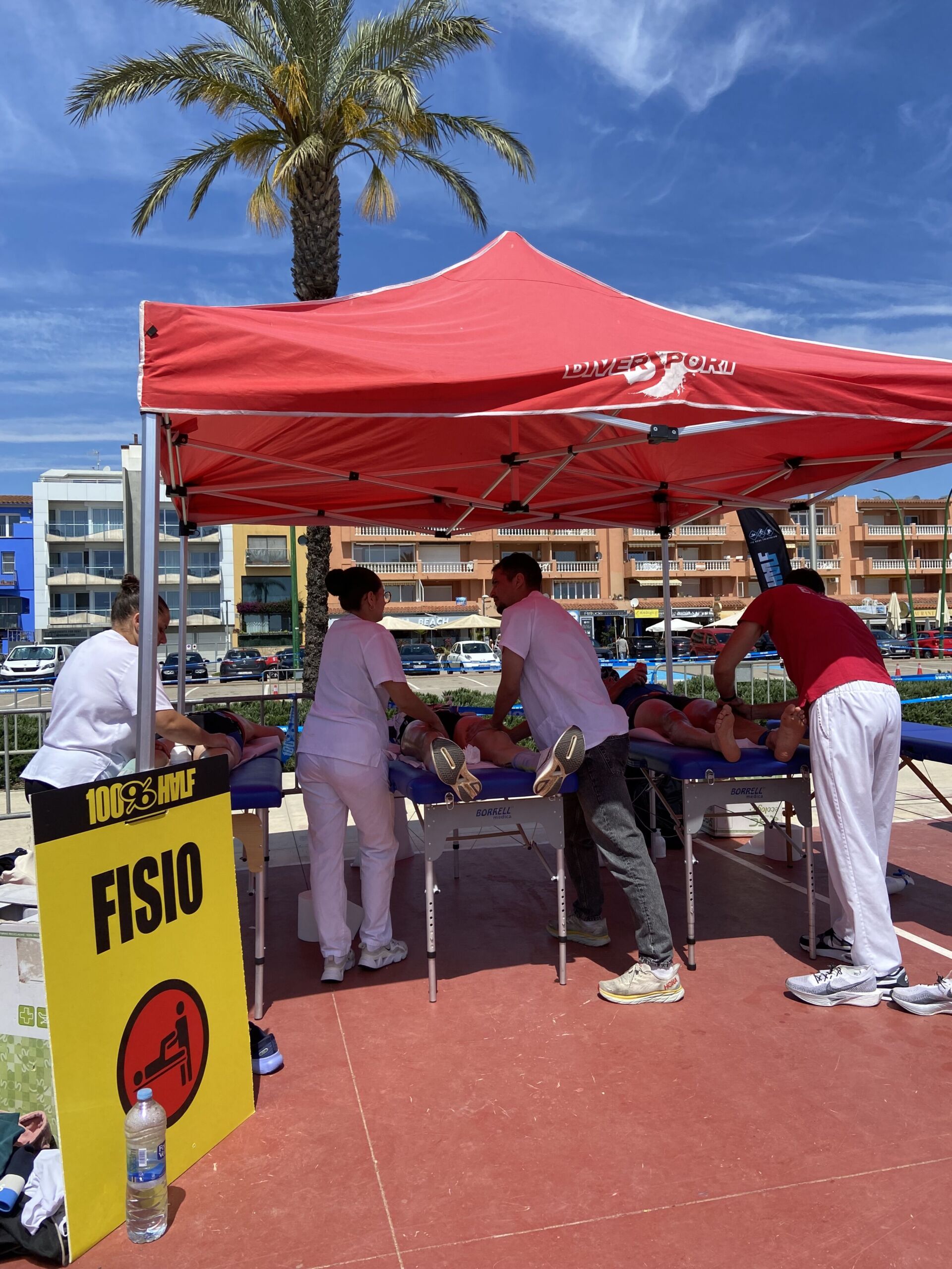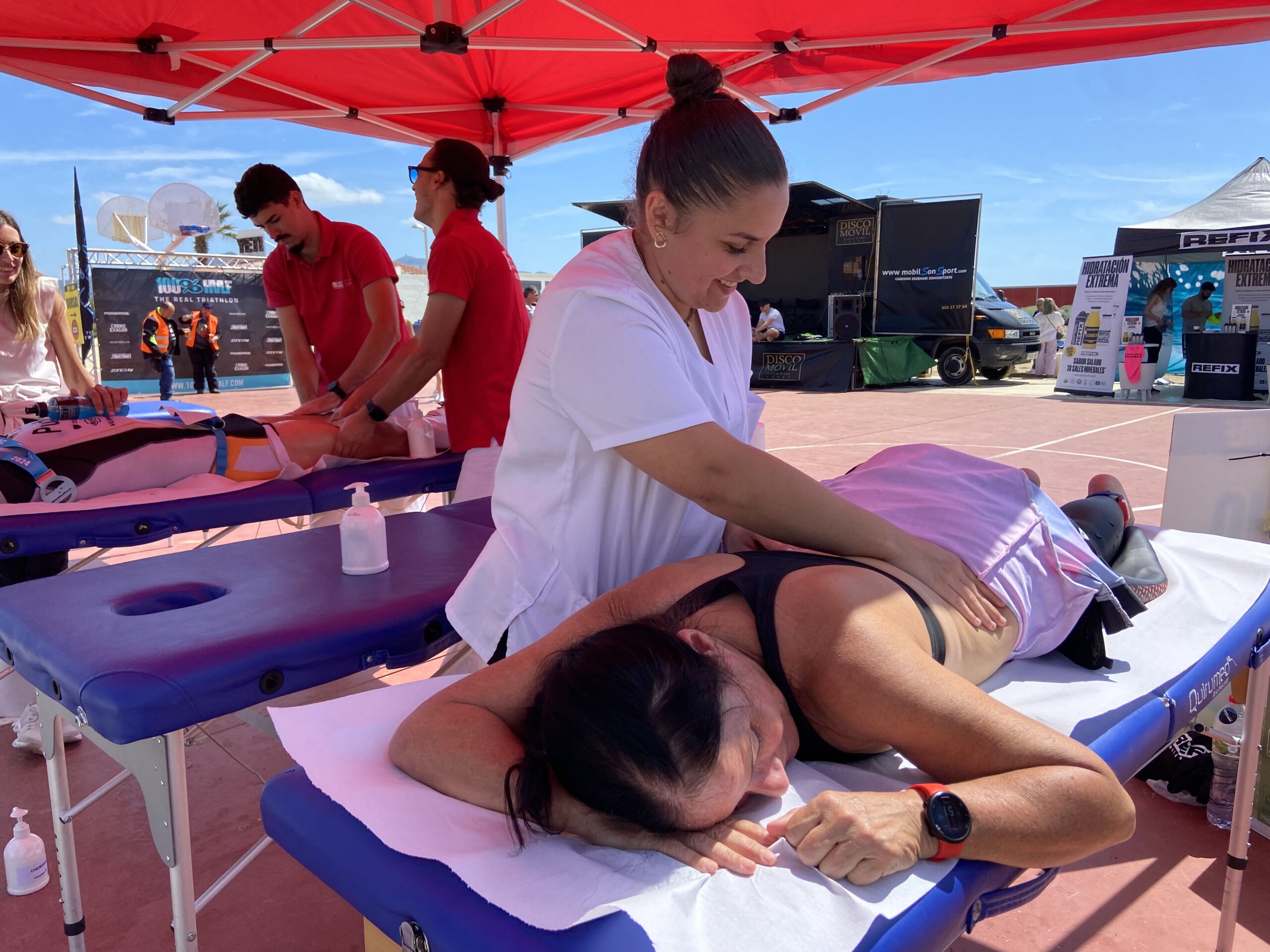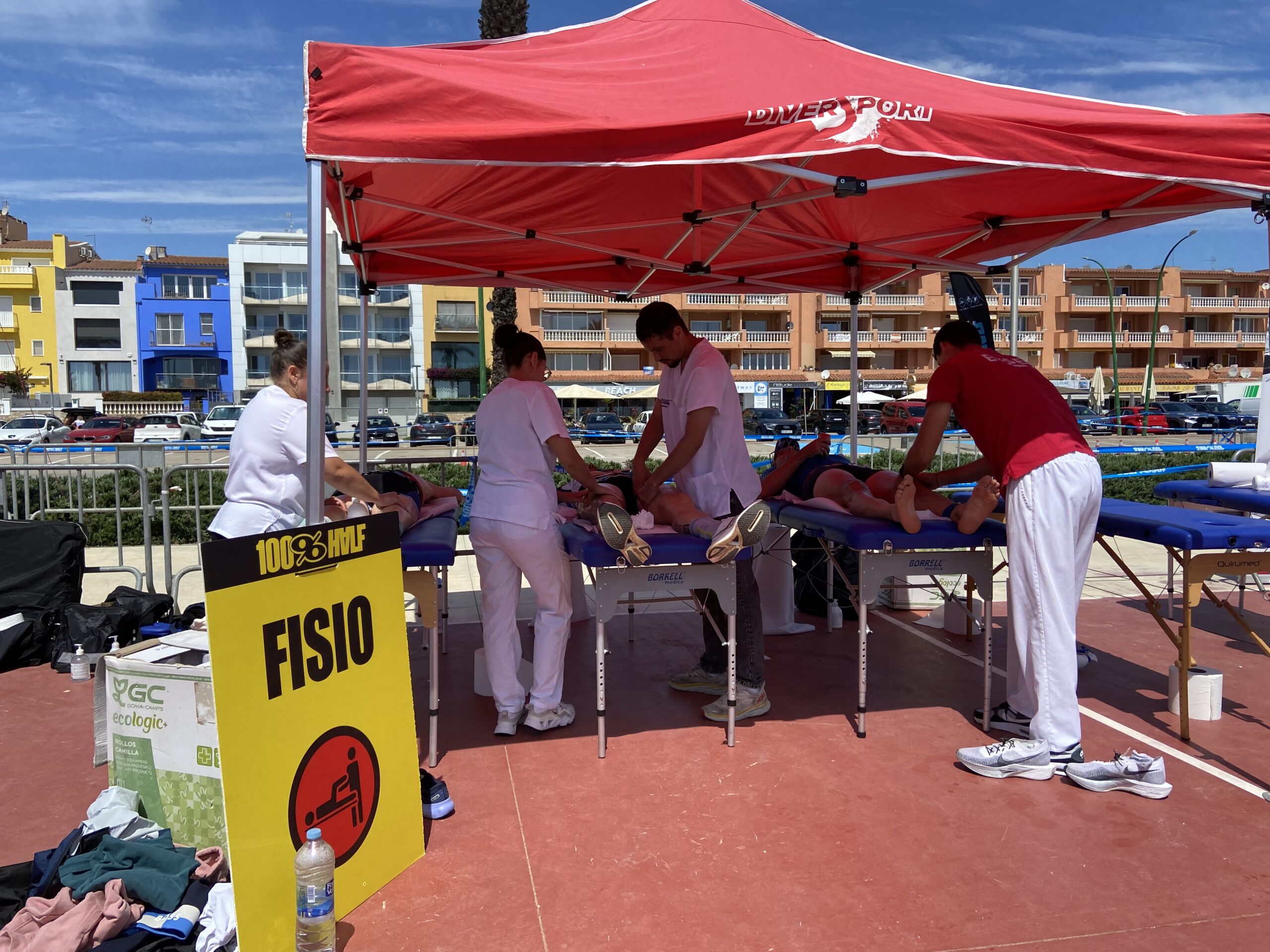 La Escola Universitària de la Salut i l’Esport colaboró un año más en la Triatlón de Empuriabrava, que se ha disputado este sábado y domingo en diferentes modalidades y recorridos. Organizada por 100%100 Half, el acontecimiento contó con hasta seis diseños: el sábado se celebró la triatlón Olympic (1,5 kilómetros nadando, 40 en bicicleta y 10 de carrera a pie) y la Aquabique M (40 kilómetros en bicicleta y 10 de carrera a pie). El domingo se celebraron las triatlones Half (1,9 kilómetros de natación, 90 kilómetros en bicicleta y 21 de carrera a pie), la Short (750 metros, 60 km. Y 10 km.) y la Sprint (750 metros, 20 km. Y 5 km.) y el Aquabike L (1,9 kilómetros nadando y 21 de carrera a pie). EUSES habilitó los dos días un punto de servicio de fisioterapia en la zona de llegada. El sábado, el fisioterapeuta de EUSES Alumni Mario Evangelista tutorizó a cinco estudiantes del Grado (Ilona Zawislak, Anna Vila, Louis Vivien, Theo Escoubreirou y Mathis Amrani) y el domingo el tutor fue la también fisioterapeuta de EUSES Alumni Alba Saavedra y los estudiantes: Louis Serge López, Louis Vivien, Eloise Boilon, Sarah Dessaint, Enzo Moreira y Roman Mur. Fisioterapeutas y alumnos realizaron técnicas de recuperación muscular (básicamente masajes y estiramientos) a los participantes después de finalizar la prueba.