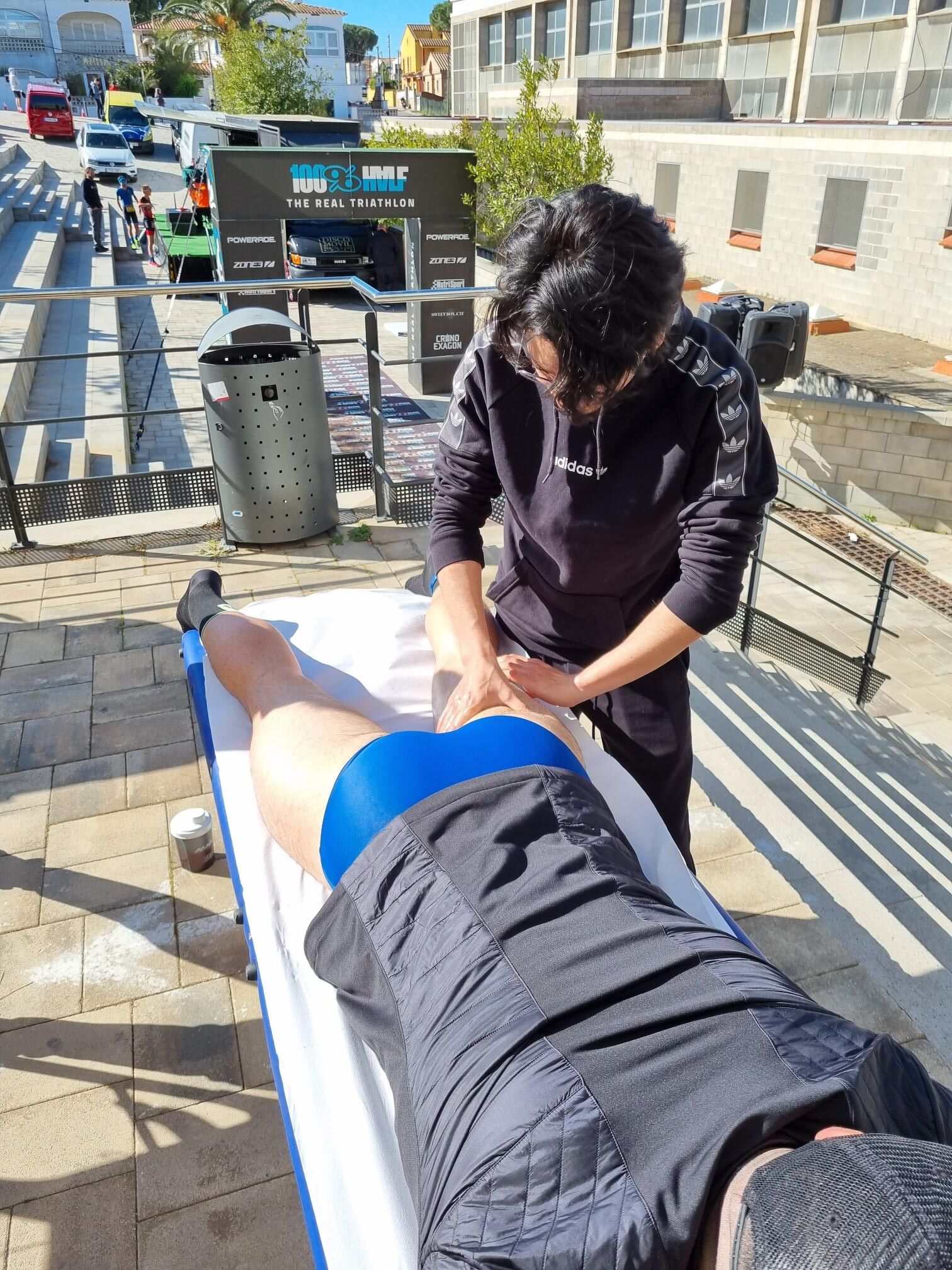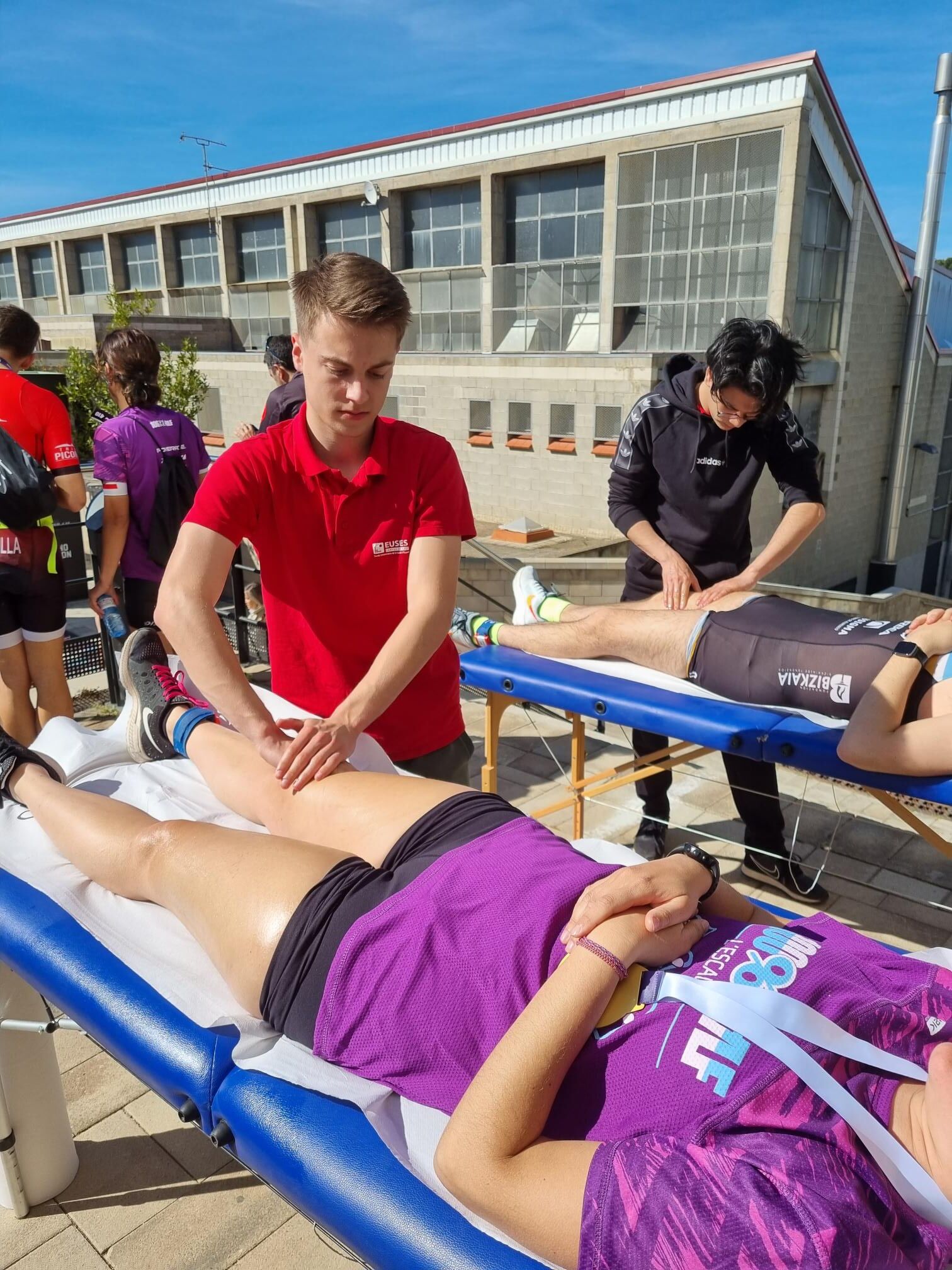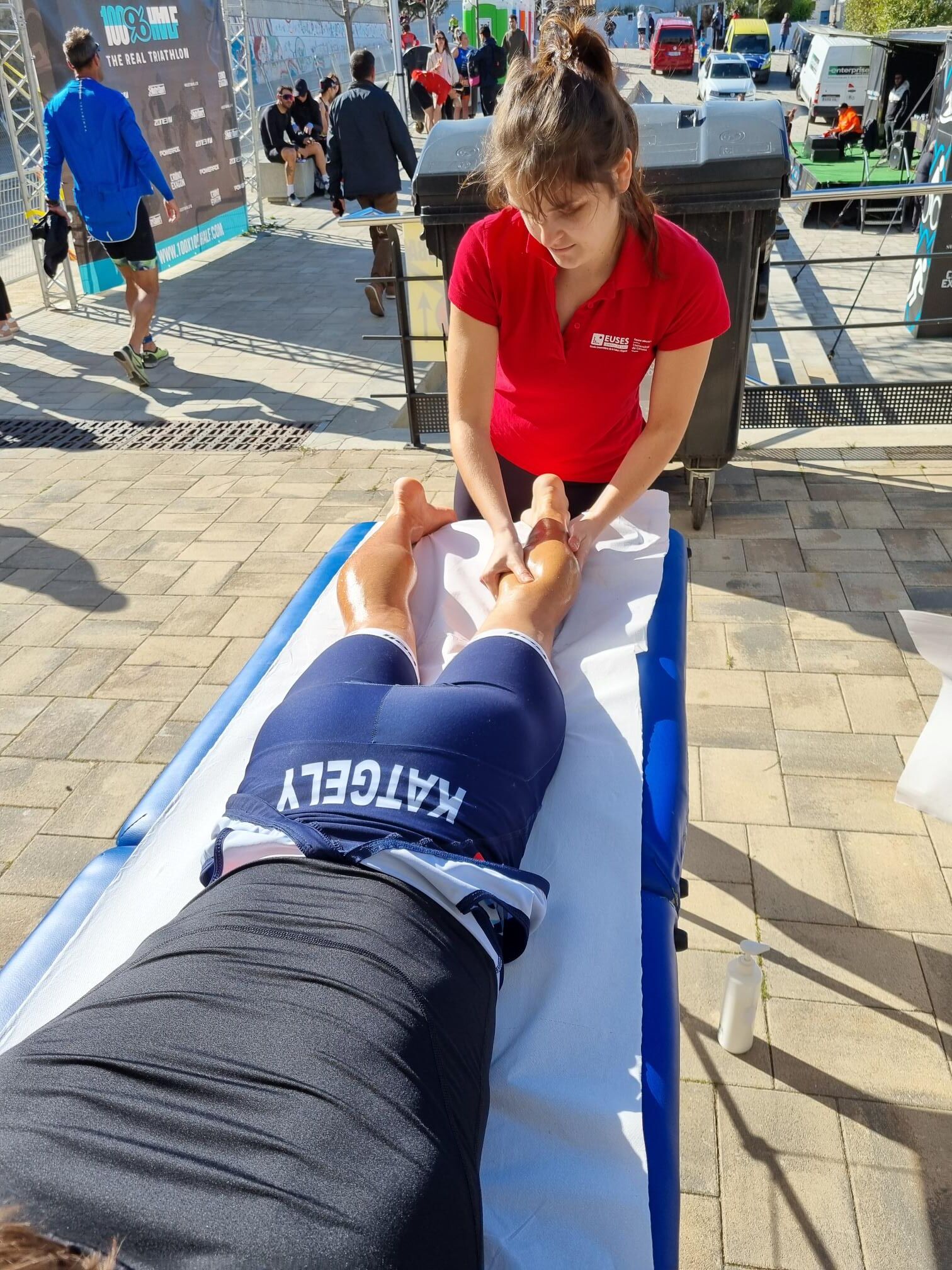 Este domingo se ha celebrado una nueva edición del 100%100 Half l’Escala, una prueba en la cual los participantes han podido escoger entre tres modalidades de triatlón (Sprint: 750 metros nadando, 20 kilómetros en bicicleta y 5 de carrera a pie; Olympic: 1,5 km, 40 km y 10 km; y Half: 1,9 km, 81 km y 21 km) y dos de Aquabike (la M: 1,5 kilómetros nadando y 40 en bicicleta y la L: 1,9 km y 81 km). La Escola Universitària de la Salut i l’Esport ha colaborado con un servicio de fisioterapia cerca de la línea de la llegada para que los participantes pudieran descargarse muscularmente después del esfuerzo. Allí, y bajo la supervisión del fisioterapeuta de EUSES Alumni David de la Barrera, los estudiantes del Grado que han realizado masajes y estiramientos han sido Shen Chevalier, Virginie Cinq y Severin Brouillet.