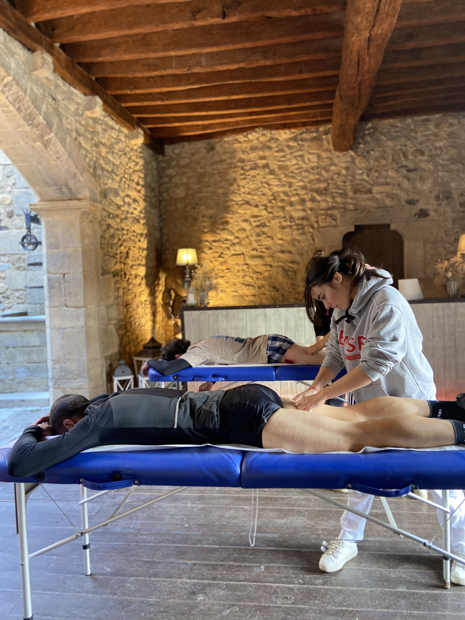 La Escola Universitària de la Salut i l’Esport colaboró con la Komorebi Gravel League, que este domingo vivió su primera etapa con salida y llegada en el Castell de Sant Gregori. Los ciclistas que tomaron parte en esta prueba tuvieron que afrontar un recorrido de 83 kilómetros con un desnivel positivo de 1.238 metros. En la zona de llegada se habilitó un punto de servicio de fisioterapia en el cual la fisioterapeuta de EUSES Alumni Alba Saavedra y los estudiantes del Grado Alice Mercade, Jade Laubuge y Pauline Jouanna realizaron técnicas de recuperación muscular (masajes y estiramientos) a los ciclistas que así lo desearon.