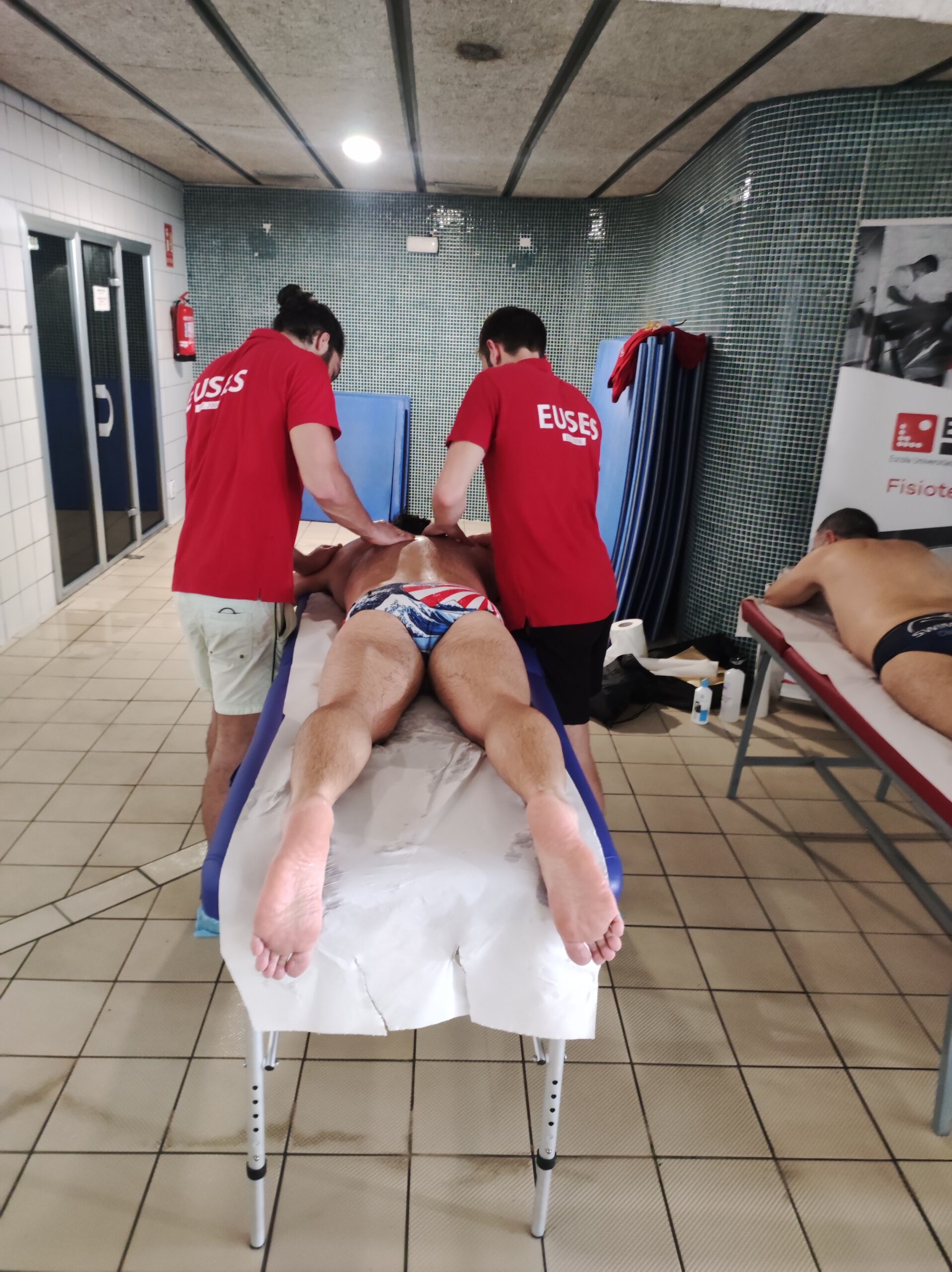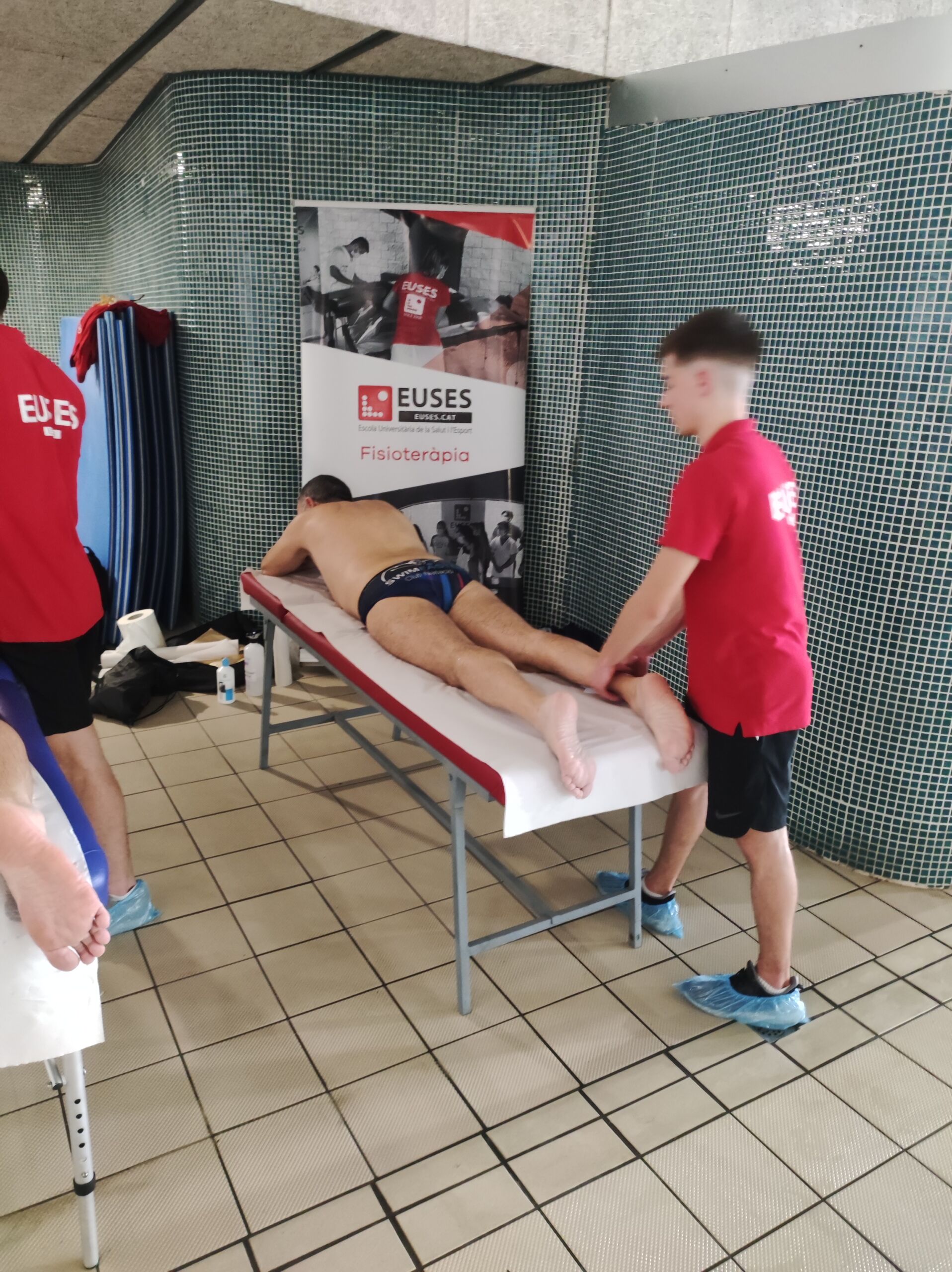 Bajo la supervisión del fisioterapeuta de EUSES Alumni Miquel Giraldó, los estudiantes del Grado en Fisioterapia Ton Ivars, Séverin Brouillet y Hugo Van Belleghem han colaborado en la recuperación de los nadadores del 8º Trofeo Máster Swimfaster que se ha celebrado en la piscina municipal de Salt este sábado día 11 de marzo y que era la novena etapa del Circuito Catalán. Los representantes de la Escola Universitària de la Salut i l’Esport realizaron masajes y estiramientos musculares a los participantes en una zona convenientemente habilitada dentro del mismo recinto.