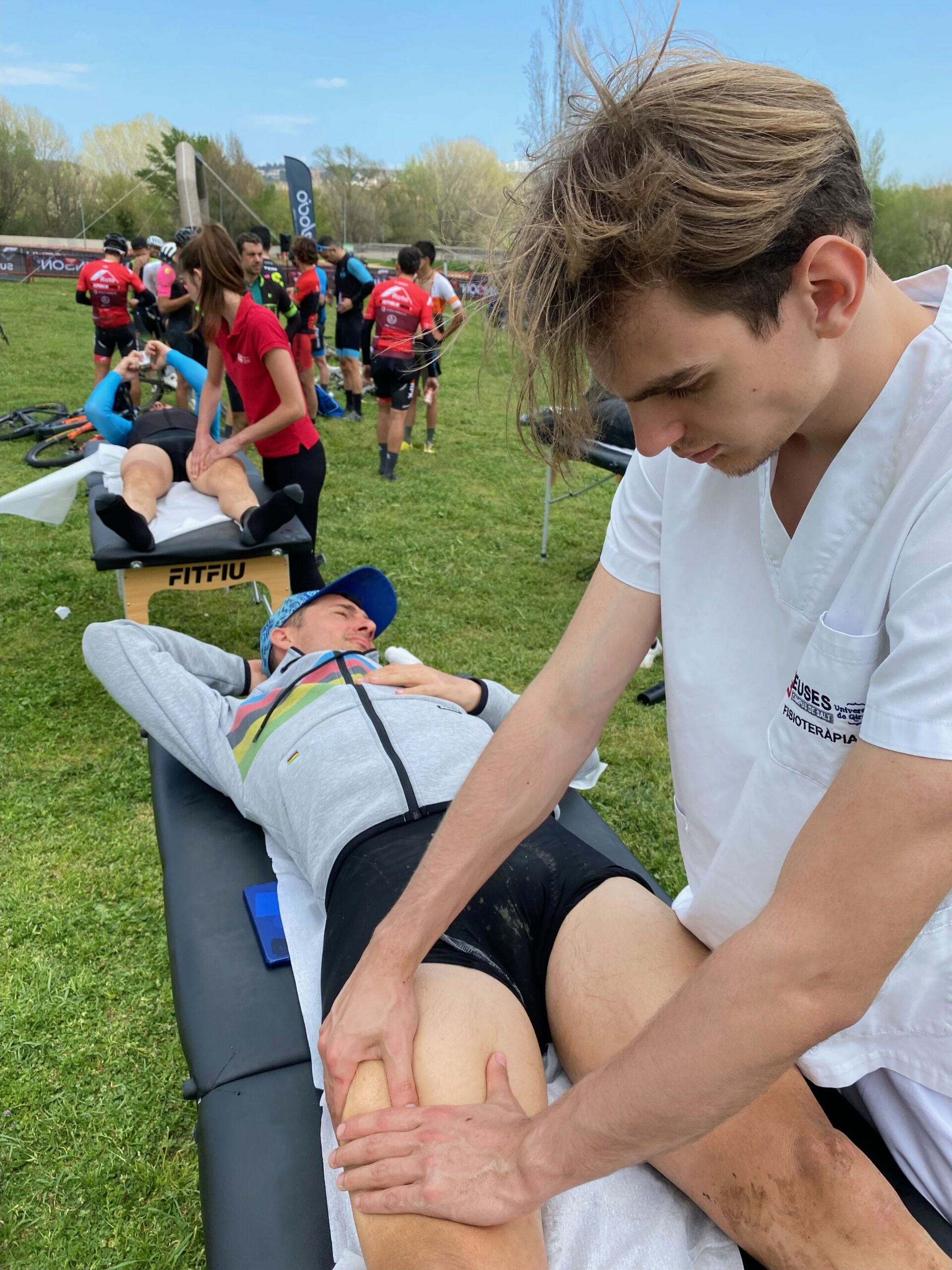 La Escola Universitària de la Salut i l’Esport puso su grano de arena en la prueba Girona MTB Singletrack, que se ha celebrado desde el viernes 31 de marzo hasta el domingo 2 de abril. La llamada fiesta de la bicicleta de montaña ha tenido tres etapas, todas con salida y llegada en Girona. La de viernes, con un recorrido de 53,7 kilómetros y un desnivel positivo de 1.200 metros; la segunda, la más dura, con de 85 kilómetros y 1.700 metros de desnivel positivo; y la última, de 54,1 kilómetros y 1.200 metros de desnivel. Al final de cada prueba, y en un punto de servicio de fisioterapia condicionado por la organización (Klassmark), once estudiantes del Grado en Fisioterapia de EUSES se han encargado de acelerar la recuperación muscular de los ciclistas. Bajo las directrices del fisioterapeuta de EUSES Alumni Jonathan Duran, los estudiantes que han descargado las piernas de los participantes con masajes y estiramientos han estado Salome Arnaez (viernes y sábado), Emma Quindos, Pauline Ribeira y Eline Ardeois (viernes), Tristan Marcoux, Esther Botterwerg y Eline Ardeois (sábado) y Enzo Demarche, Ulises Sánchez, Sara Martín i Júlia Xirgo (domingo).