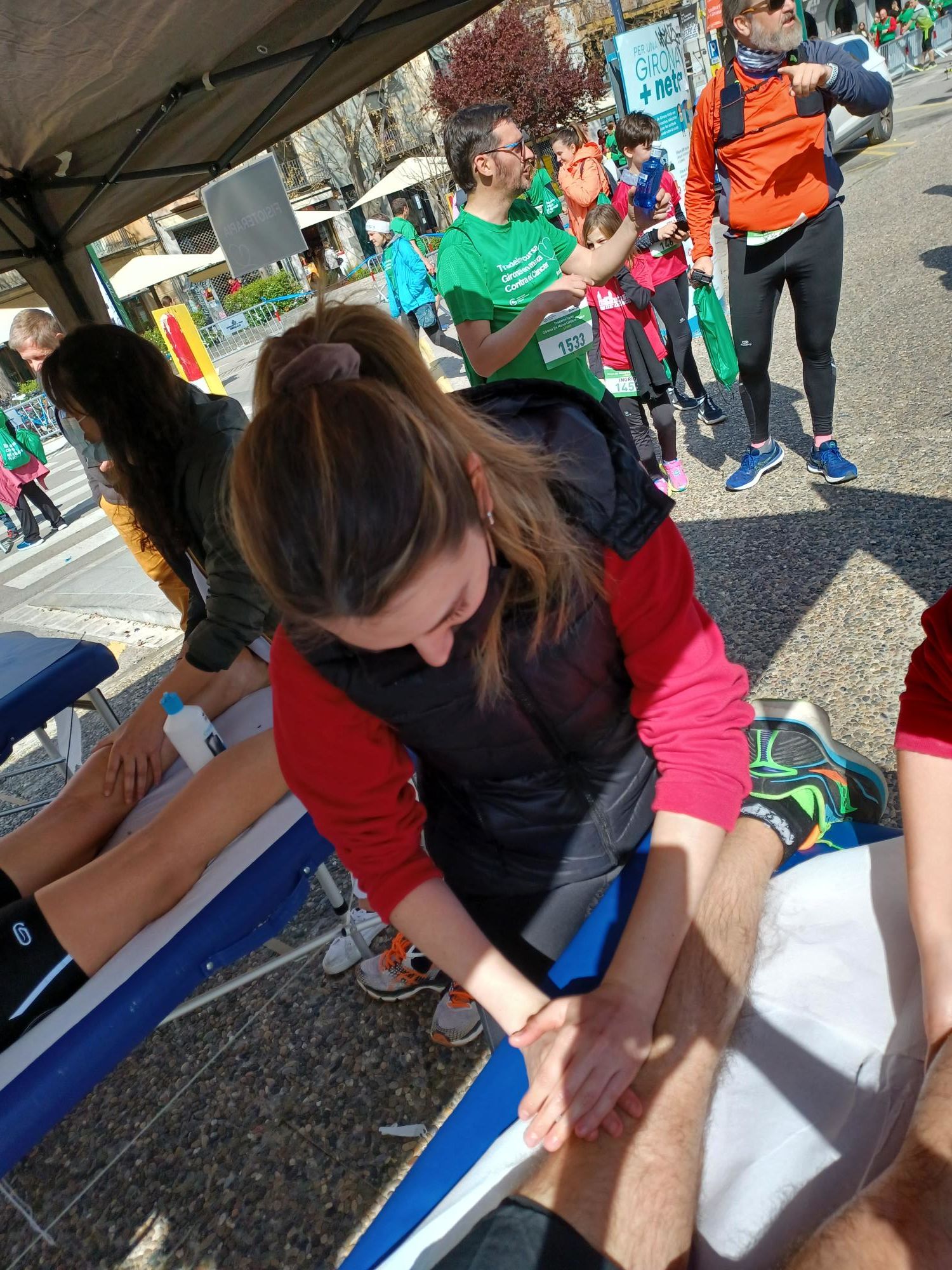 En una zona habilitada en la llegada, en la plaza de Catalunya, l’Escola Universitària de la Salut i l’Esport ha ofrecido un servicio de fisioterapia a los participantes que han tomado parte a la 8ª edición de la carrera Tradeinn Girona en marcha Contra el Cáncer. Supervisados por el fisioterapeuta de la organización Cristina Pallerols, los estudiantes del Grado Ámbar Marty, Louise Bastard, Emma Bonnefoux y Pauline Abadie han realizado técnicas de recuperación muscular a los participantes que así lo han deseado. La prueba contaba con una carrera infantil, una carrera popular y una caminata popular por las calles de la ciudad de Girona.