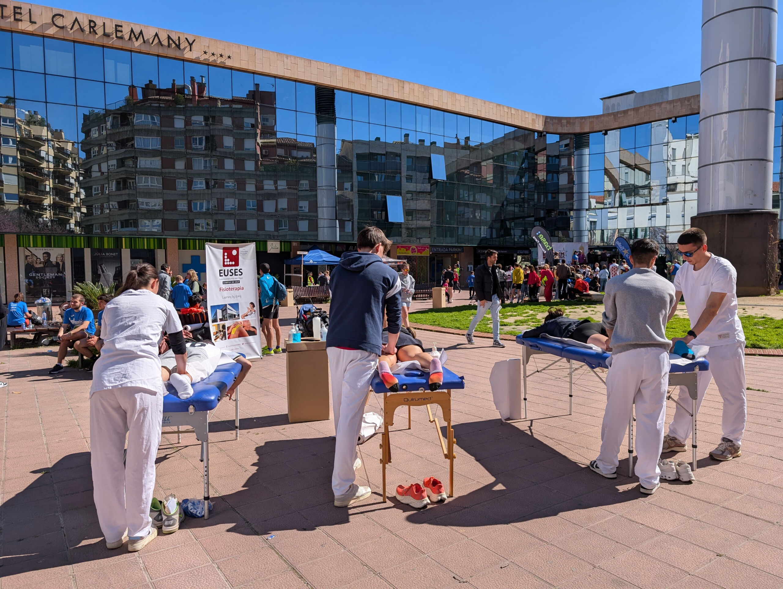 La Escola Universitària de la Salut i l’Esport ha estado presente, un año más, en los 10 km. de Girona Esports Parra-La Salle 2025, que se ha celebrado este domingo y que este año ha llegado a su 24ª edición. Cómo es habitual, la organización ha previsto varias carreras infantiles, una de 5 kilómetros y la de 10 kilómetros, con una participación total de unos 2.000 corredores. Bajo las directrices de la fisioterapeuta de EUSES Alumni Magda Oter, los estudiantes del Grado Margaux Pueyo, Lenny Giraud-Vanius, Theo Rouquette y Kyliann Bou se encargaron, al final de la prueba y en un punto habilitado por la organización, de descargar las piernas de los participantes que así lo desearon con masajes y técnicas de estiramientos.