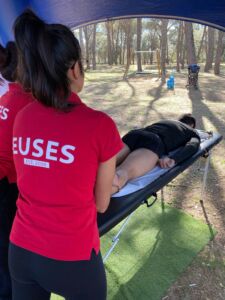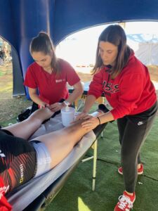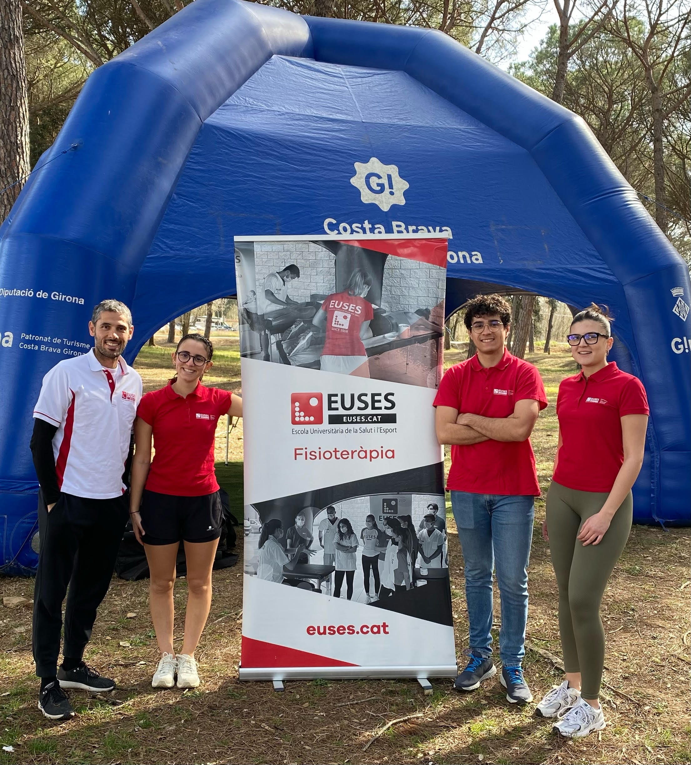 Bajo la supervisión del fisioterapeuta de EUSES Alumni y de Klassmark, Jonathan Duran, ocho estudiantes del Grado en Fisioterapia de la Escola Universitària de la Salut i l’Esport contribuyeron a la recuperación muscular de los participantes de la Santa Vall, una prueba de BTT por caminos, veredas y pistas de la Vall de Llèmana que este año ha llegado a la décima edición y ha tenido tres etapas (viernes, sábado y domingo): un prólogo (etapa 1), con subida a San Grau (6,3 km. y 362 metros de desnivel positivo); la Segments (etapa 2), con salida y llegada en Sant Gregori (72,6 km. y 830 metros de desnivel); y la Santa Vall (etapa 3), también con el centro neurálgico en Sant Gregori tanto en la salida como en la llegada (116 km. y 1.542 metros de desnivel). Al final de la prueba, y en un espacio convenientemente habilitado en la zona de la Pineda, los alumnos Manon Cester, Lison Deville, Carla Richard y Océan Hernandez (sábado) y Clara Imbert, Zoe Fort, Coralie Mejan y Jade Theone (domingo) realizaron técnicas de recuperación muscular (básicamente masajes y estiramientos) a los participantes que lo desearon.