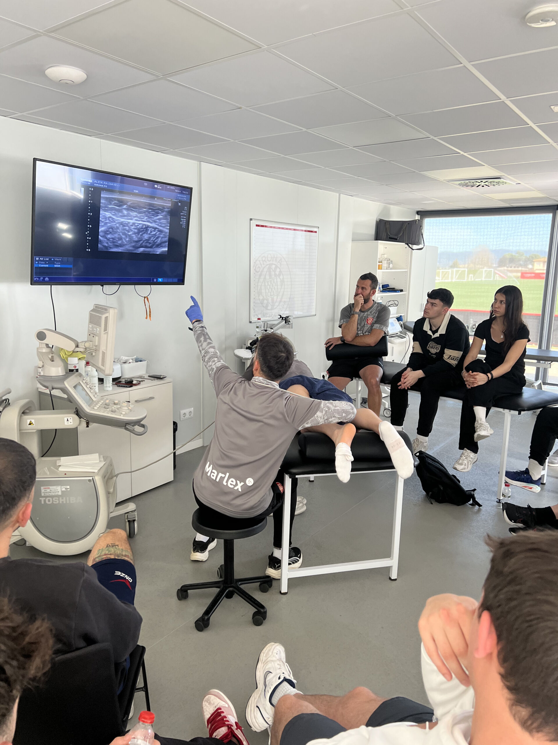 El alumnado de 4º curso del Grado en Ciencias de la Actividad Física y del Deporte ha vivido una sesión práctica en las instalaciones de entrenamiento del primer equipo del Girona FC, en la ciudad deportiva de Vilablareix. La sesión ha sido dirigida por Oriol Balañà, docente responsable de la asignatura Readaptación al Esfuerzo y máximo responsable de los servicios médicos del primer equipo del Girona FC, que ha acercado los estudiantes a la realidad del trabajo interdisciplinario en el alto rendimiento.