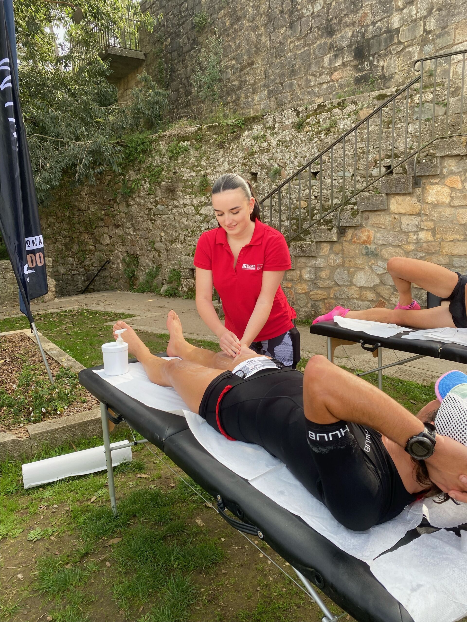 La Escola Universitària de la Salut i l’Esport ha colaborado con un servicio de fisioterapia en la llegada de la Sgrail100 de Girona, una prueba de mucha exigencia que combina natación (1.500 metros por mar, con salida y llegada a Cadaqués), Grava (sector de ciclismo con salida de Cadaqués y llegada en Celrà de 92,6 kilómetros de recorrido y 1.080 metros de desnivel positivo) y Trail Running (10,5 kilómetros de recorrido con salida en Celrà y llegada a Girona). El fisioterapeuta de EUSES Alumni Jonathan Duran ha supervisado los seis estudiantes del Grado (Camille Gachet, Maelys Crozes, Mathilde Gil, Gregoire Geoffray, Carla Guillot y Flavie Pisseloup) que han acelerado la recuperación muscular de los deportistas después de la prueba con masajes y estiramientos.