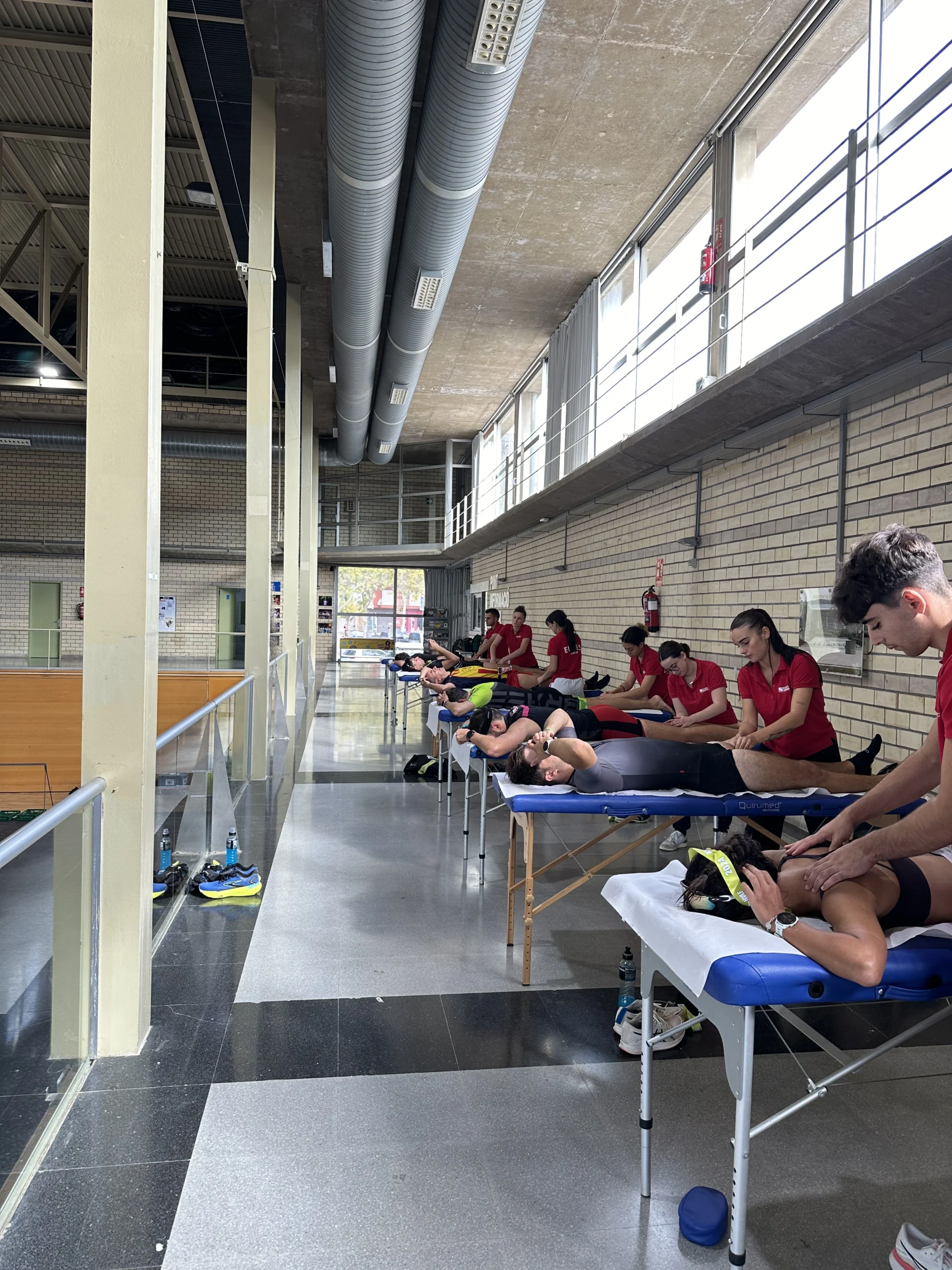 Este domingo se ha celebrado la Half Platja d’Aro de Triatlón, un formato en el cual los participantes han podido escoger entre cinco recorridos, tres de trialtón: distancia Sprint (750 m de natación, 22 kilómetros en bicicleta y 5 de carrera a pie), distancia Olympic (1,5 km., 44 km. y 10 km) y distancia Half (1,9 km., 85 km. y 21 km.) y dos Aquabikes: la M (1,5 kilómetros de natación y 44 kilómetros en bicicleta) y la L (1,9 km. y 85 km., respectivamente). Al final del acontecimiento, y bajo la supervisión del fisioterapeuta de EUSES Alumni Quim Aspar, los estudiantes del Grado en Fisioterapia Marine Amalric, Sarah Taferant, Elea Helmer, Elysa Coudert, Laurine Lupi, Victor Rubio, Pau Lafuente, Matthis Carrere y Keila Vellvehí han realizado, en una zona habilitada para la recuperación en el pabellón municipal de Platja d’Aro, masajes y estiramientos a los participantes que así lo han deseado.