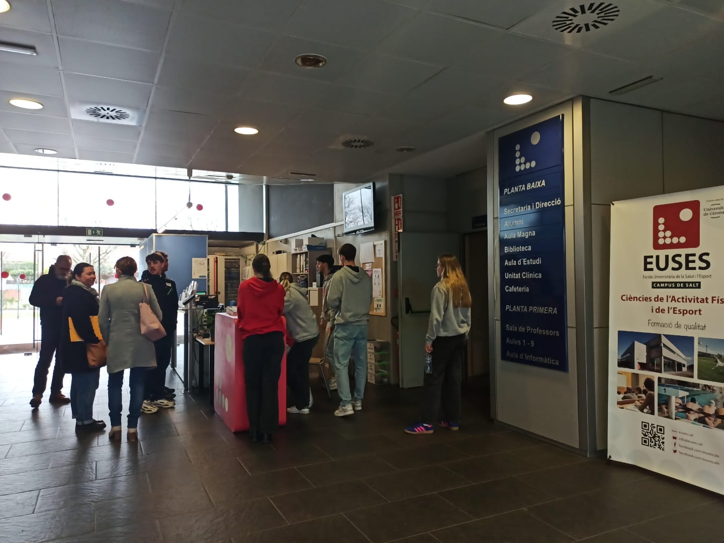 Las instalaciones de la Escola Universitària de la Salut i l’Esport se han llenado de asistentes aprovechando la jornada de puertas abiertas en el Campus de Salt para el Grado en Fisioterapia. Las diferentes sesiones (tres en total) han servido para que los alumnos que se quieren sumar el curso académico 2025/26 a la familia de EUSES pudieran ver de primera mano las instalaciones en una visita por todo el recinto que ha sido guiada por estudiantes de 4º curso del grado Mattéo Cabanes, Ismaël Boureille, Eléa Lancelot, Louane Sagnes, Elsa Ferrer, Romain Coulon, Carla Baccherini, Anaëlle Lacan.