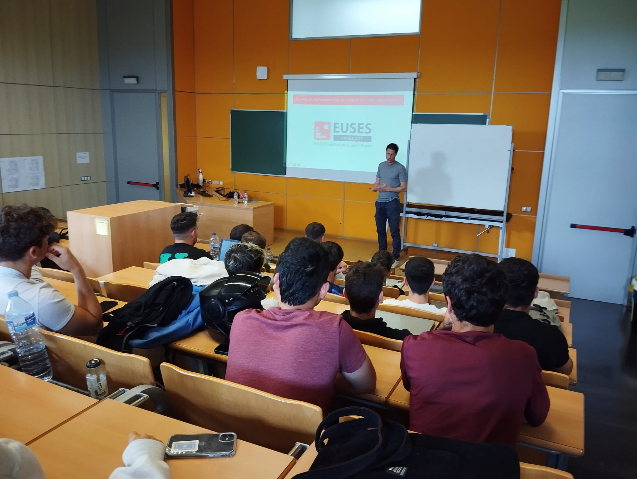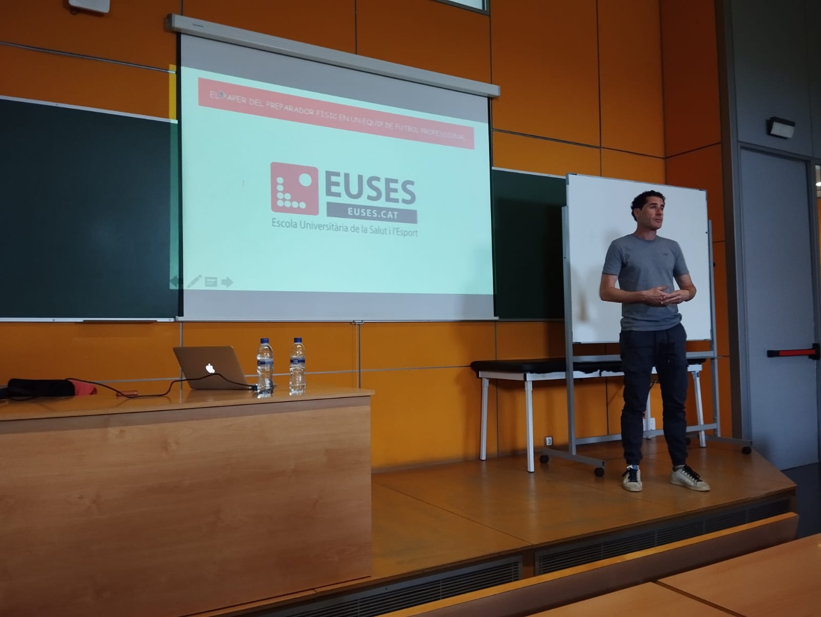 Los estudiantes de 3º curso del Grado en Ciencias de la Actividad Física y del Deporte de la asignatura de Deportes de Equipo 2-Fútbol que imparten los profesores Jordi Grabulosa y Pere Gratacòs han disfrutado este martes de la presencia de un preparador físico de primer nivel como es Jordi Balcells, que ha hablado sobre los microciclos de entrenamiento y del uso de los GPS en el fútbol profesional y ha respondido al final a las dudas, las preguntas y las inquietudes de los estudiantes, algunos de los cuales serán futuros preparadores físicos o entrenadores.