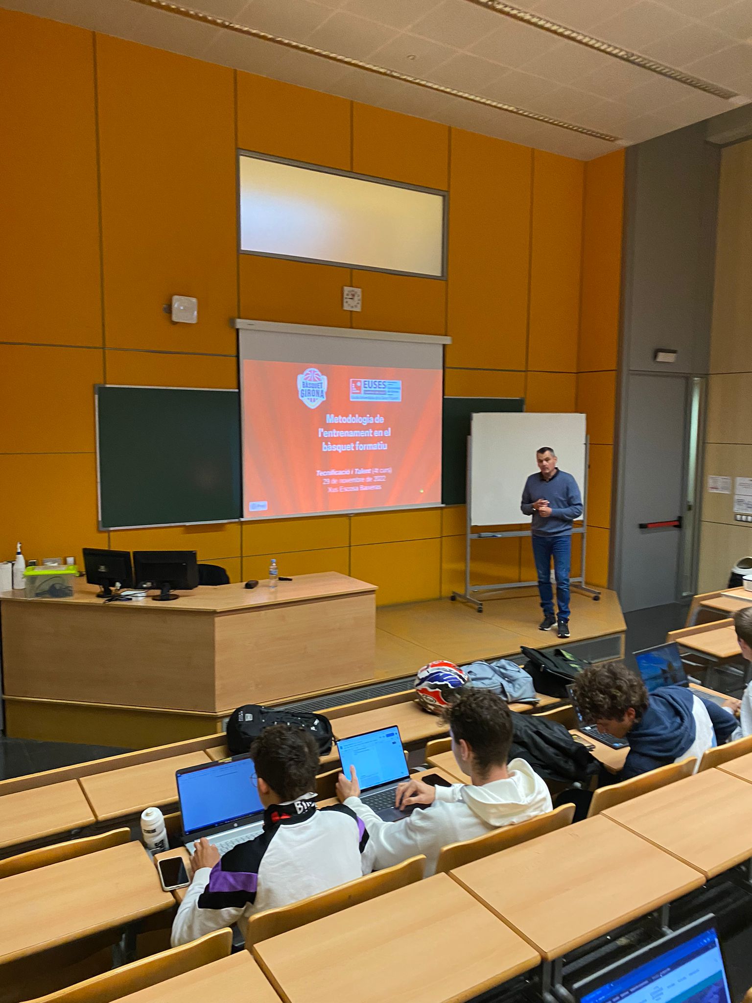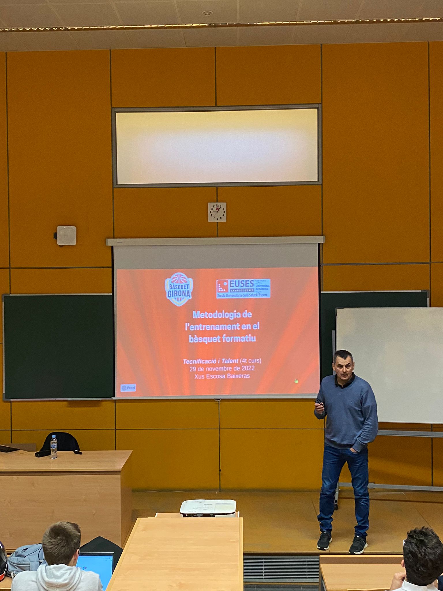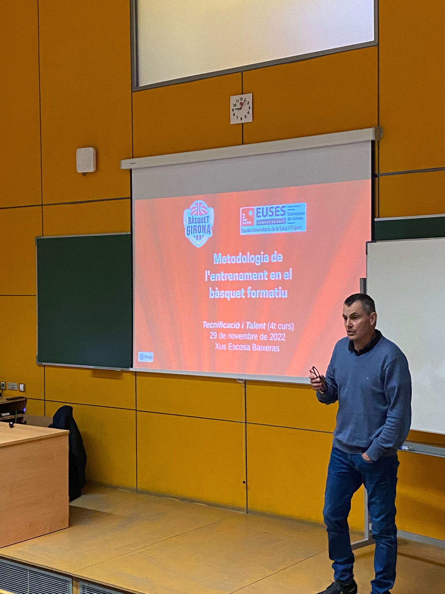 El director del área de rendimiento del Bàsquet Girona, Jesus Escosa, que también es profesor de EUSES, ha realizado una masterclass enmarcada en la asignatura de 4º curso del Grado en CAFyD de “Tecnificación deportiva y desarrollo del talento deportivo” que imparte el profesor Arnau Sacot.