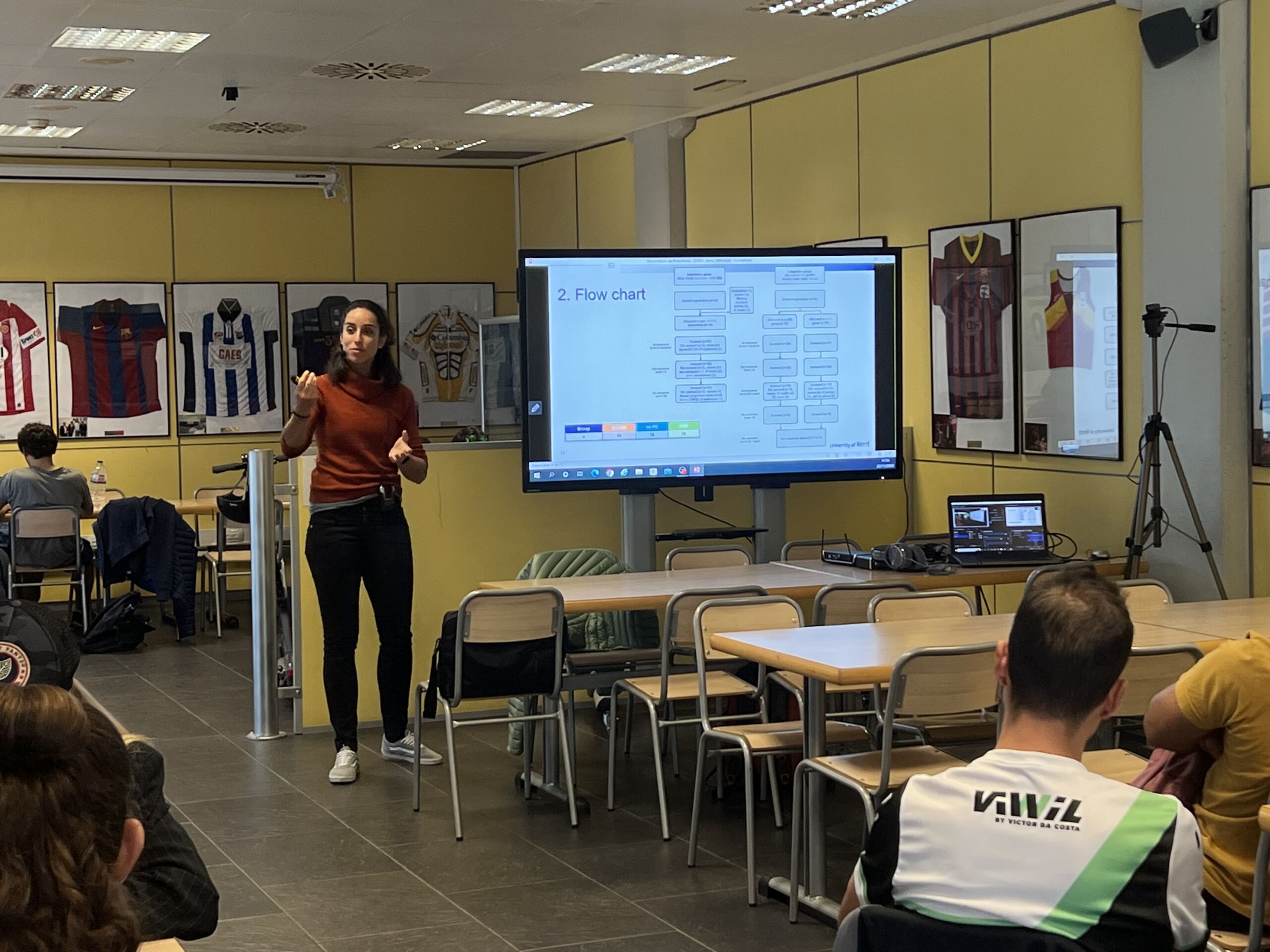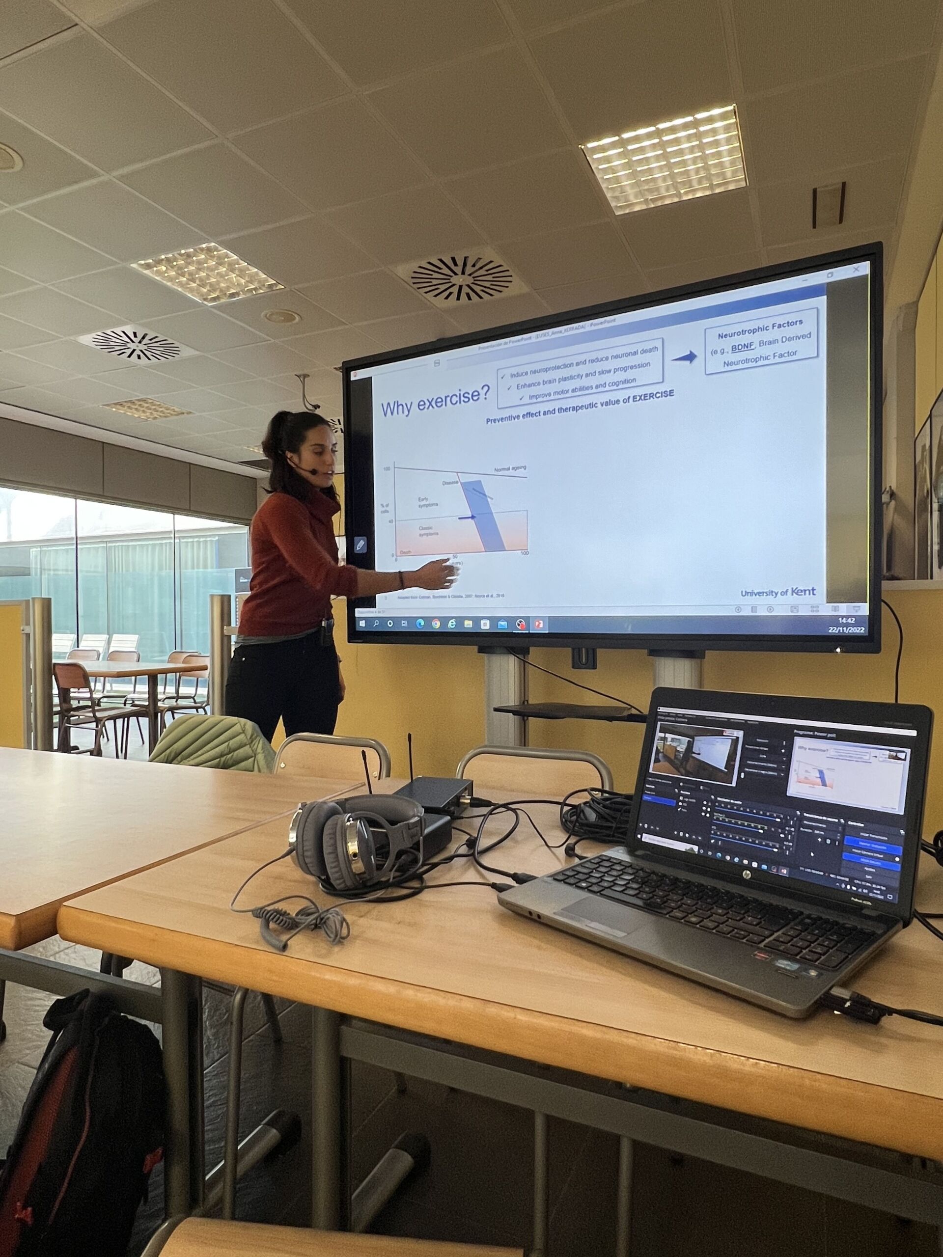 La Dra. Anna Ferrusola ha sido la ponente de la 16ª edición del Ciència a la Taula con la conferencia “Exercice as Disease-Modifying Strategy for Parkinson’s” que ha tenido lugar este martes en el Aula de Estudio. Estos ciclos de ponencias, como indica su nombre, están programados a la hora de comida y está pensado para que mientras se realiza la charla los asistentes puedan comer o hacer el café. La Dra. Anna Ferrusola, que es profesora de EUSES y ha completado el doctorado en la Universidad de Kent (UoK), explicó los principales hallazgos de su trabajo de investigación relacionado en la manera como el ejercicio físico afecta a las personas diagnosticadas con Parkinson.