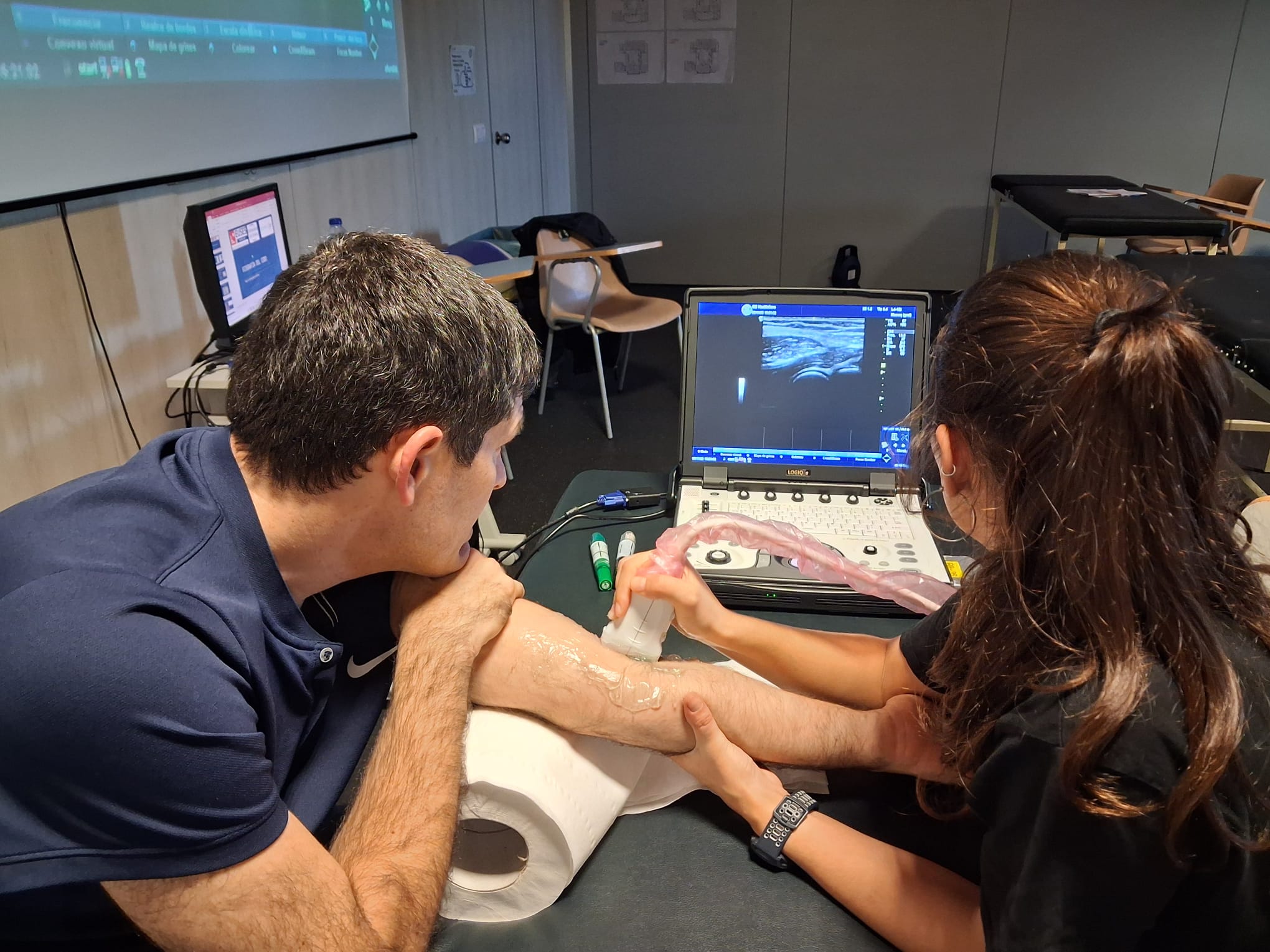 Durante la primera parte de este primer seminario, el Dr. Munné explicó los conceptos teóricos básicos necesarios para iniciar cualquier estudio ecográfico e hizo una breve introducción del funcionamiento de la aparatología que se usa en las exploraciones ecográficas. Una vez familiarizados con los ecógrafos y asimilados estos conceptos teóricos básicos, los participantes del curso, adoptando el rol de “fisioterapeuta-paciente”, tuvieron la oportunidad de realizar el estudio ecográfico sistemático de las estructuras anatómicas de toda la extremidad superior, centrándose especialmente en las áreas del hombro, antebrazo y muñeca. Durante la mañana del domingo el protagonismo fue por la extremidad inferior y los estudios se centraron básicamente en los compartimentos anterior y posterior del muslo.
