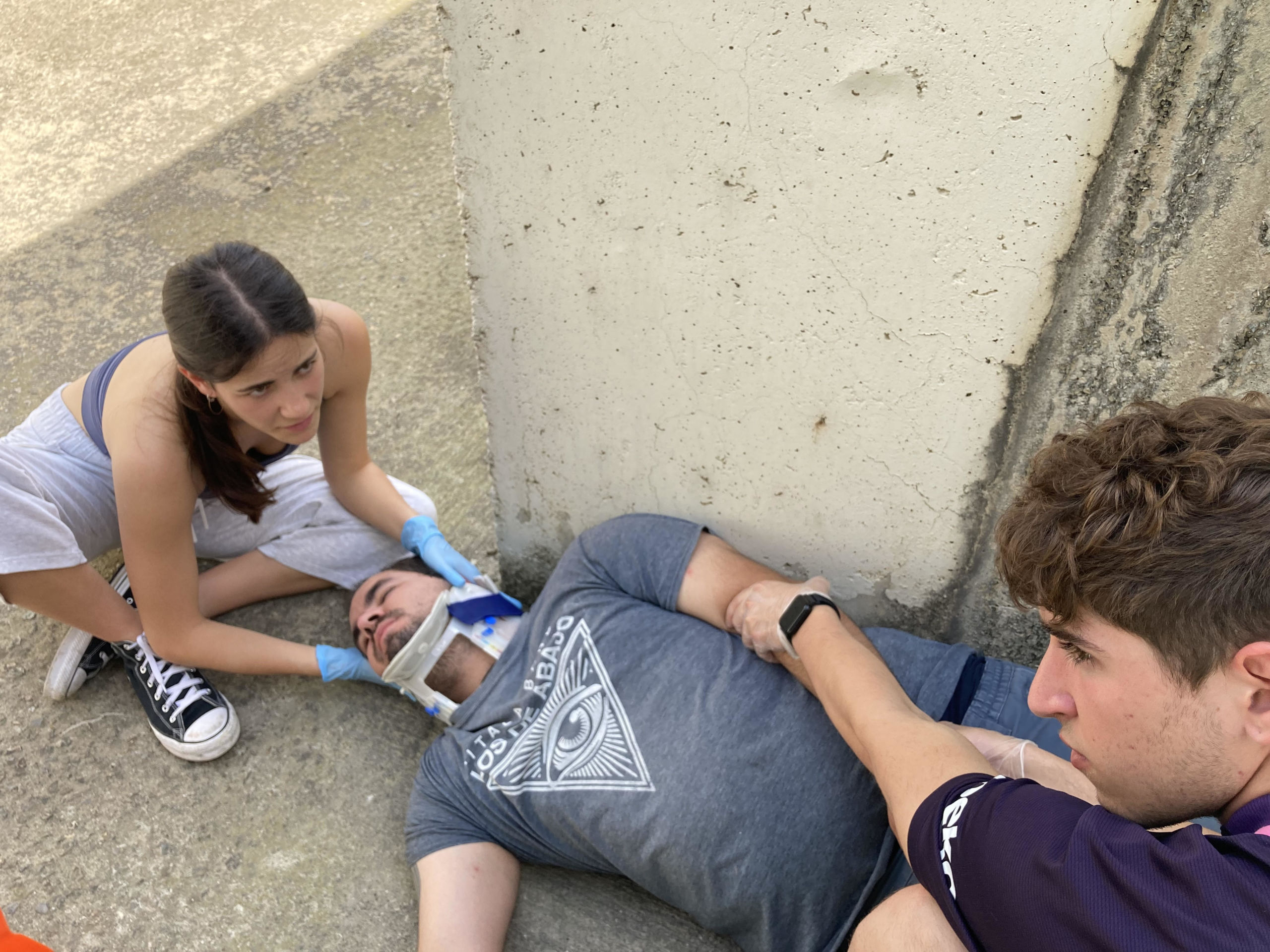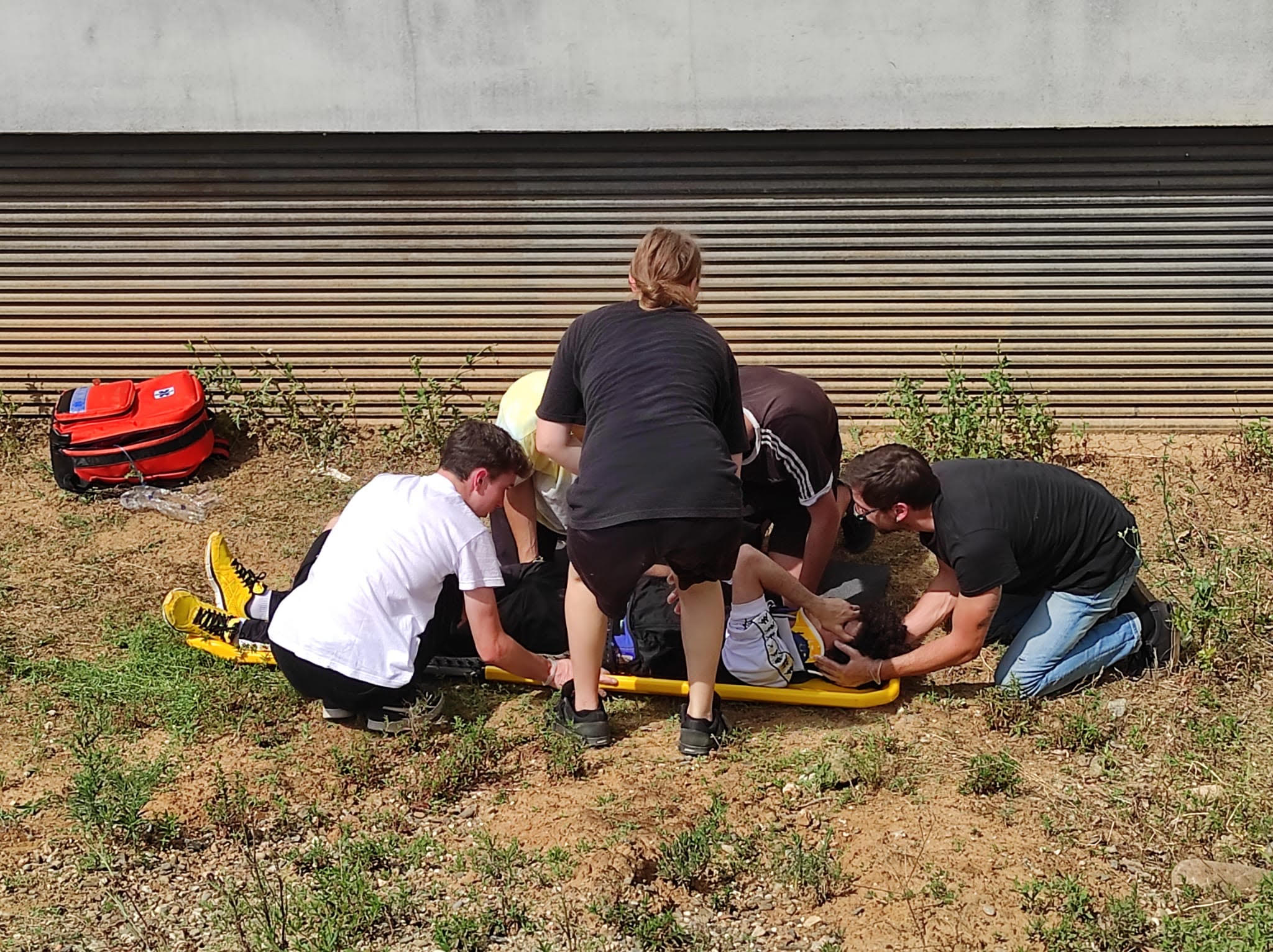 El primer caso práctico ha sido una simulación de un precipitado de 5 metros. En este taller, los alumnos han simulado dos dotaciones de unidad de apoyo vital básico y se ha valorado la comunicación y trabajo en equipo entre ellos. En esta estación se han encontrado a una señora de 40 años precipitada desde 5 metros de altura con una fractura de cúbito y radio y en una posición complicada para movilizar. Los alumnos han tenido que aplicar un log roll (giro en bloque) después de evaluar las lesiones y decidir cada paso a seguir entre todo el equipo.