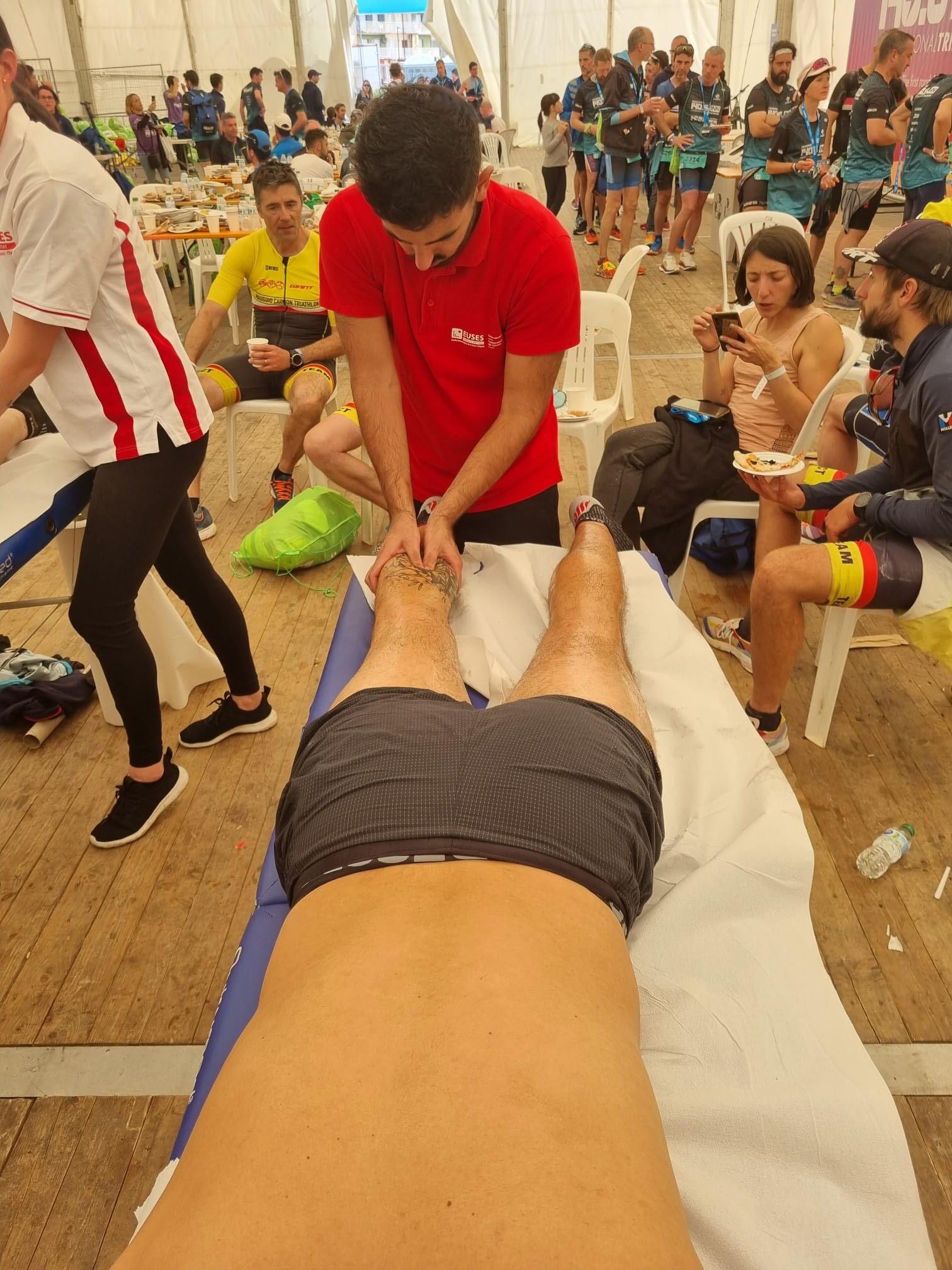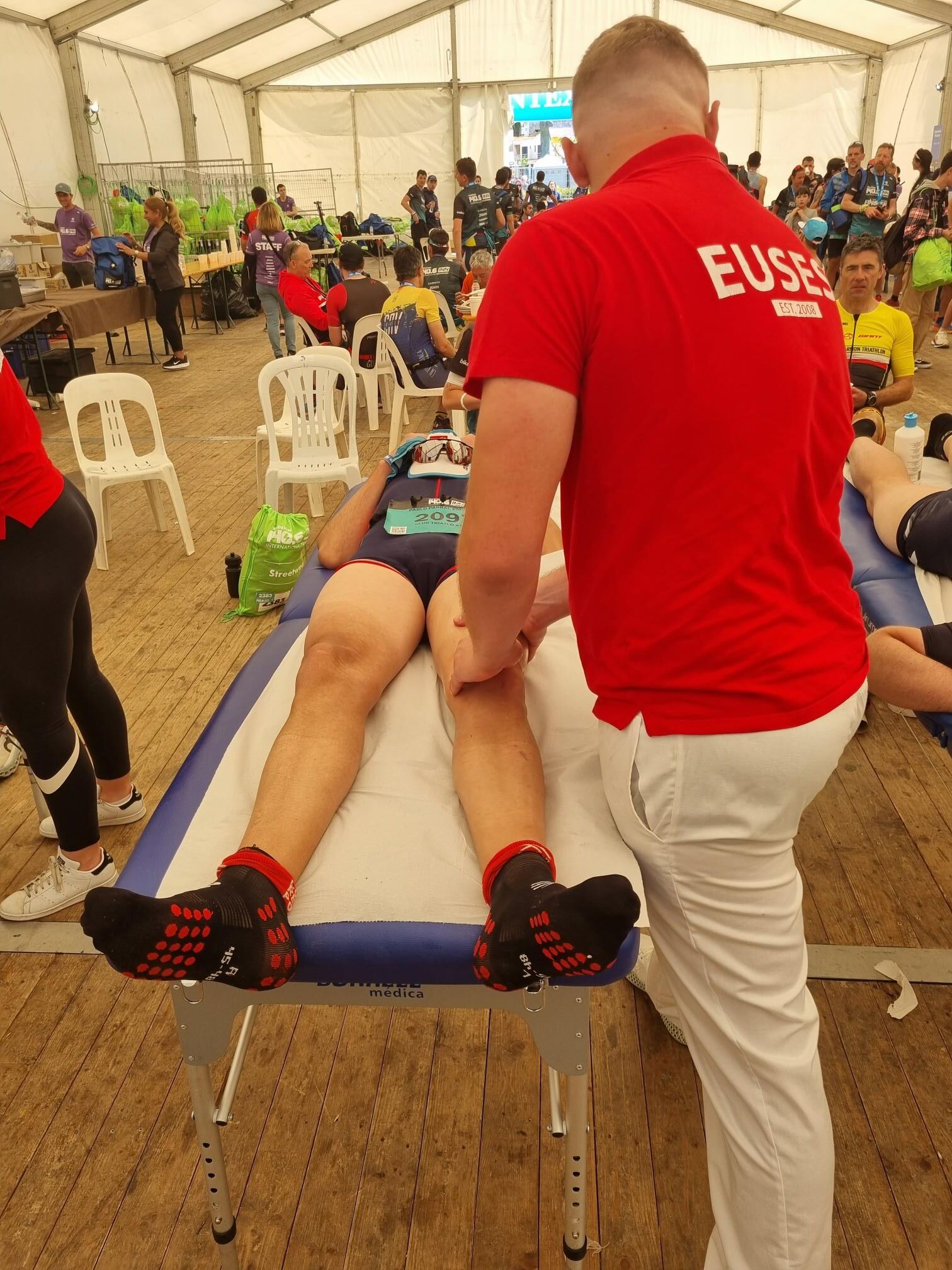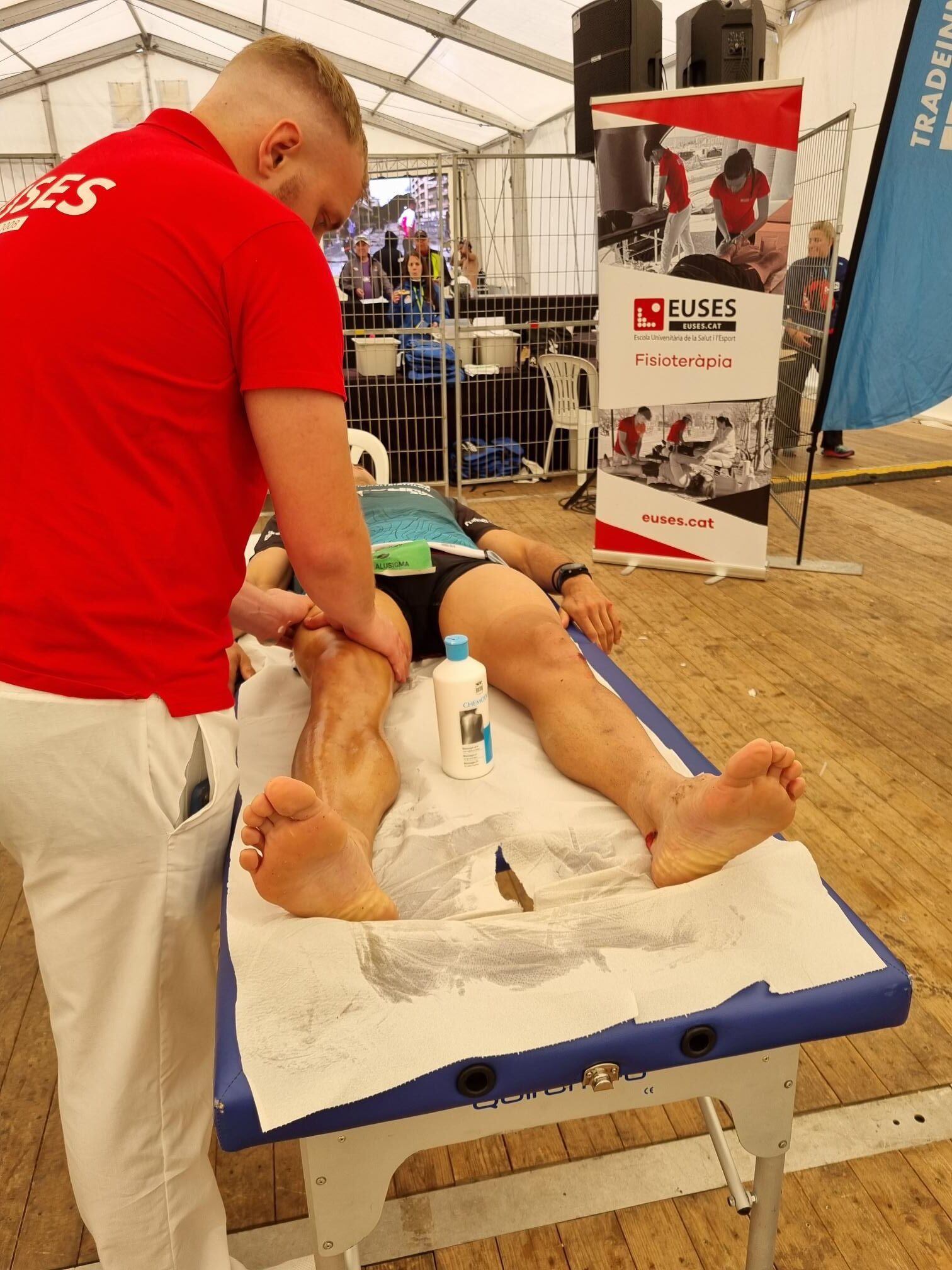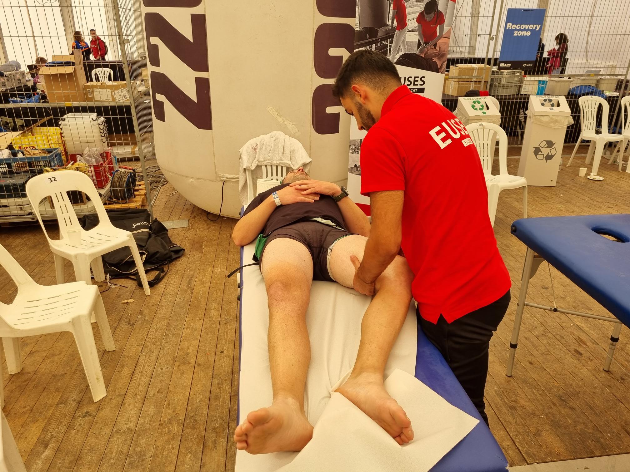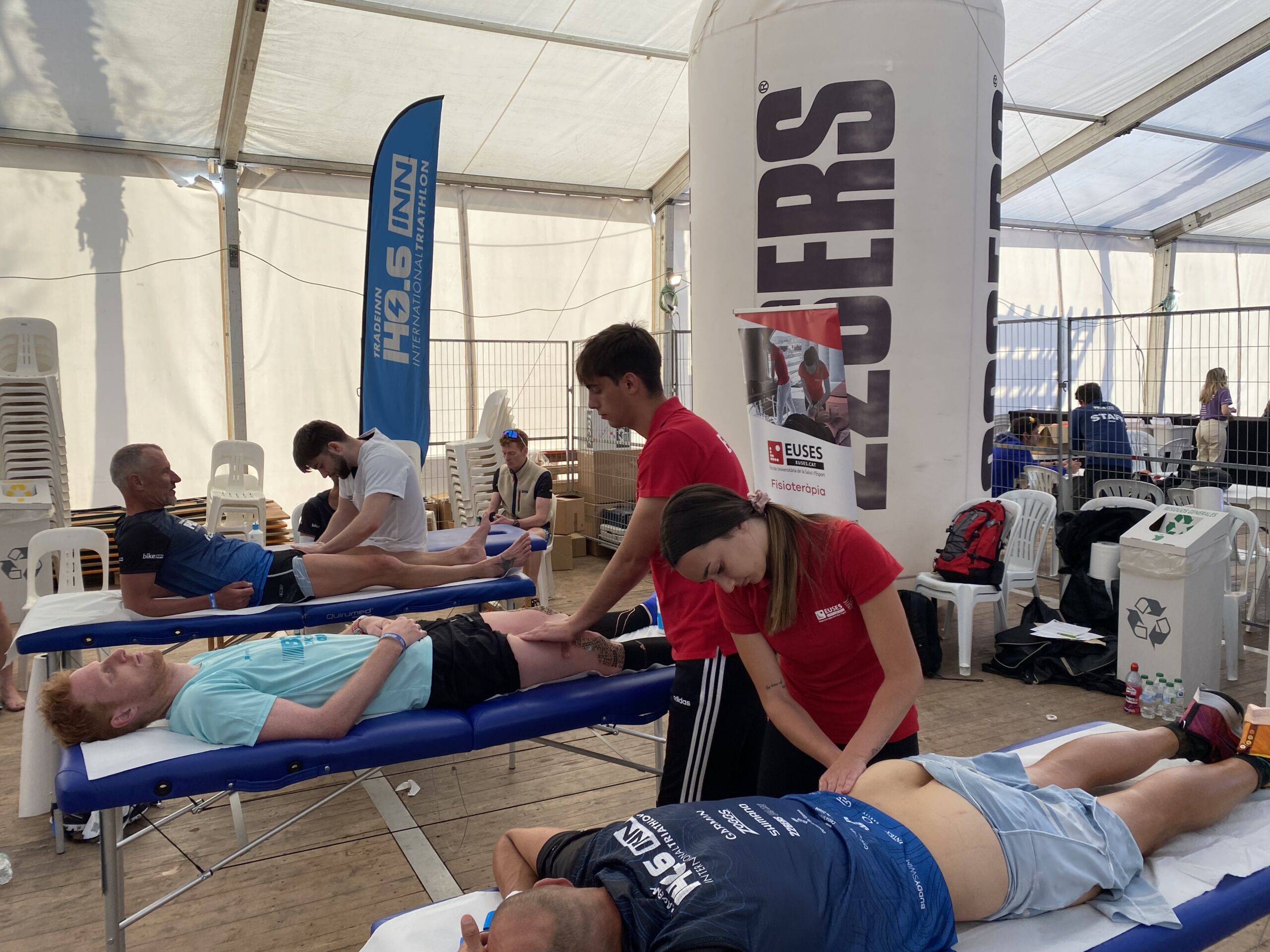 La Escola Universitària de la Salut i l’Esport se ha abocado en la 140.6INN, un acontecimiento organizado por Tradeinn y que ha constado de cuatro triatlones en un mismo fin de semana. Los más de 1.500 participantes han podido escoger entre cuatro recorridos: Road Full Distance (3,8 kilómetros de natación, 180 en bicicleta y 42,195 a pie); la Road Half Distance (1,9 kilómetros de natación, 90 en bicicleta y 21 a pie); la Gravel Half Distance (1,9 kilómetros de natación, 80 de Gravel y 17 de trail) y la Gravel Olympic Distance (1,5 kilómetros de natación, 35 de gravel y 10 de trail). Con el centro neurálgico en Platja d’Aro y un servicio de fisioterapia convenientemente habilitado cerca de la llegada, el contingente de EUSES veló por la recuperación muscular de los participantes con masajes, estiramientos y las actuaciones fisioterapéuticas pertinentes. Hubo tres turnos, tutorizados por dos fisioterapeutas de EUSES Alumni: David de la Barrera (primer turno del sábado) y Nerea Álvarez (segundo turno del sábado y turno del domingo). Los alumnos del Grado que realizaron el voluntariado fueron: Tom Laubertie, Anna Vila, Eva Morell, Valentín Miranda, Martí Figueres, Lucas Costeque y Júlia Serra.