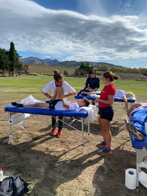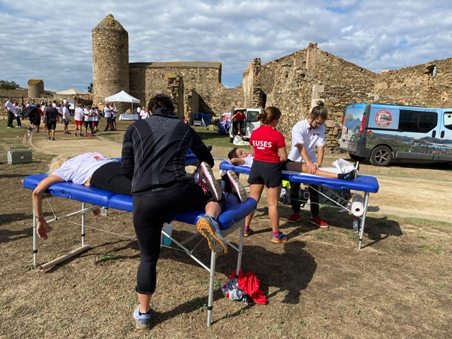Aquest cap de setmana s’ha celebrat a Roses una nova edició de la Cursa de la Dona i l’Escola Universitària de la Salut i l’Esport hi ha posat el seu gra de sorra amb un punt de servei de fisioteràpia al final de la cursa, en la zona d’arribada. Allà, el fisioterapeuta de l’EUSES Alumni Dídac Mayoral i els alumnes del Grau Esther Botterweg, Alice Degen i April Poupart han realitzat tècniques de recuperació muscular (massatges i estiraments) als participants que s’han acostat a la zona que s’ha habilitat especialment per aquestes tasques.