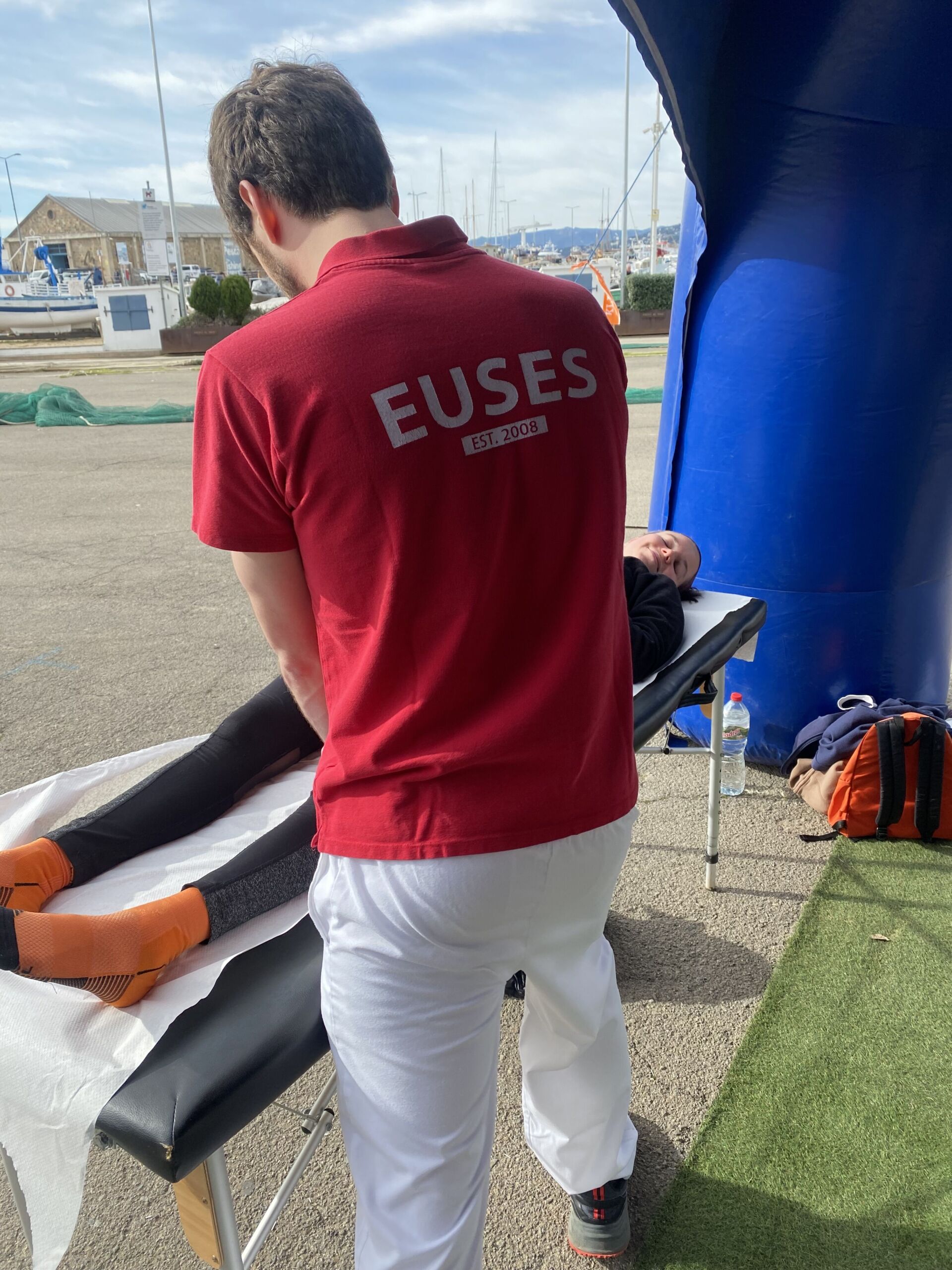 L’Escola Universitària de la Salut i l’Esport ha posat el seu gra de sorra en una nova edició del Trail Costa Brava amb la presència d’estudiants del Grau en Fisioteràpia que han recuperat els participants d’una prova celebrada aquest diumenge amb sortida i arribada a Palamós. Sota la supervisió del fisioterapeuta de l’EUSES Alumni Jonathan Duran, els alumnes Loic Souloumiac, Lluc Torrent, Estelle Roque, Aleix Darnés i Carlos Verheyen Maynau han realitzat tècniques de recuperació muscular (bàsicament massatges i estiraments) en una zona convenientment habilitada a l’arribada, a la zona de l’estenedor de xarxes. Els esportistes van poder escollir entre tres recorreguts: el Marató (42 quilòmetres i 2.000 metres de desnivell positiu), el Trail (21 quilòmetres i 700 metres de desnivell) i l’Express (12,5 quilòmetres i 400 metres de desnivell).