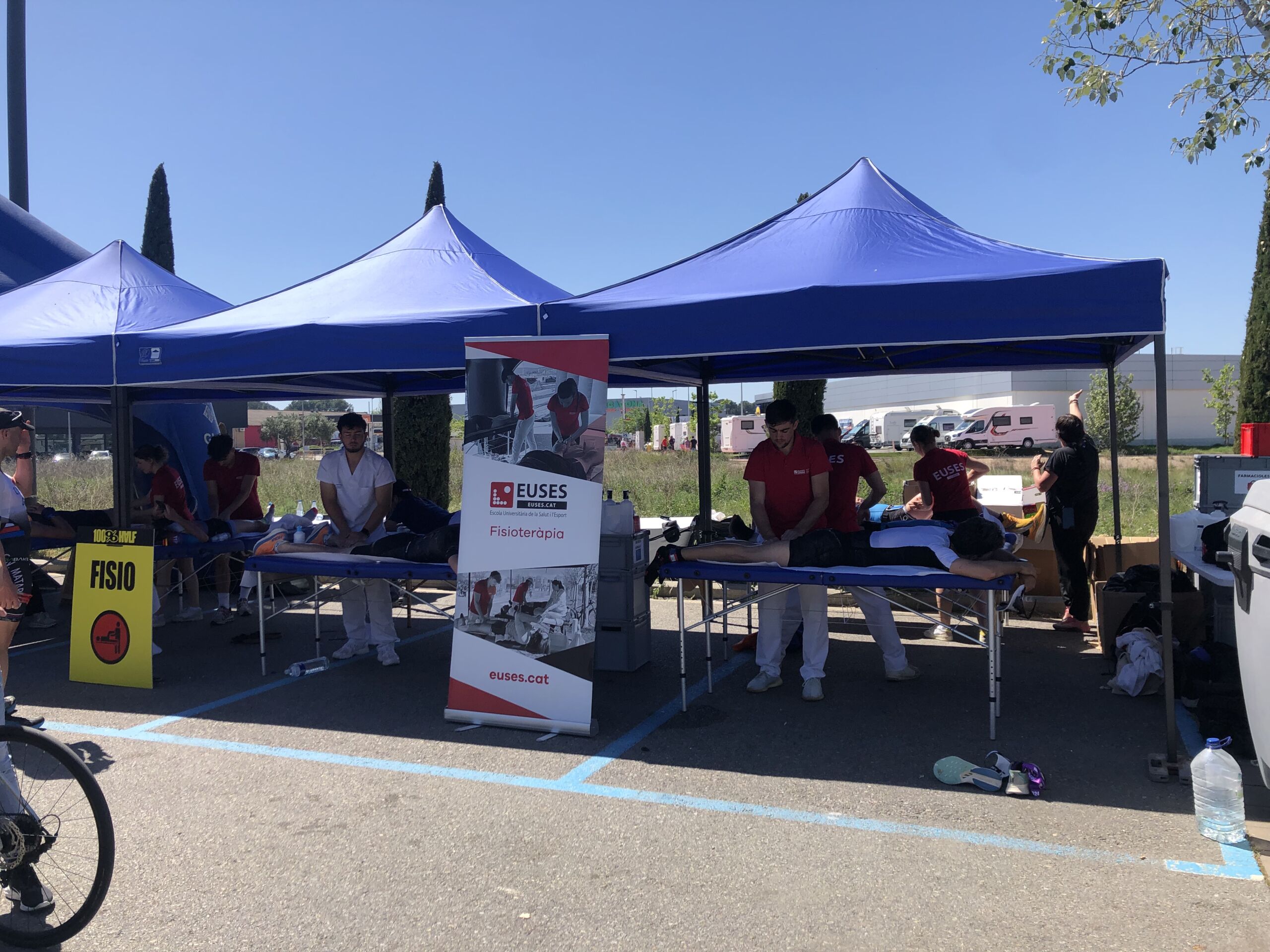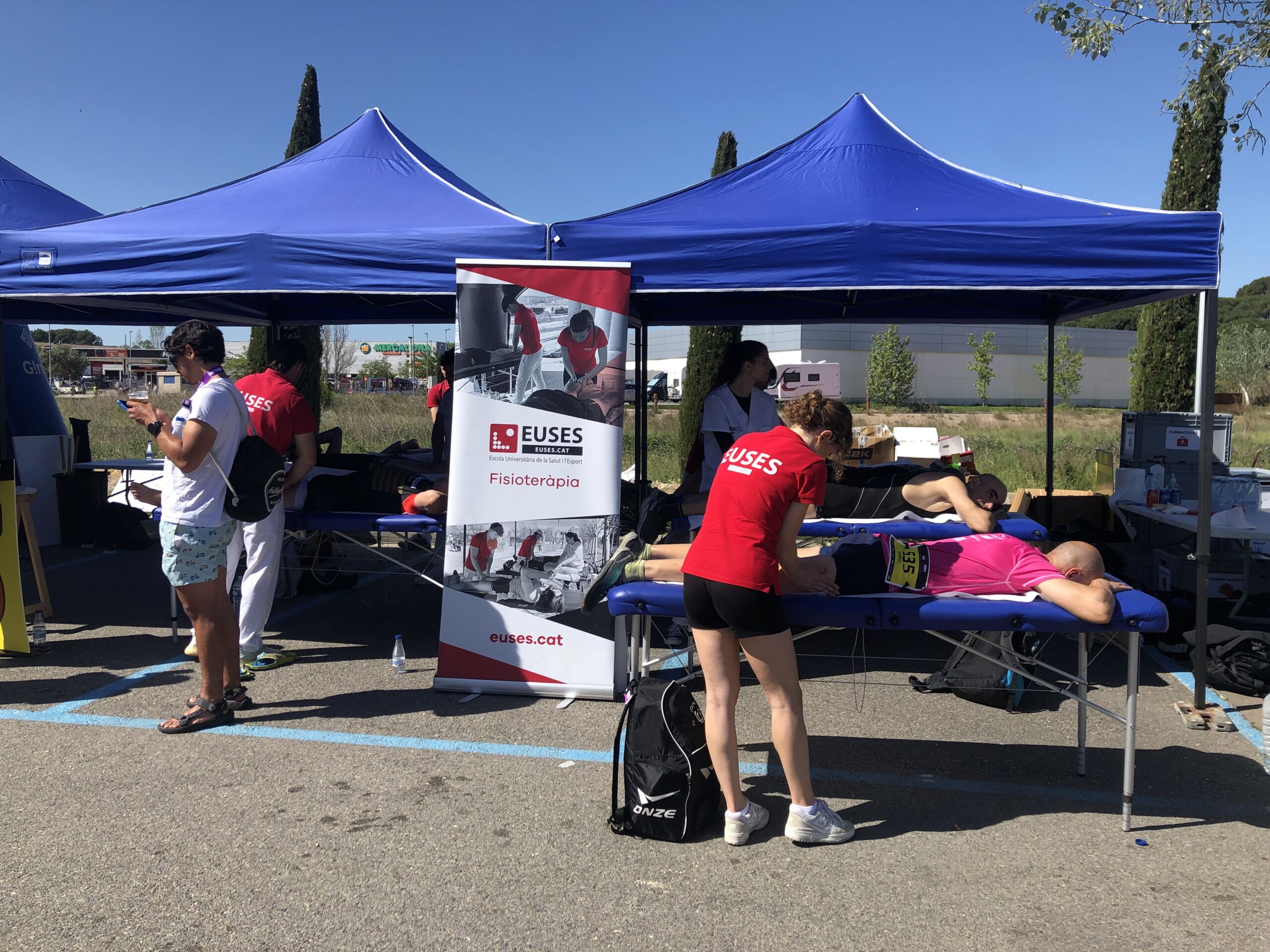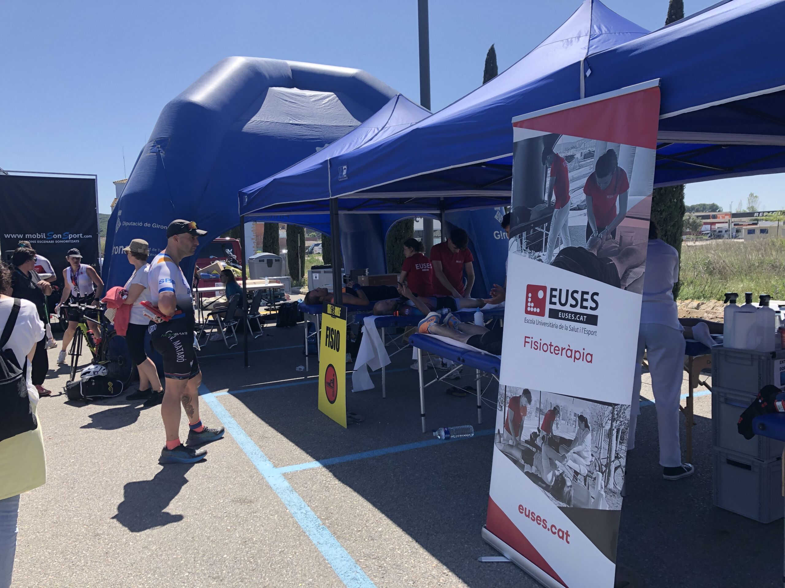 Aquest diumenge s’ha celebrat una nova edició del 100%100 Half l’Escala, una prova en la qual els participants han pogut escollir entre tres modalitats de triatló (Sprint: 750 metres nedant, 20 quilòmetres en bicicleta i 5 de cursa a peu; Olympic: 1,5 km, 40 km i 10 km; i Half: 1,9 km, 81 km i 21 km) i dues d’Aquabike (la M: 1,5 quilòmetres nedant i 40 en bicicleta i la L: 1,9 km i 81 km). L’Escola Universitària de la Salut i l’Esport hi ha col·laborat amb un servei de fisioteràpia a prop de la línia de l’arribada (pàrquing del Rec del Molí) perquè els participants poguessin descarregar-se muscularment després de l’esforç. Allà, i sota la supervisió de la fisioterapeuta d’EUSES Alumni Alba Garcia, els estudiants del Grau que han realitzat massatges i estiraments han estat Pauline Fretigny, Camille Chambonnière, Enzo Cavalier, Martin Benard, Albane Danvel, David Tran, Quentin Benoit i Ànnia Massaguer.