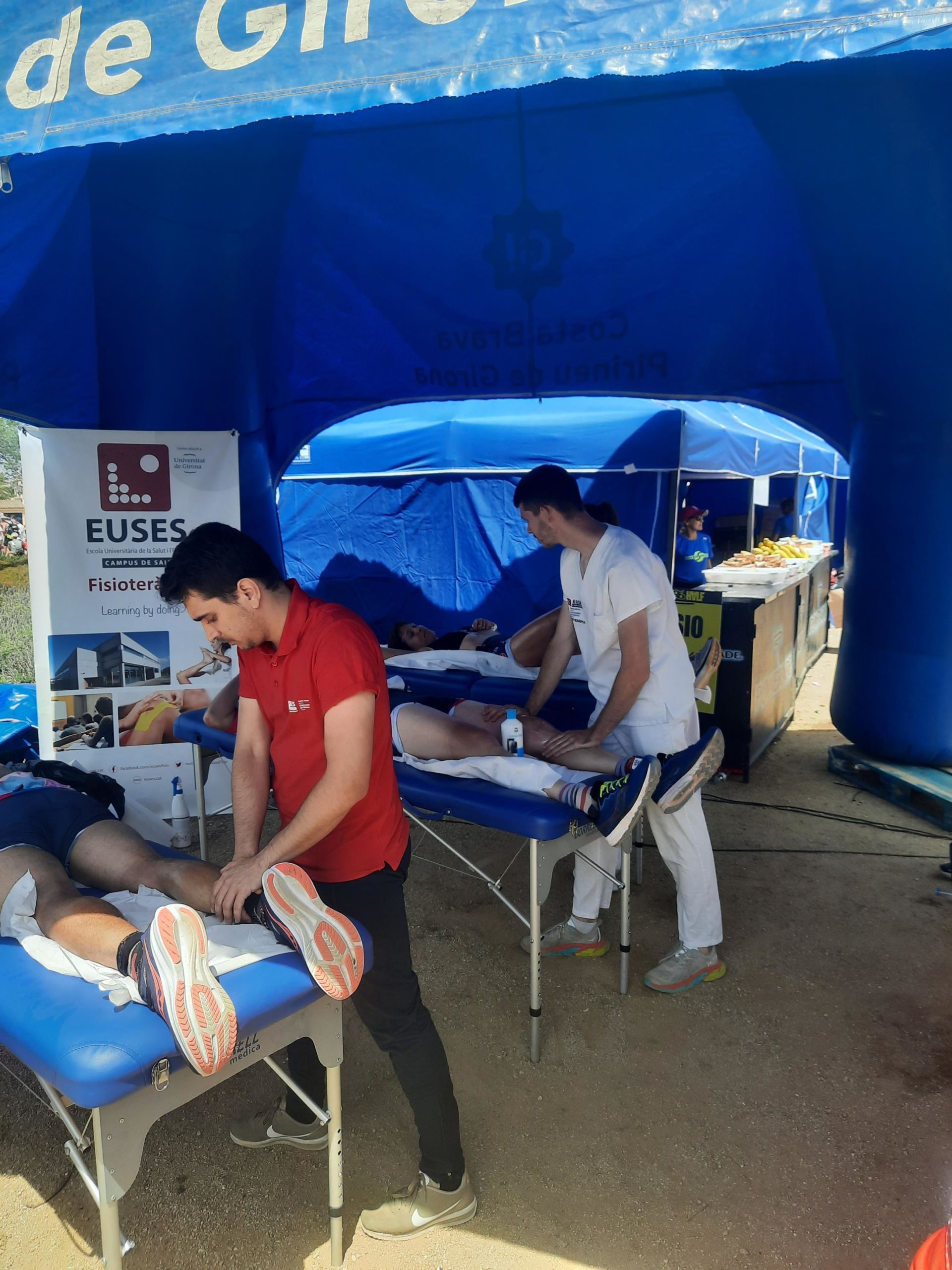 Aquest cap de setmana s’ha celebrat una nova edició del Triatló d’Empuriabrava, organitzada per 100%Half, en la qual l’Escola Universitària de la Salut i l’Esport hi ha col·laborat en la recuperació dels participants, que han pogut escollir entre quatre modalitats diferents: Sprint (750 metres nedant, 20 quilòmetres en bicicleta i 5 quilòmetres de cursa a peu); Olympic (1,5 quilòmetres de natació, 40 en bicicleta i 10 de cursa a peu; l’Aquabike (1,9 quilòmetres nedant i 90 en bicicleta) i la Half (1,9 quilòmetres nedant, 90 en bicicleta i 21 quilòmetres més a peu). Sota les directrius de la fisioterapeuta d’EUSES Alumni Sandra Martínez, els estudiants del Grau en Fisioteràpia que han realitzat massatges i estiraments als participants en una zona habilitada prop de l’arribada, al passeig marítim d’Empuriabrava, han estat Maxime Torres (dissabte i diumenge), Marine Fuzier (dissabte) i Marine Vialle y Paul Clément (diumenge).