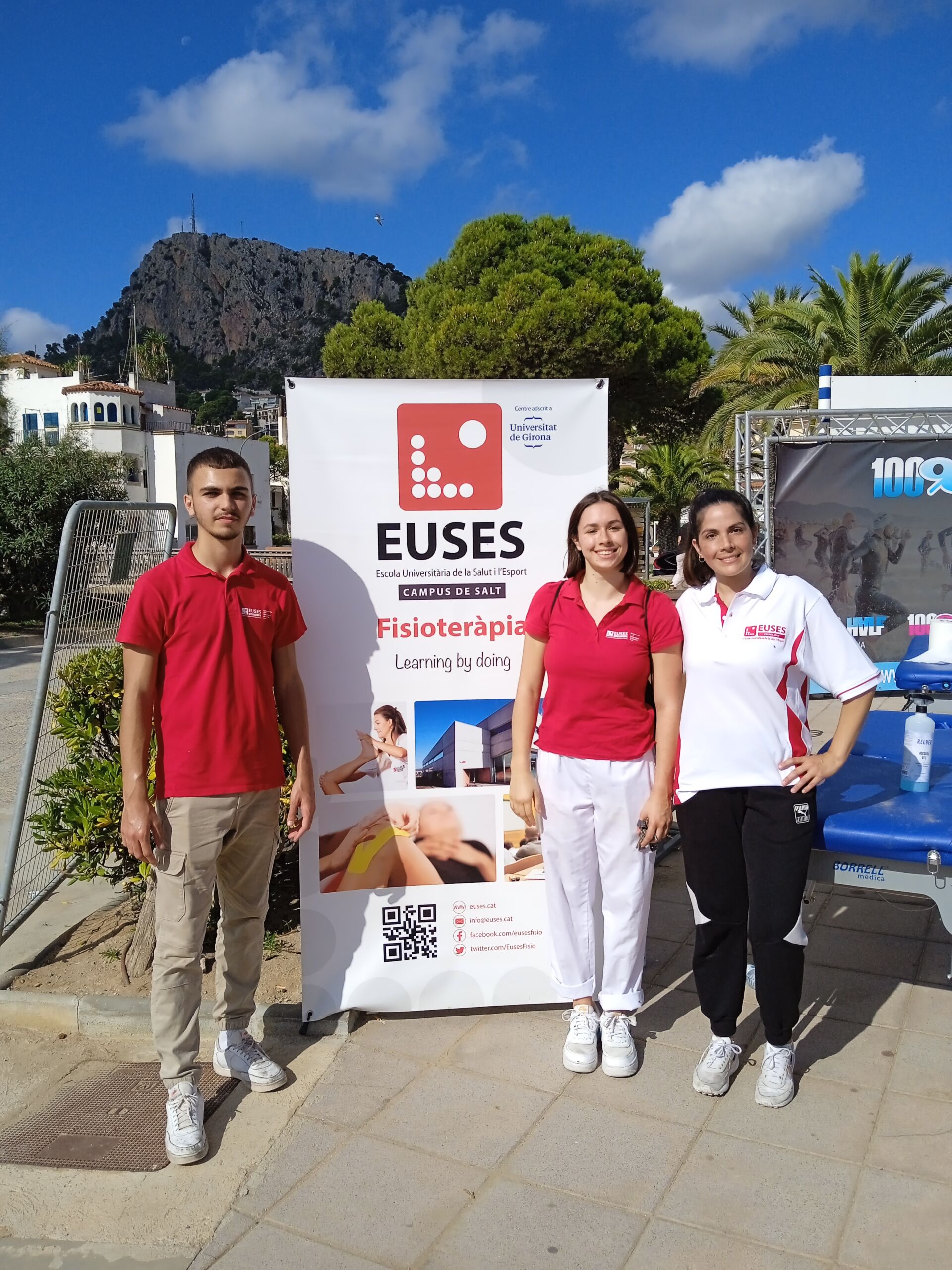 Sota les directrius de la fisioterapeuta d’EUSES Alumni Daniela Mamani, els estudiants del Grau en Fisioteràpia Emma Oberto i Pablo Gontard han recuperat muscularment els triatletes que van partitipar en la Half Estartit, una prova en qual els esportistes van poder escollir entre la distància Sprint (750 metres nedant, 20 quilòmetres en bicicleta i 5 quilòmetres a peu) i l’Olímpica (1,5 quilómetres nedant, 40 en bicicleta i 10 a peu). En una zona habilitada en la Plaça de la Llevantina, molt a prop de l’arribada, els representants de l’EUSES van realitzar massatges i estiraments als participants.