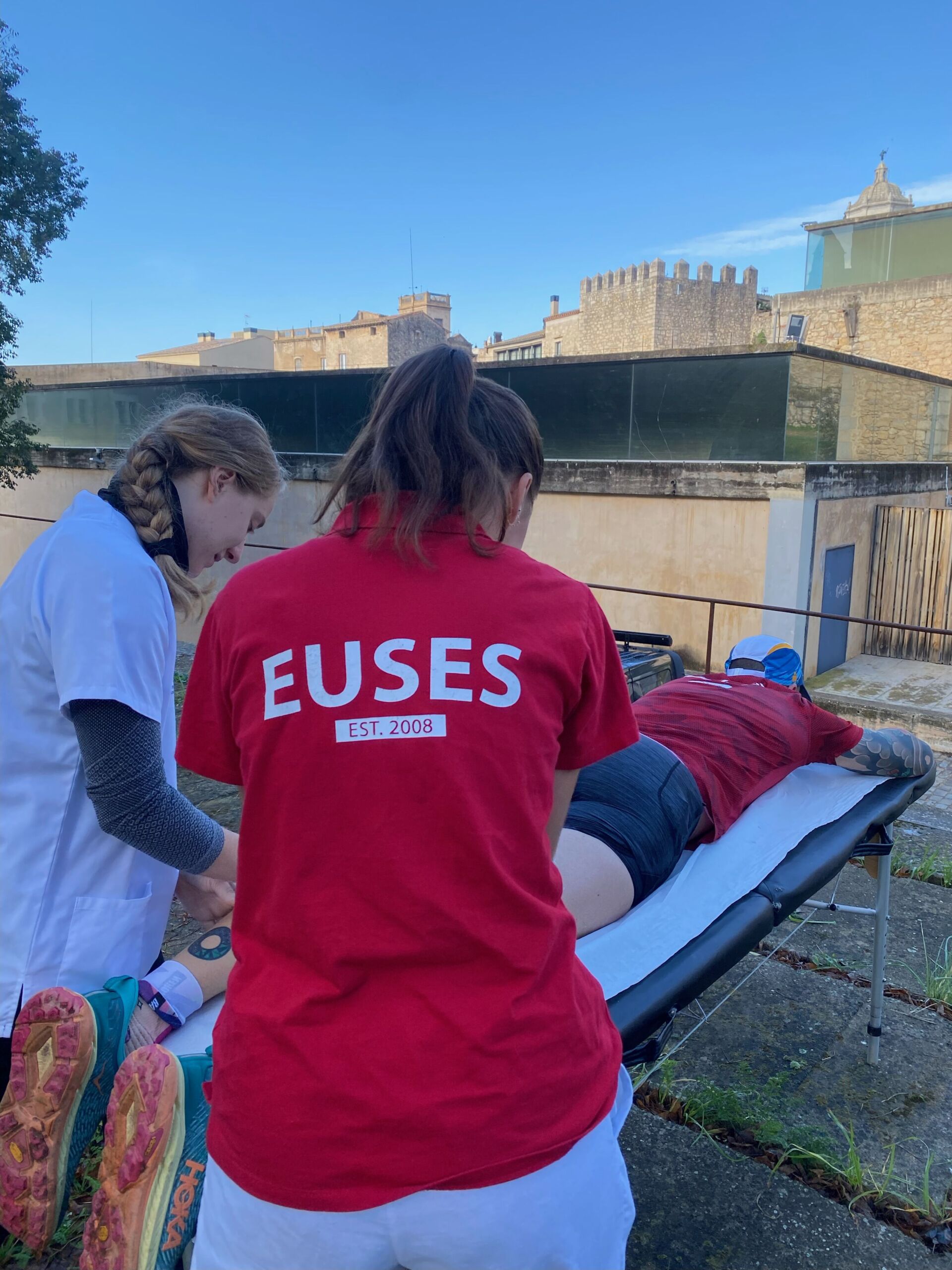 Un any més, l’Escola Universitària de la Salut i l’Esport ha col·laborat en la Cursa de Muntanya de Girona (CMG) , una competició organitzada per Klassmark, situant un punt de servei de fisioteràpia en la zona d’arribada, a la Plaça de Sant Domènec. Els participants van poder escollir entre tres recorreguts: l’express (12,7 quilòmetres i 500 metres de desnivell); el Trail (21,5 quilòmetres i 800 metres de desnivell) i la Transgavarres, que va ser de llarg el recorregut més exigent (50 quilòmetres i 1.700 metres de desnivell). Sota la tutela del fisioterapeuta de l’organització i d’EUSES Alumni, Jonathan Duran, els estudiants del Grau en Fisioteràpia que al final de la prova van realitzar tècniques de recuperació muscular (massatges i estiraments) als participants van ser Camille Andreu, Emma Benoit, Camille Loiret, Noémy Rybak, Sabine Duprat, Maëva Chanas, Sam Richard, Charlotte Fabre, Mar Mascaró I Laura Dion.