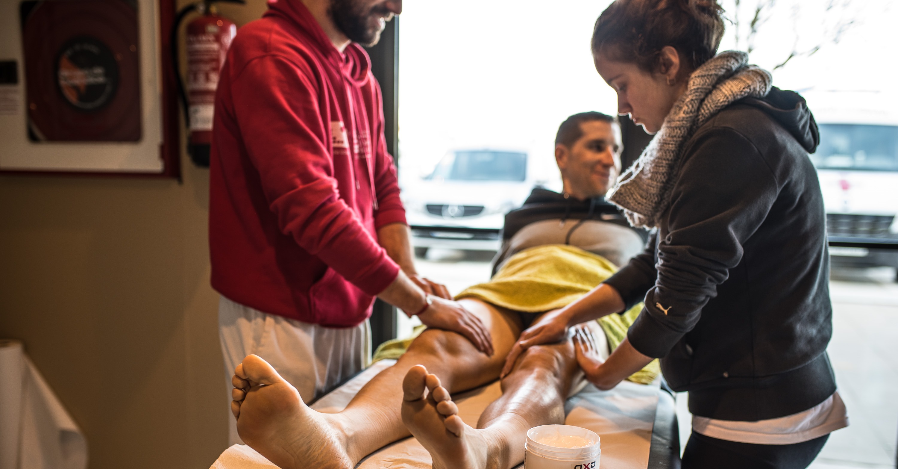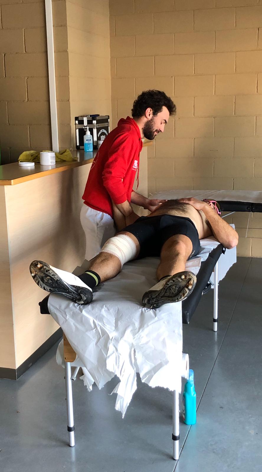 L’Escola Universitària de la Salut i l’Esport ha posat el seu gra de sorra en la cursa de BTT La Santa Vall, una prova que ha tingut l’epicente a Sant Gregori (lloc de sortida i arribada de les diferents curses) però que ha dut els ciclistes per indrets i corriols de la Vall del Llèmana. Els participants han pogut escollir entre diferents itineraris (el Marathon, amb 70 quilòmetres i 1.700 metres de desnivell; l’Starter, de 36 quilòmetres i 1.000 metres de desnivell; l’Adventure, de 95 quilòmetres i 900 metres de desnivell; i l’Adventure Starter, de 55 quilòmetres i 600 metres de desnivell). Al final de la prova, i sota la supervisió del fisioterapeuta d’EUSES Alumni Sebastián Fidalgo, els estudiants del Grau en Fisioteràpia Pierre Baldit, Léa Tagliante, Victoria Talou i Anais Courthaliac han realitzat tècniques de recuperació muscular (bàsicament massatges i estiraments) als participants en una zona habilitada al pavelló, al costat de l’arribada.