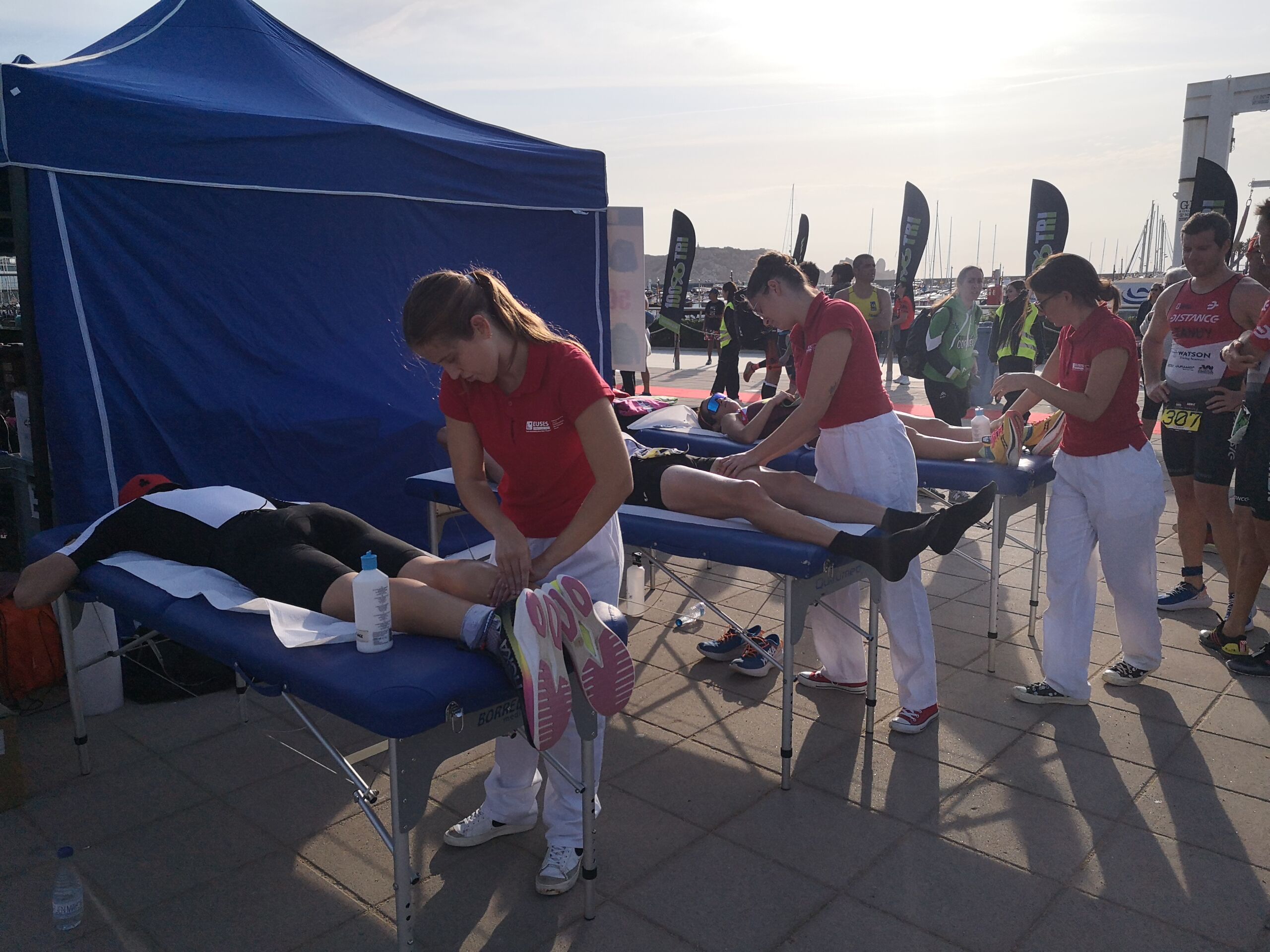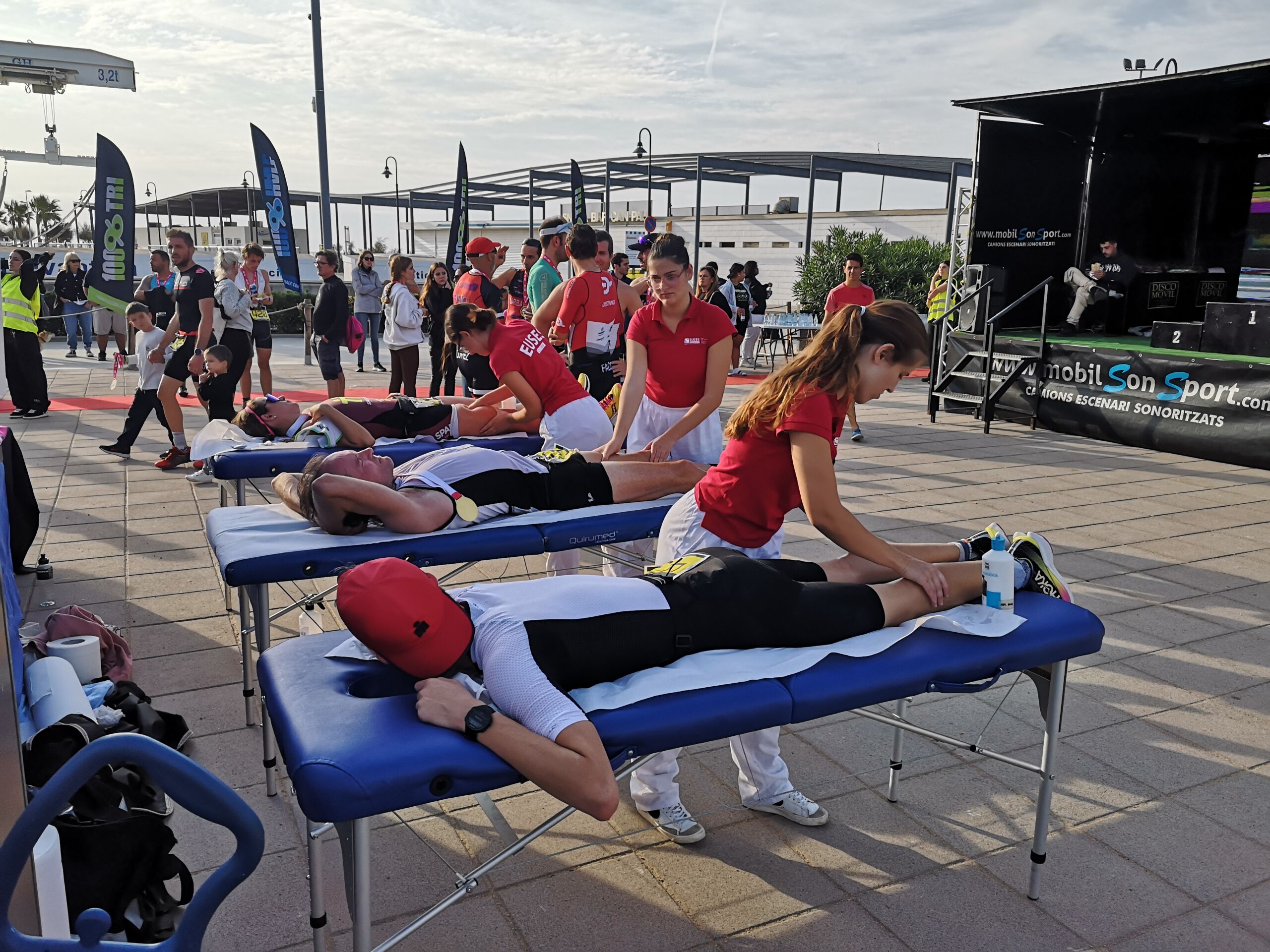 L’Escola Universitària de la Salut i l’Esport ha col·laborat en una nova edició de la 100×100 Half Estartit, que ha constat de dues triatlons i una Aquabike. Els participants han pogut escollir entre la triatló Sprint (750 metres de natació, 20 quilòmetres en bicicleta i 5 quilòmetres de cursa a peu) i la Olympic (1,5 quilòmetres de natació, 40 quilòmetres en bicicleta i 10 quilòmetres de cursa a peu) i l’Aquabike (1,5 quilòmetres de natació i 40 quilòmetres en bicicleta). Al final de la cursa, en la Platja de la Llevantina, s’ha instal·lat un punt de fisioteràpia on la fisioterapeuta d’EUSES Alumni Anna Besa ha supervisat les tècniques de recuperació muscular realitzades pels estudiants del Grau Lison Deville, Eloise Garcia i Irene Cubarsí.