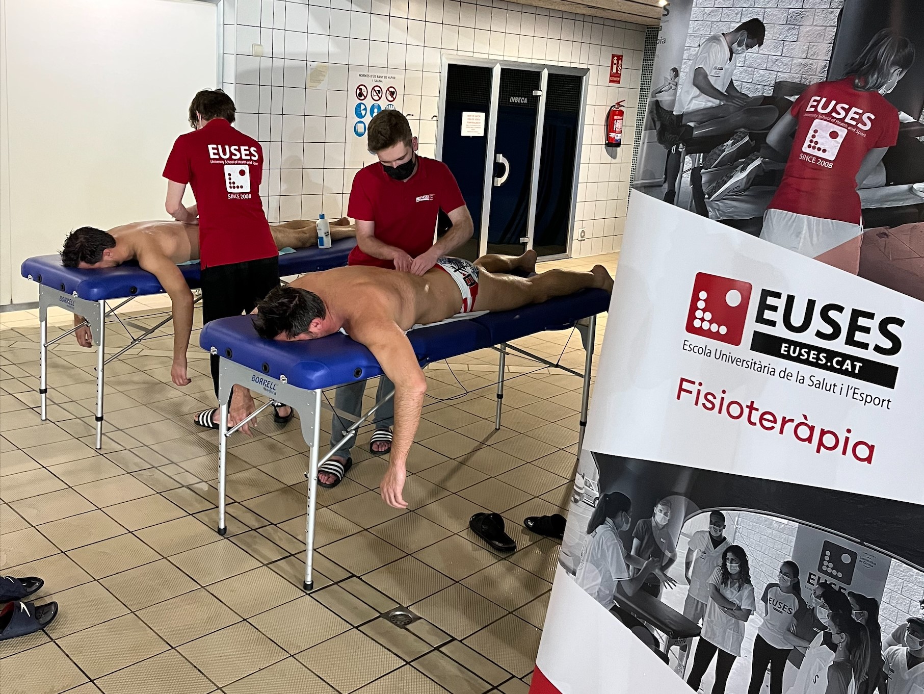 Sota la supervisió del fisioterapeuta d’EUSES Alumni Daniel Mut, els estudiants del Grau en Fisioteràpia Jérémy Galonnier i Hugo Philippon han col·laborat en la recuperació dels nedadors del 7è Trofeu Màster Swimfaster que s’ha celebrat a la piscina municipal de Salt aquest dissabte dia 19 de febrer i que era la setena etapa del Circuit Català. Ells representants de l’Escola Universitària de la Salut i l’Esport van realitzar massatges i estiraments musculars als participants en una zona convenientment habilitada dins el mateix recinte.