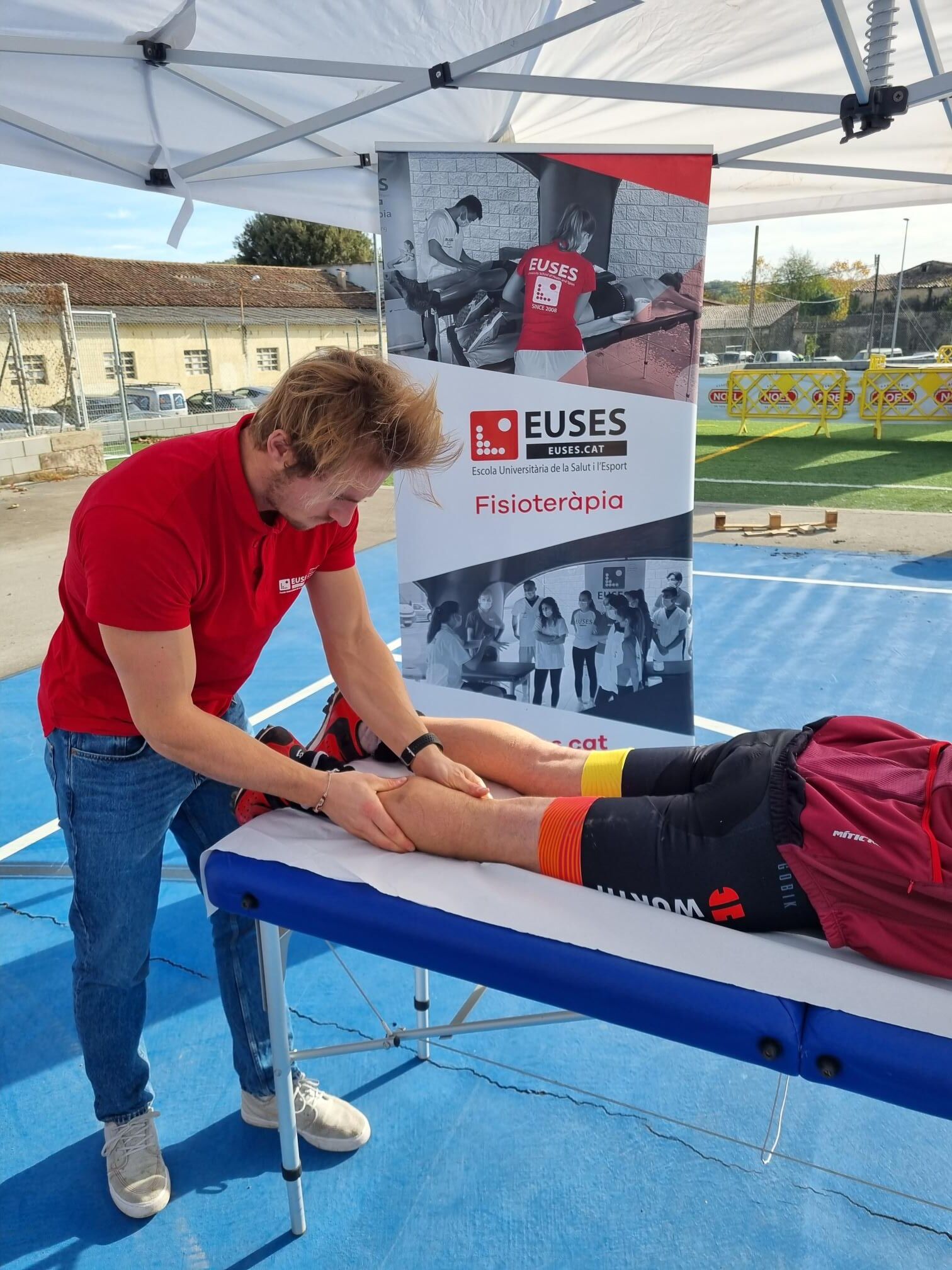 Sota la supervisió del fisioterapeuta de l’EUSES Alumni David de la Barrera, l’estudiant del Grau Bastien Reynaud va recuperar muscularment els participants de la Volcanolímits Bike, una prova de BTT que s’ha celebrat aquest cap de setmana a la Garrotxa i que ha tingut el punt de sortida i arribada a Les Planes d’Hostoles. Els ciclistes van poder escollir entre un recorregut Marathon (41 quilòmetres i 1.500 metres de desnivell positiu) o l’Sprint (22 quilòmetres i 630 metres de desnivell). Al final de la prova i en una zona habilitada al pavelló, els representants d’EUSES van realitzar massatges i estiraments als participants que així ho van desitjar.