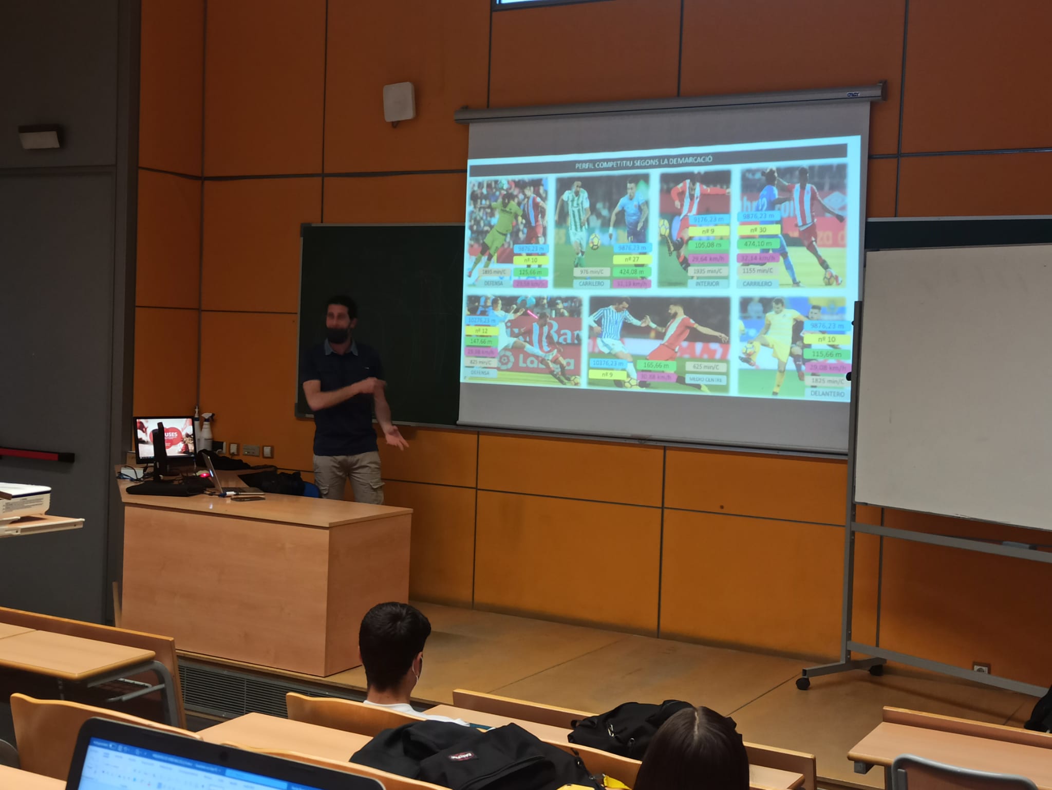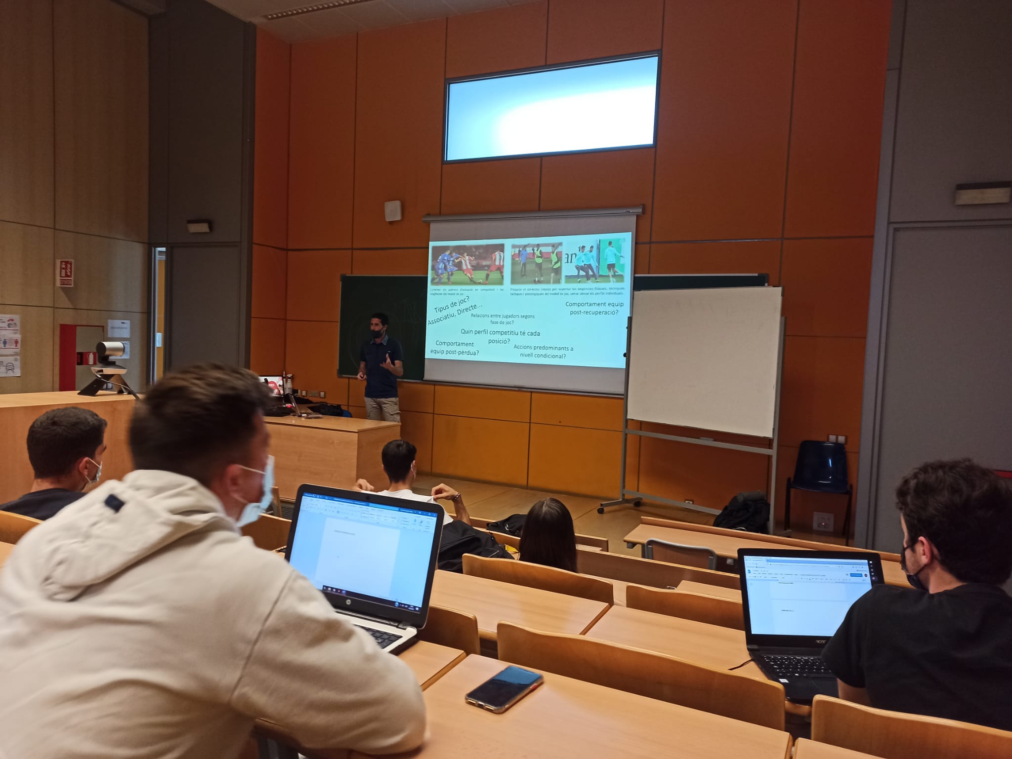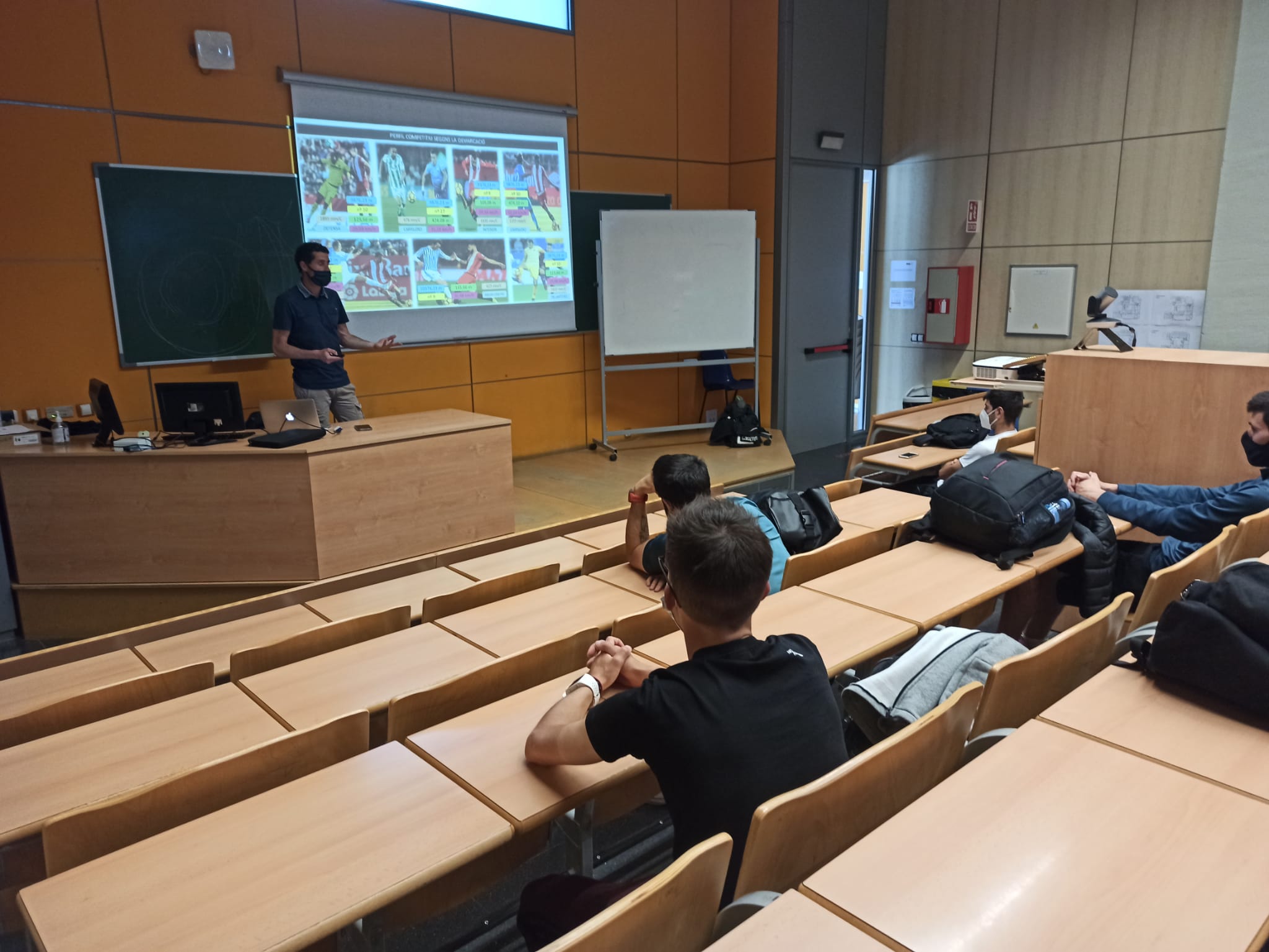 Els estudiants de 3r curs del Grau en Ciències de l’Activitat Física i de l’Esport de l’assignatura d’Esports d’Equip 2-Futbol que imparteix el professor Jordi Grabulosa han gaudit aquest dijous de la presència d’un preparador físic de primer nivell com es Jordi Balcells. El lloretenc, que va estar més d’una dècada vinculat al Girona FC, on va començar en el futbol de base i va acabar portant la preparació física del primer equip, ha parlat precisament sobre la seva experiència en el futbol professional després d’estar els últims anys a primera línia encarregant-se de la preparació física d’equips de la màxima categoria com el mateix Girona, el Sevilla, l’Espanyol i l’Alavés. En tots els casos, Jordi Balcells ha estat integrat en l’equip tècnic liderat per Pablo Machín.