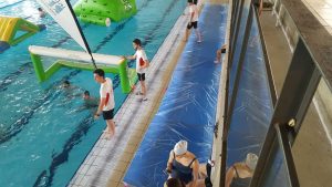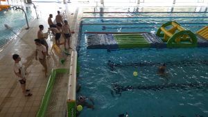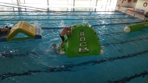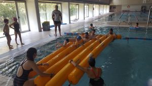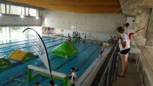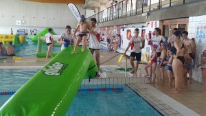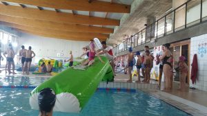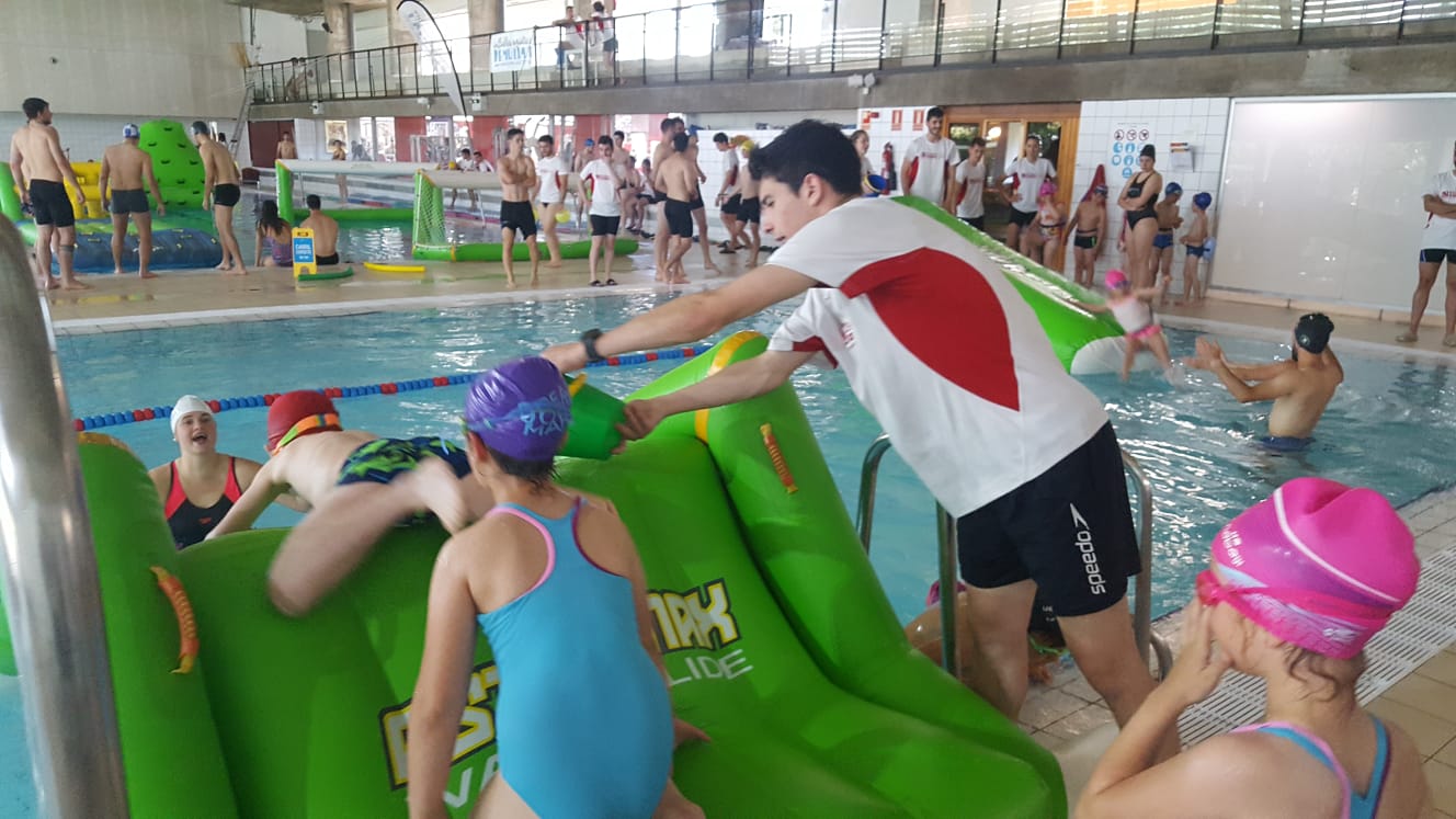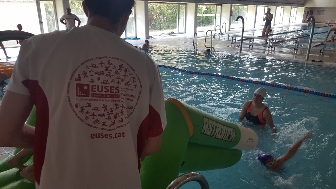 La piscina municipal de Salt es va convertir aquest passat dimecres en un gran Parc Aquàtic organitzat pels alumnes de 3r curs del Grau en Ciències de l’Activitat Física i l’Esport amb la col·laboració de l’empresa Remulla’t, que ha cedit tot el material. L’activitat s’ha emmarcat en l’assignatura d’Esports Aquàtics que imparteix el professor Jordi Arteman i els estudiants s’han encarregat de tot l’operatiu de muntatge i desmuntatge del material així com de la vigilància del recinte durant tota la jornada. El parc, molt complert, constava una tirolina, una corda d’escalada, una pista lliscant, una pista d’obstacles, un inflable, una zona de mini waterpolo i altres activitats com el Aquarock i Moonwalk.