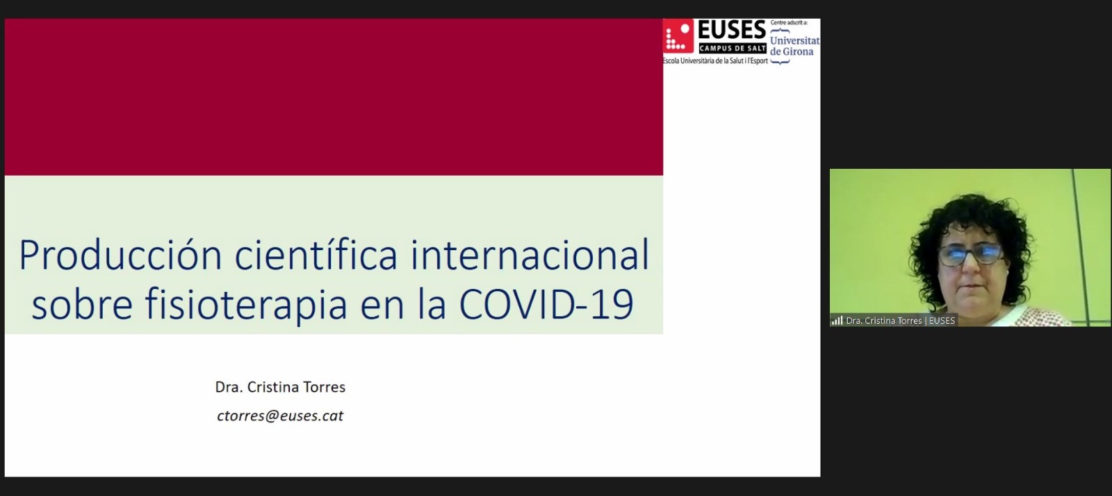 La Dra. Cristina Torres ha parlat de “Producció científica internacional sobre fisioteràpia en la Covid-19” i ha analitzat la literatura científica indexada en MEDLINE (2020) des d’una vessant bibliomètrica. En la seva conferència, la Dra. Torres, que a l’EUSES imparteix les assignatures de Massoteràpia (2n), Teràpies Holístiques en Fisioteràpia (4t) i Treball de fi de Grau (4t), ha destacat la falta de publicacions amb bons nivells d’evidència científica i la necessitat d’investigar en col·laboració internacional.