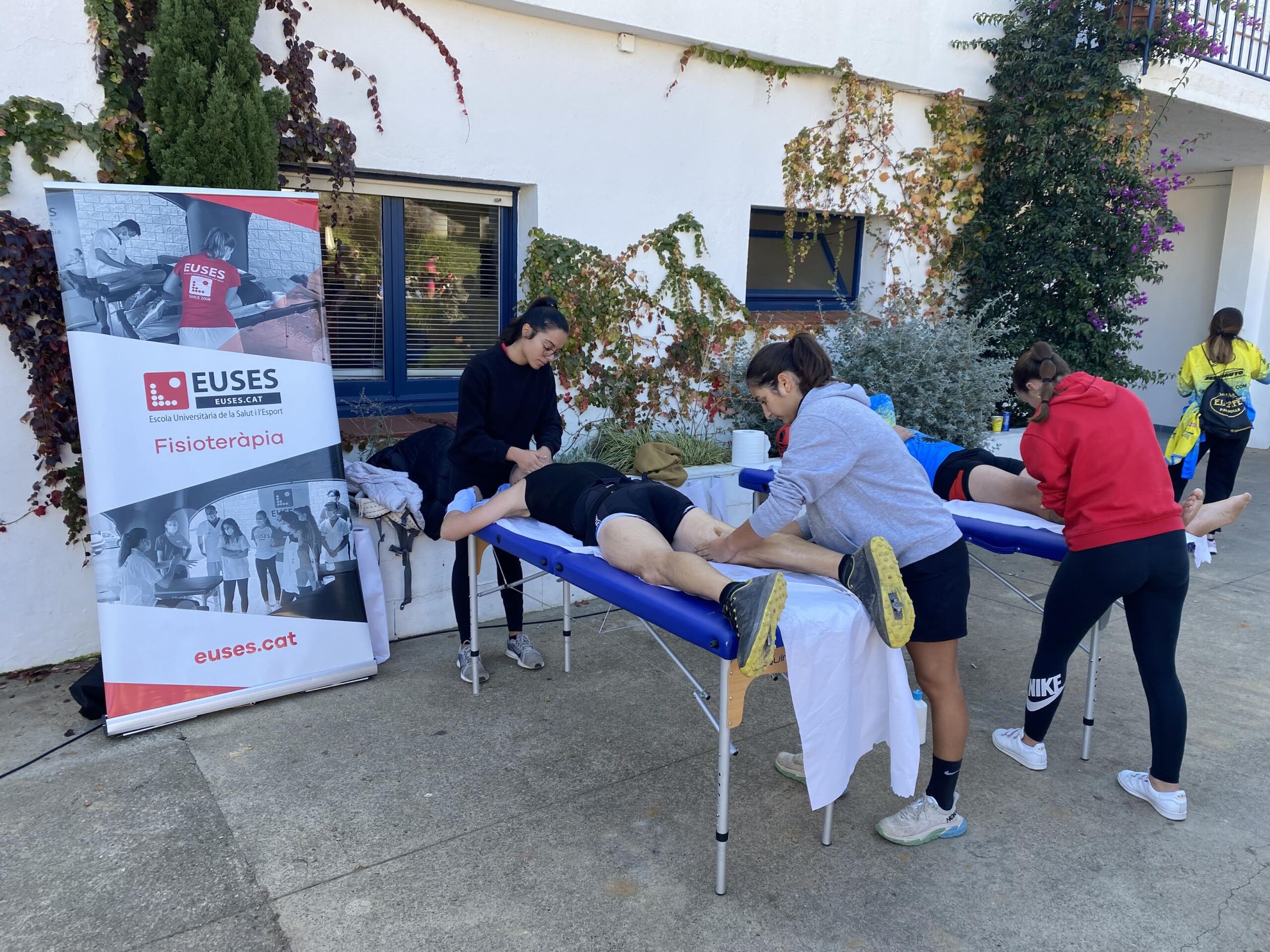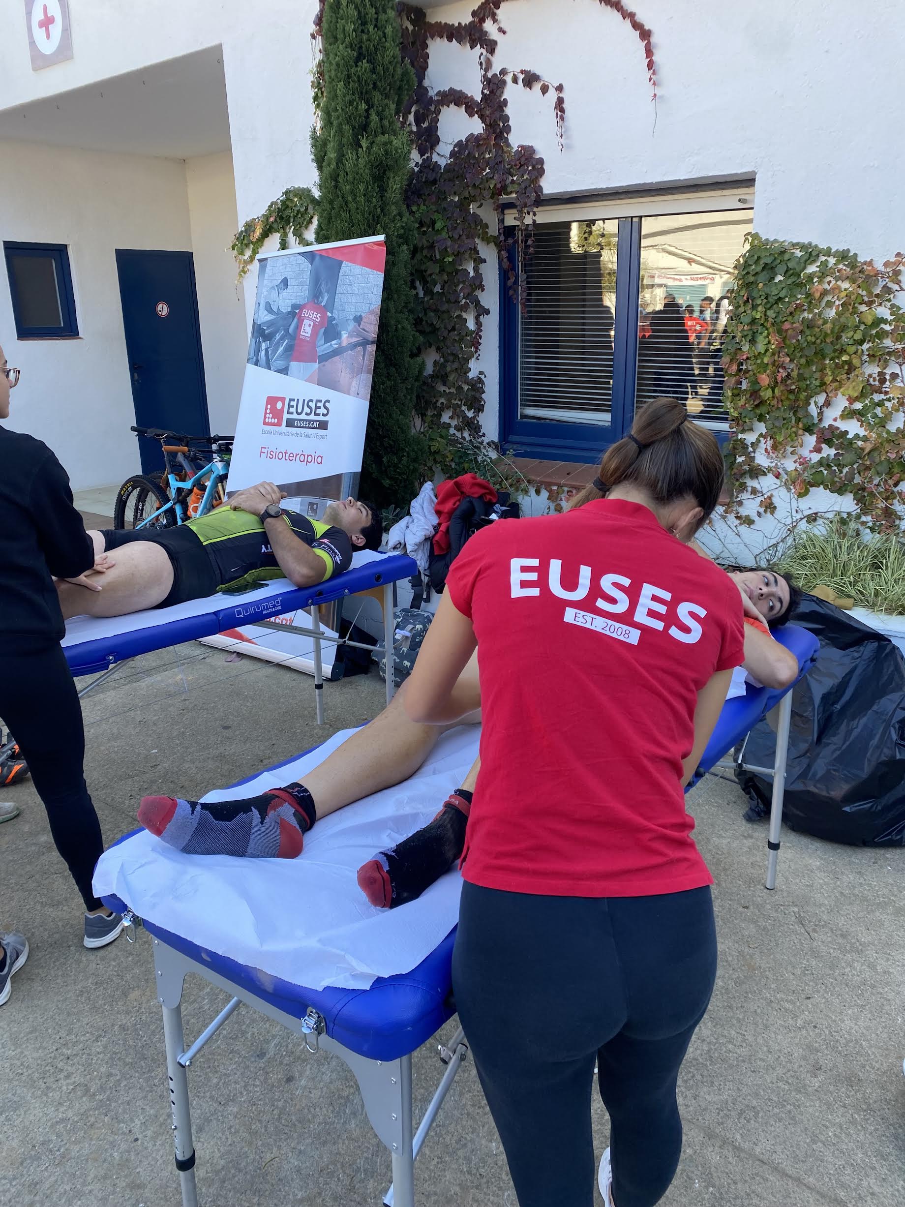 Aquest diumenge s’ha celebrat la “Corriols de l’Àvia 2023”, una prova de BTT amb sortida i arribada al Waterworld, a Lloret de Mar, i organitzada per la Penya Ciclista Lloret. L’Escola Universitària de la Salut i l’Esport hi ha col·laborat amb un servei de fisioteràpia al final de la cursa que ha estat tutoritzat per la fisioterapeuta d’EUSES Alumni Nerea Álvarez. Allà, tres estudiants del Grau en Fisioteràpia (Coralie Fosseries, Margot Bonnemason i Coralie Mejan) han realitzat tècniques de recuperació muscular (massatges i estiraments) als ciclistes. L’organització va dissenyar dos recorreguts: un de curt de 26 quilòmetres (desnivell de 700 metres) i un de llarg de 35 quilòmetres (1.100 metres de desnivell).